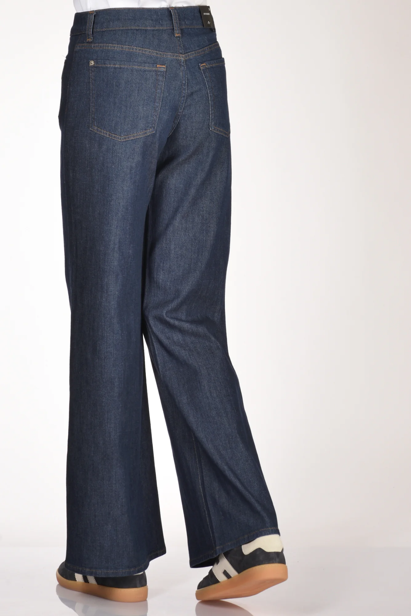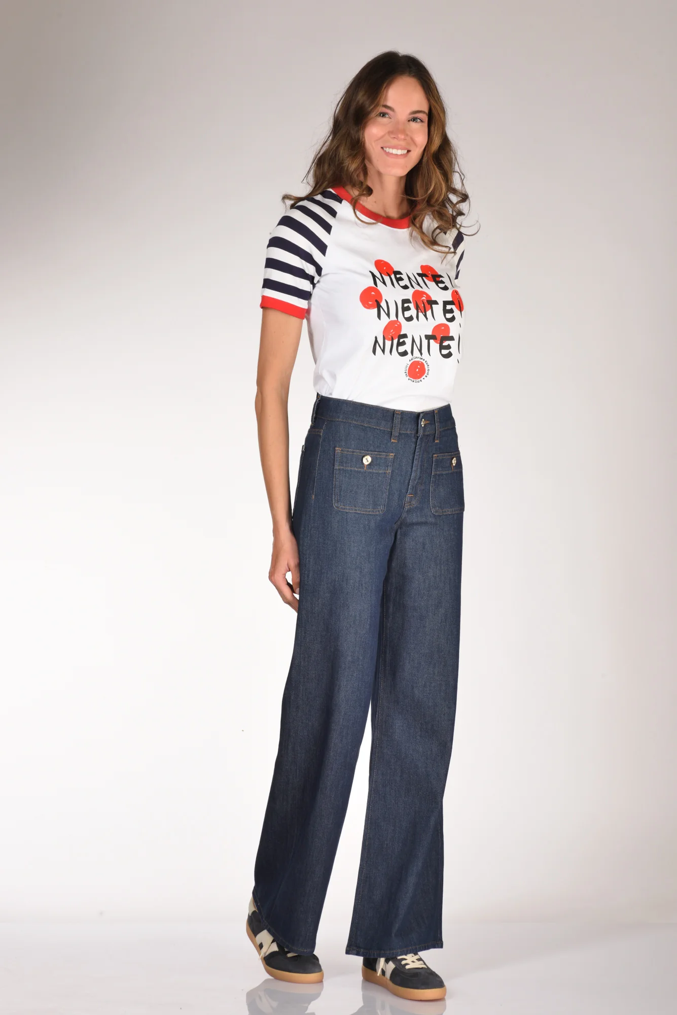 Jeans Gamba Larga, Vita Alta, Chiusi Da Zip E Bottone Logato, Tasche Frontali Applicate Con Bottone Logato, Vestibilita’ Regular, Made In Egitto, Composizione 48 Modal, 48 Cotone, 3 Poliestere, 1 Elastan