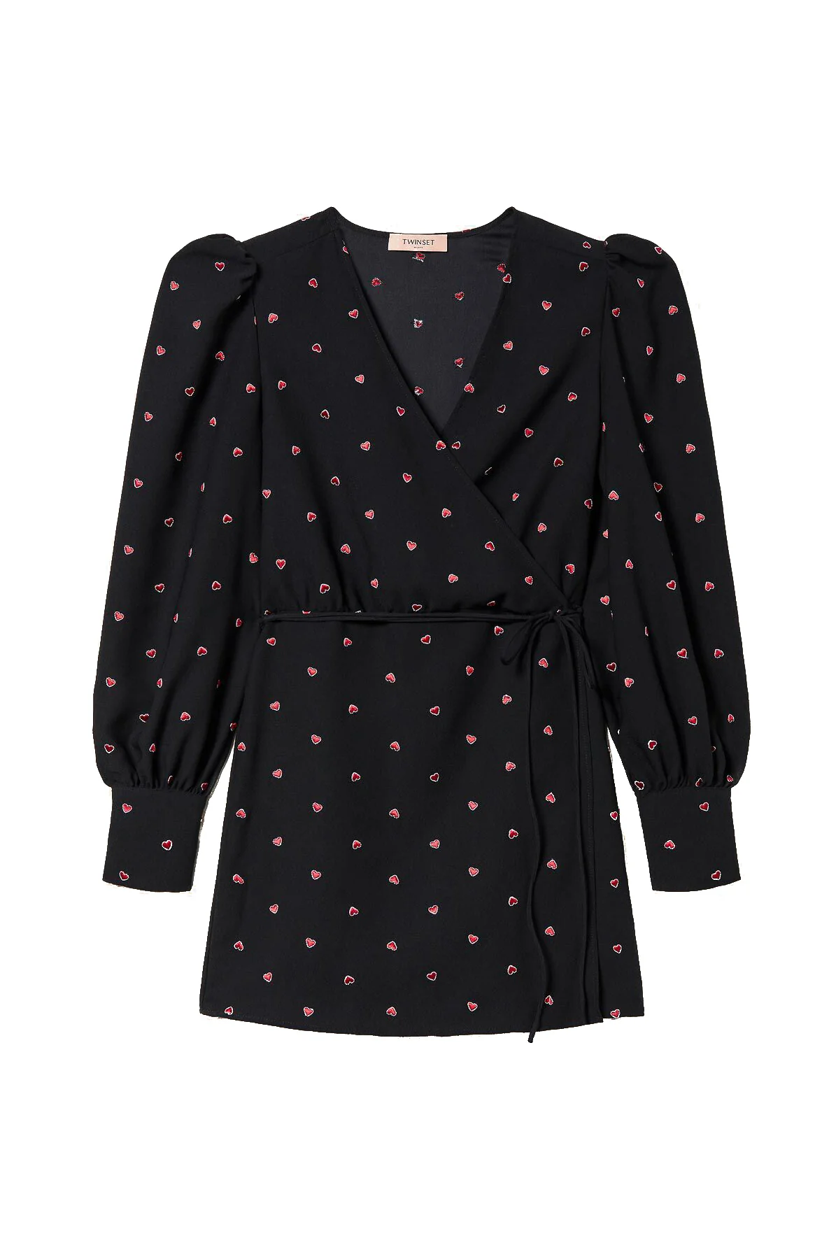 Un ricamo in perfetto stile Twinset prende vita sull’abito corto a portafoglio in crêpe di viscosa ricamato a filo in all over con piccoli cuori rossi profilati di bianco. Ha linea dritta, maniche lunghe morbide con spalle arricciate, polsi con bottoni, chiusura con cintura tubolare al fianco, placchetta logo Oval T sul retro, sfoderato. Con gioielli scenografici, collant ricamati e stivaletti per una serata importante.
