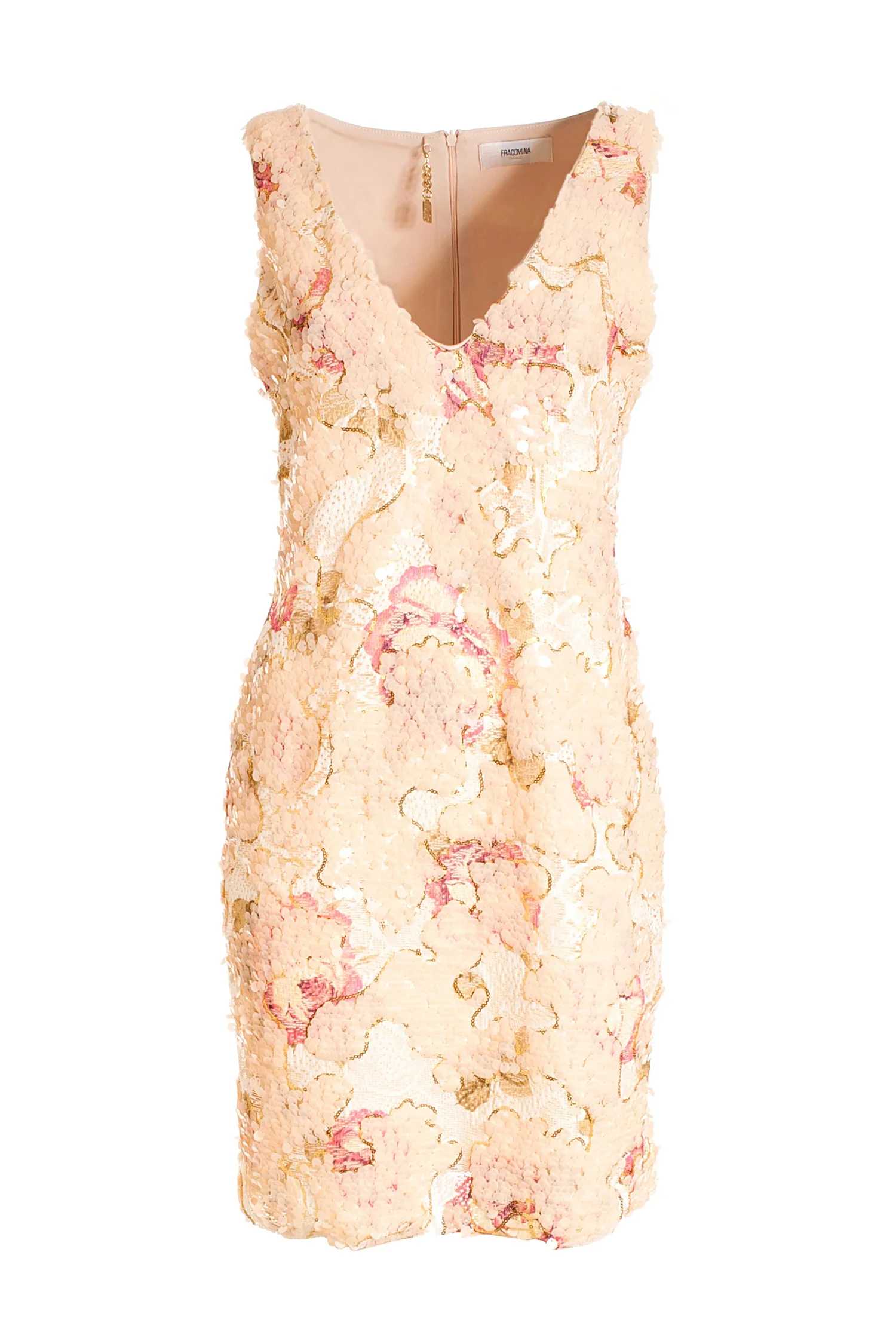 Abito a tubino slim mini con paillettes luminose, scollo a V, zip sul retro per apertura, e senza maniche.