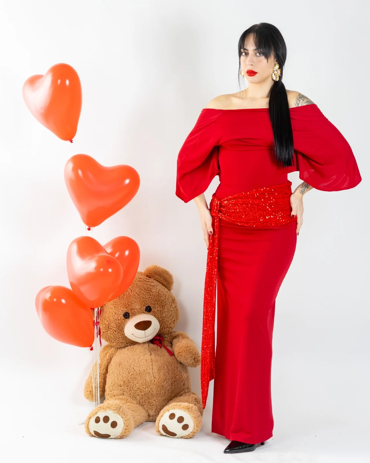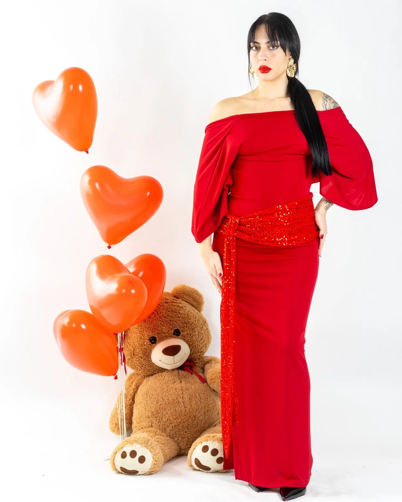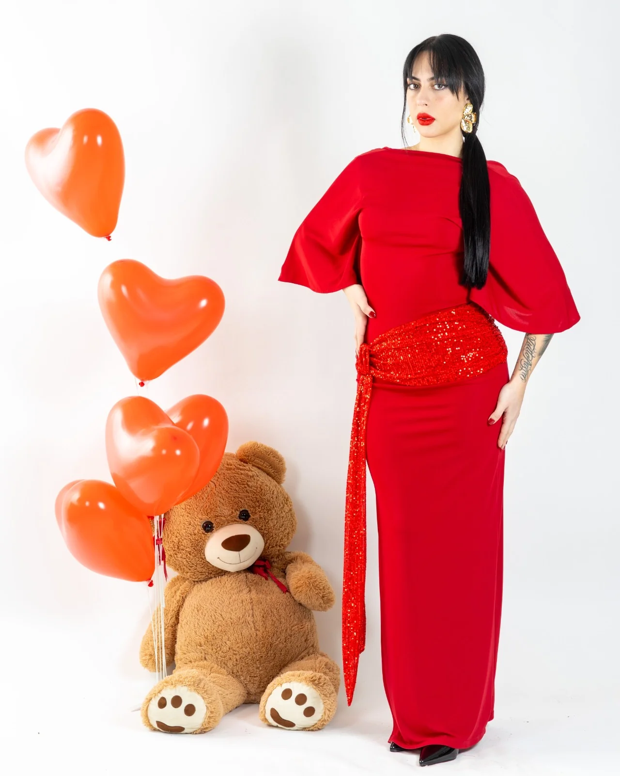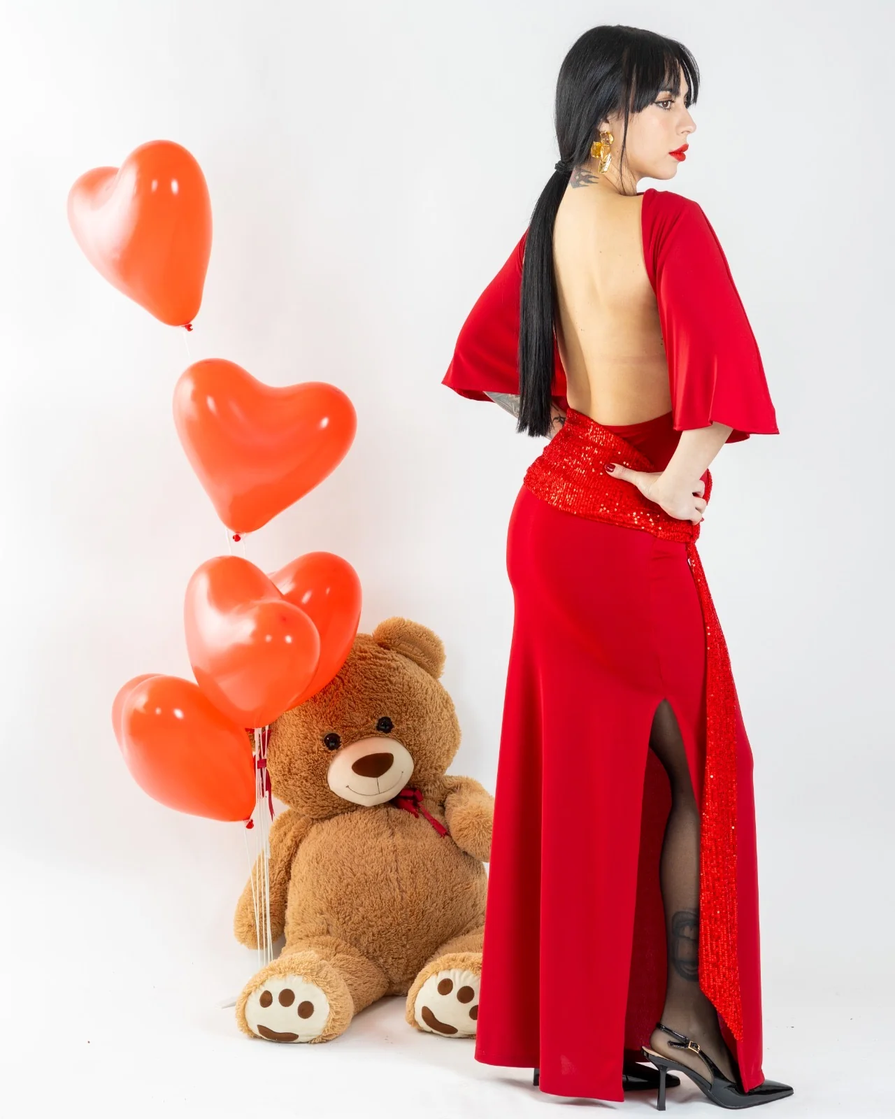 Abito lungo con collo attillato.Presenta maniche tre quarti.Dettaglio strascico con nodo in paillettes.Spacco laterale e scollo posteriore.Vestibilitร regolare.