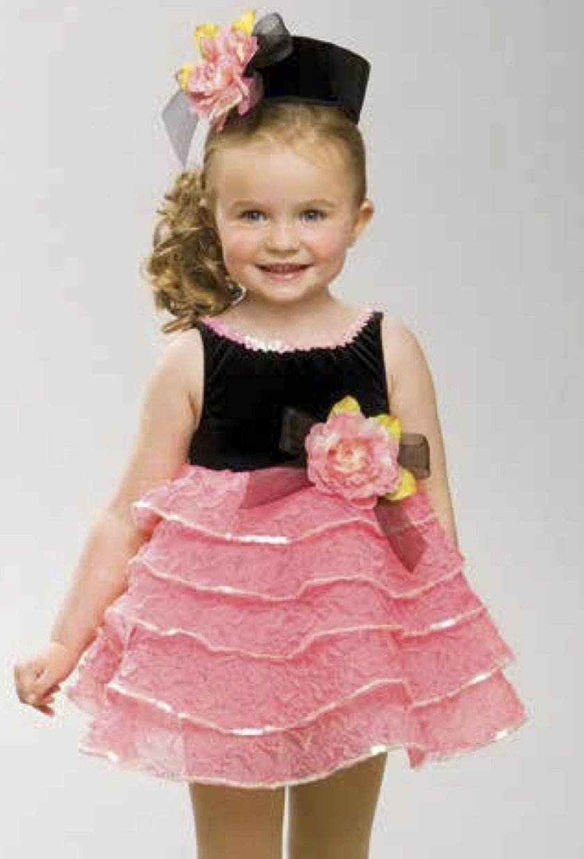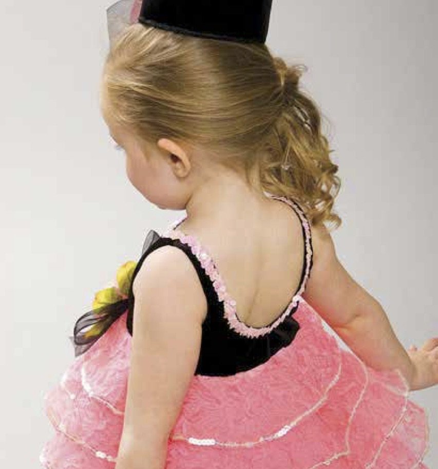 Body in velluto stretch con pantaloncini in spandex rosa, decorazione floreale sul davanti e paillettes al collo. Cucita al body, la gonna a balze in organza è bordata con paillettes scintillanti.