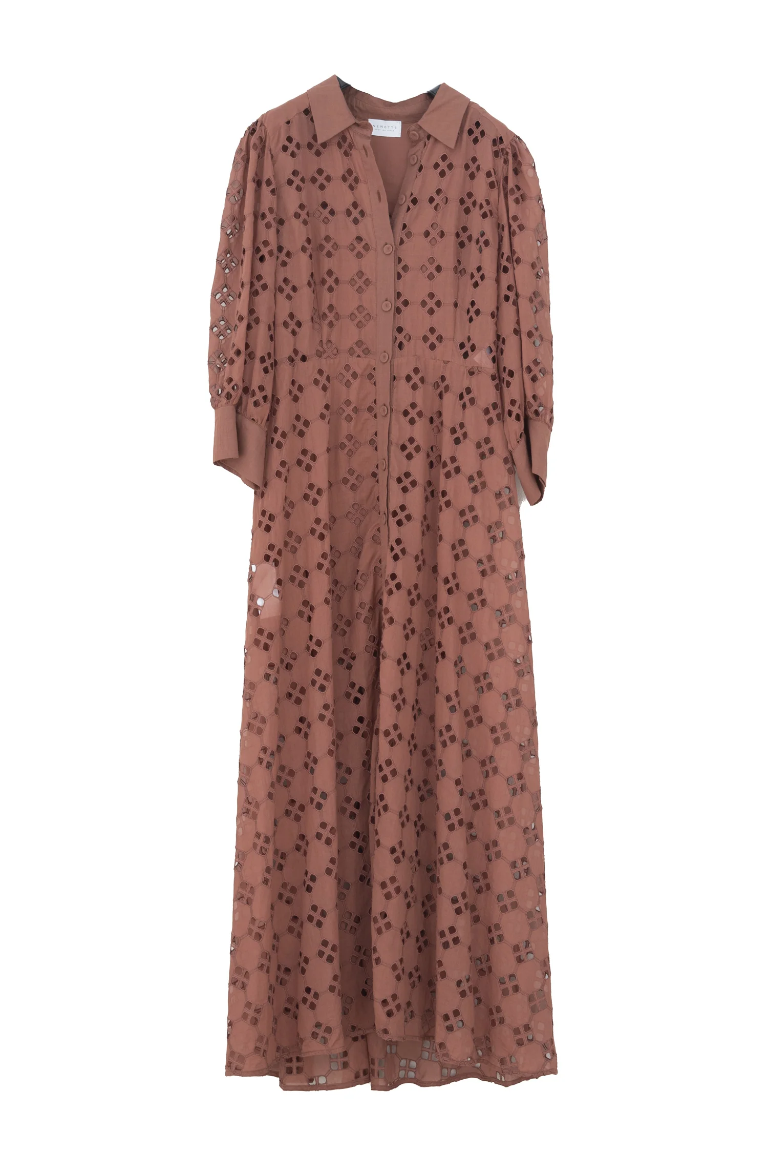 Codice Prodotto: 33TJ-AGATA-0604 Dettagli:• Abito lungo in sangallo• Cacao• Chiusura con bottoni sul davanti• Colletto classico• Maniche lunghe con polsino• 100% cotone Vestibilità:Regolare