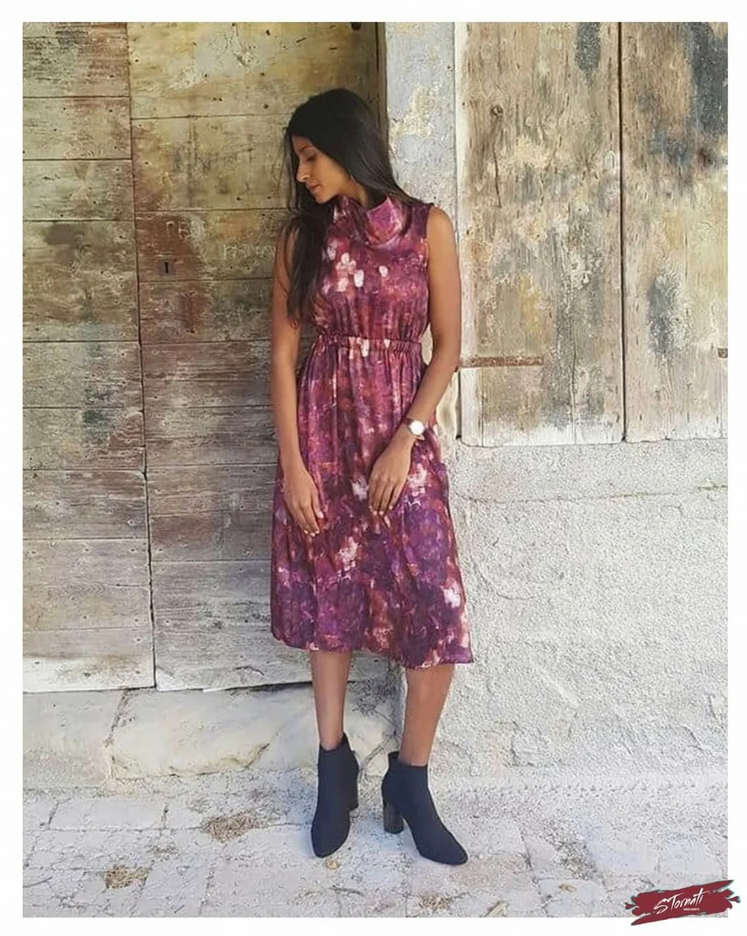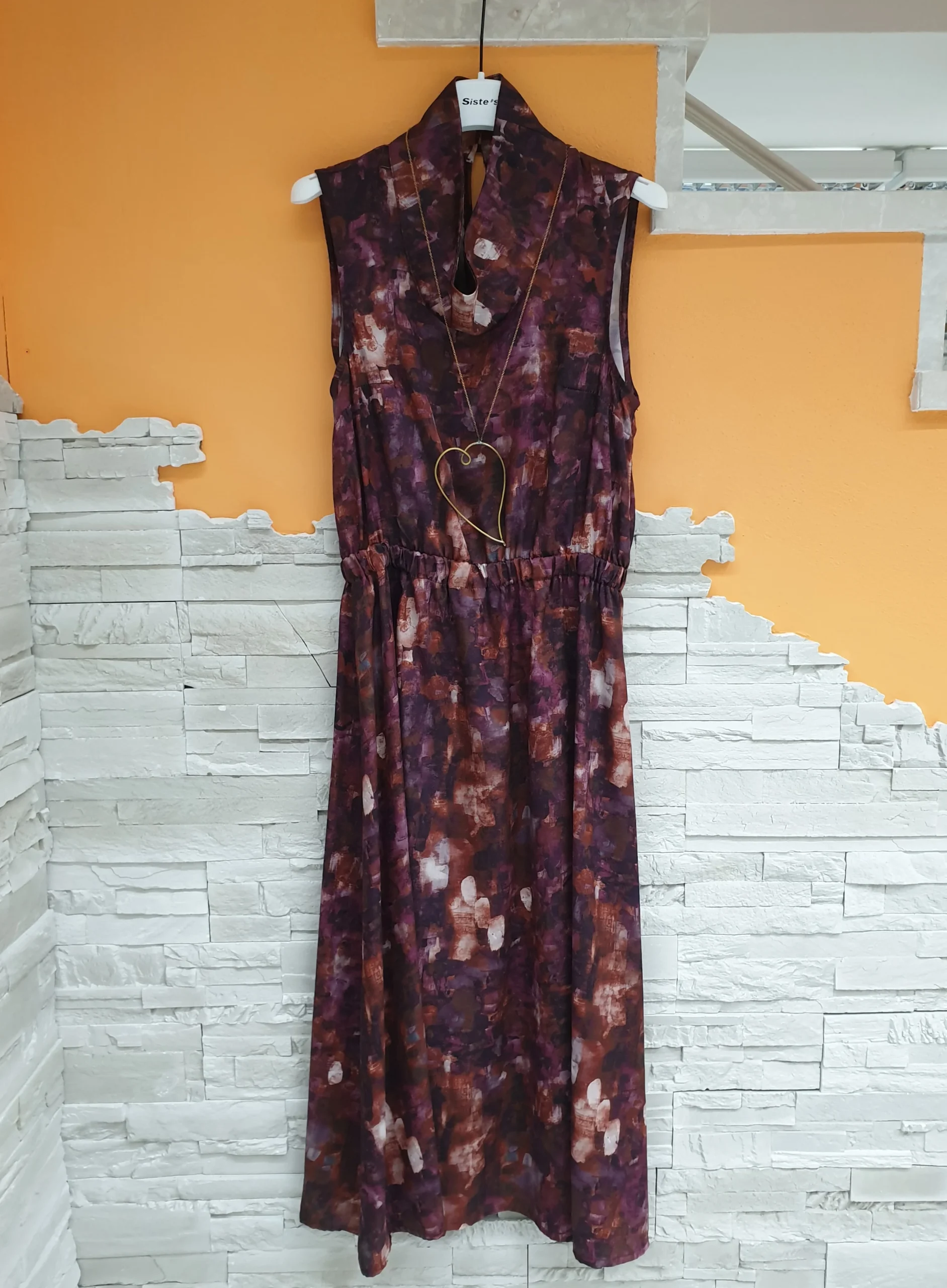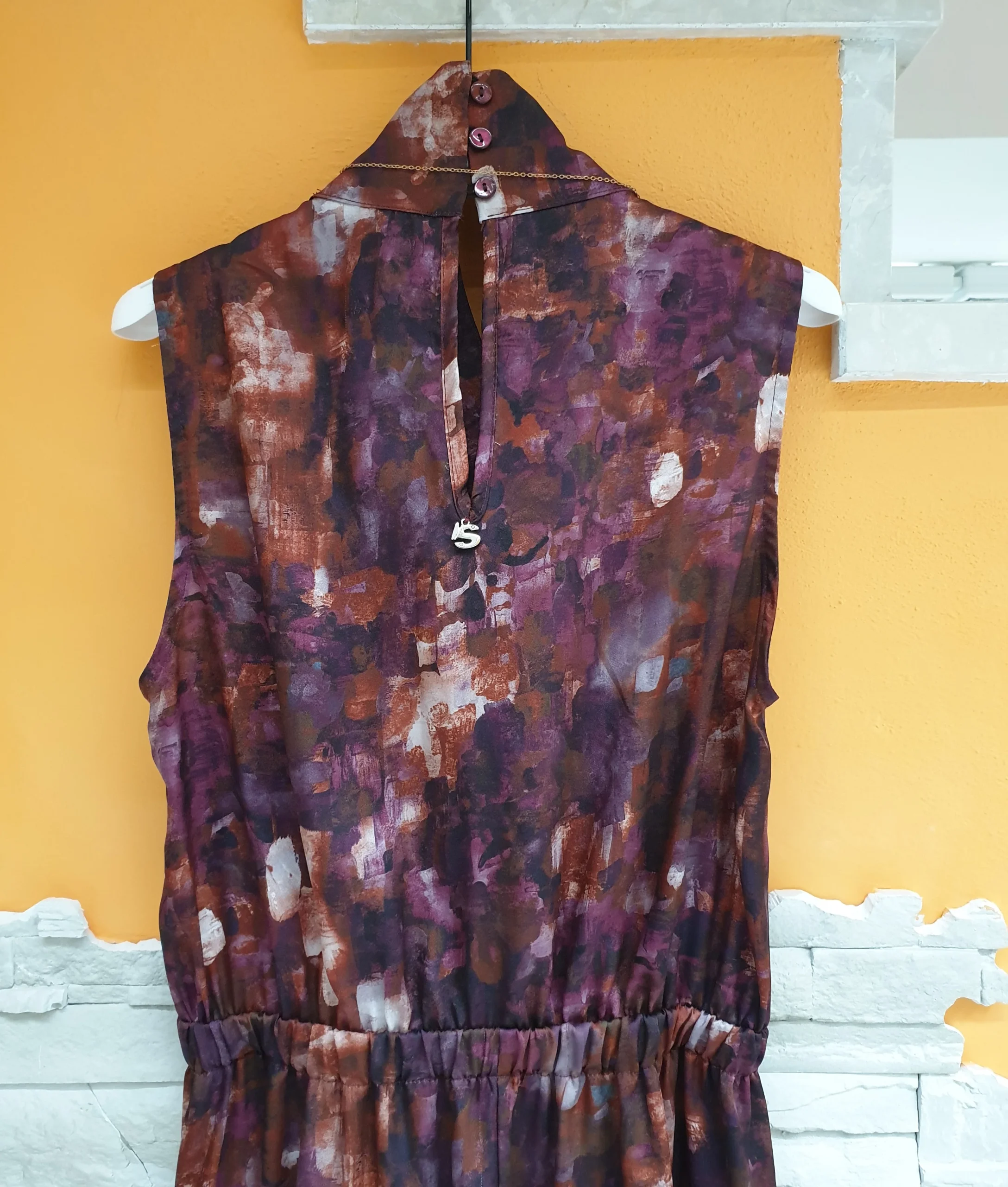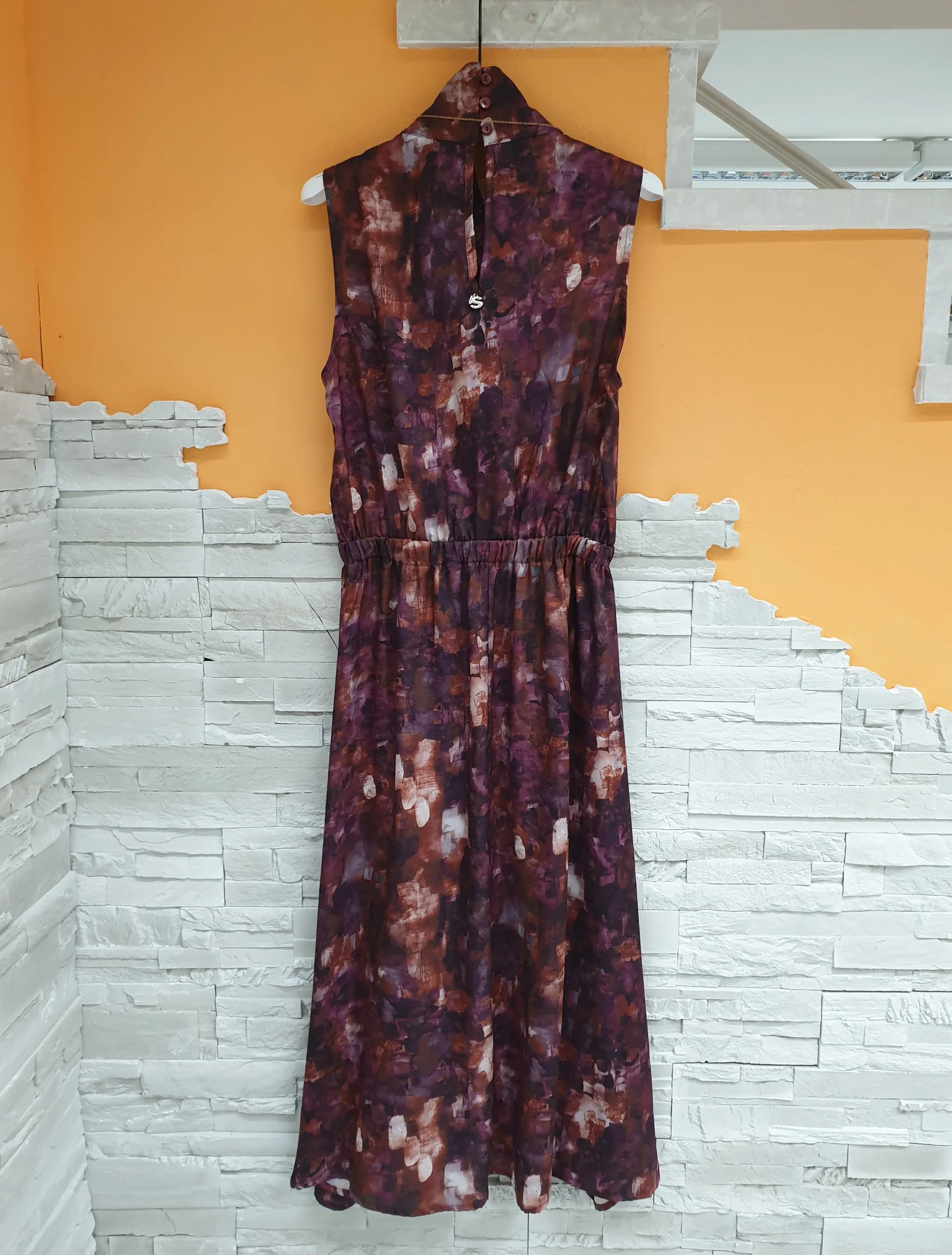 Abito raso lunghezza midi fantasia acquarelle ciclamino. Collo alto con bottoncini sul retro, spalla larga e arricciatura in vita. Composizione: 100% Poliestere MADE IN ITALY
