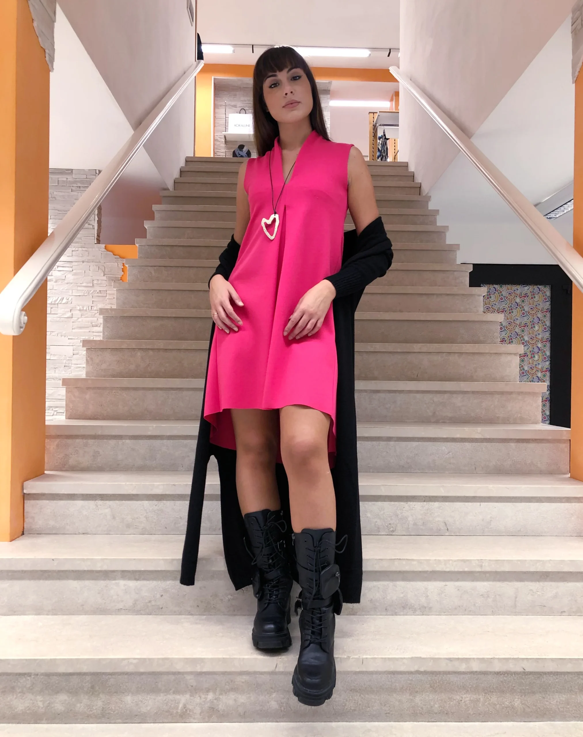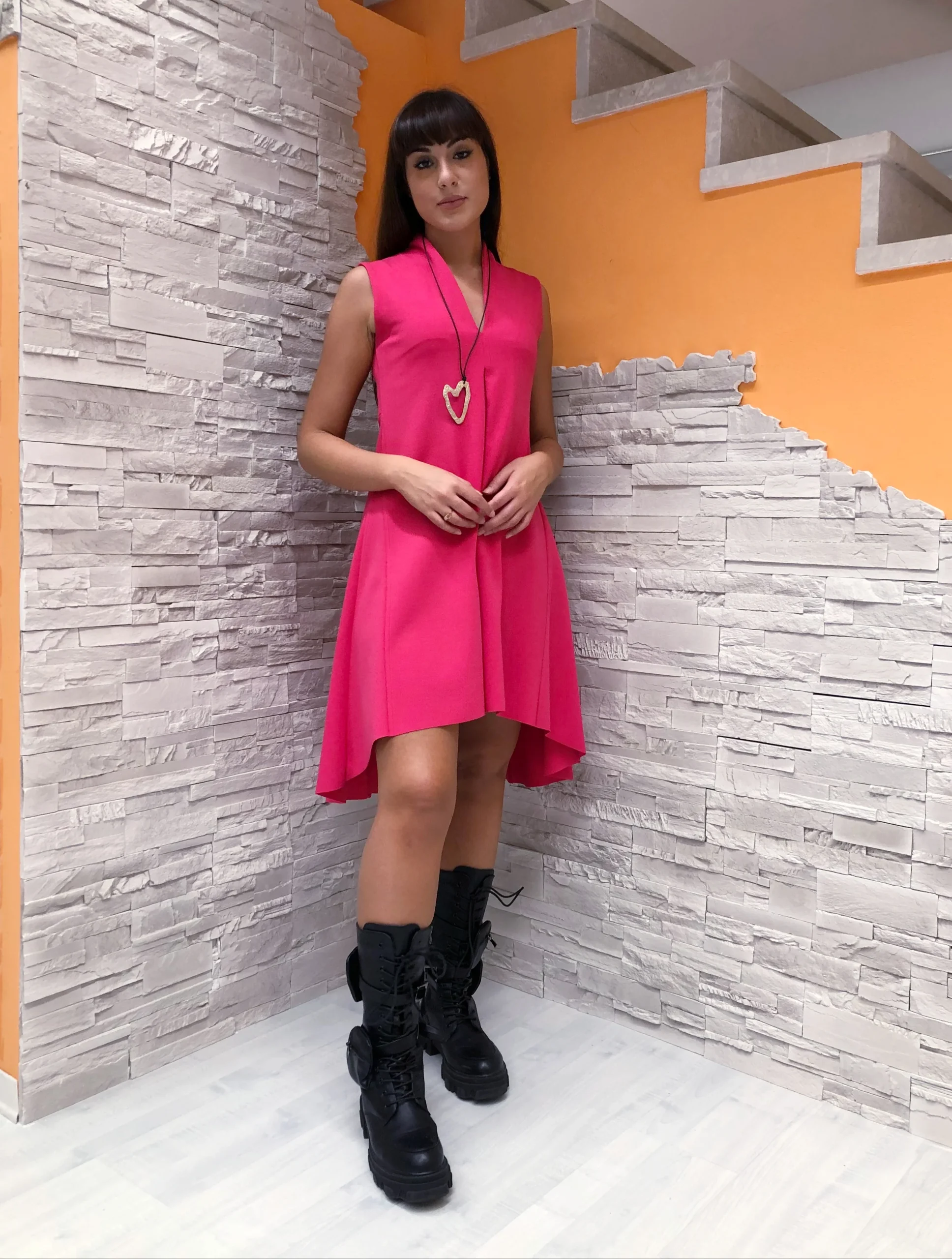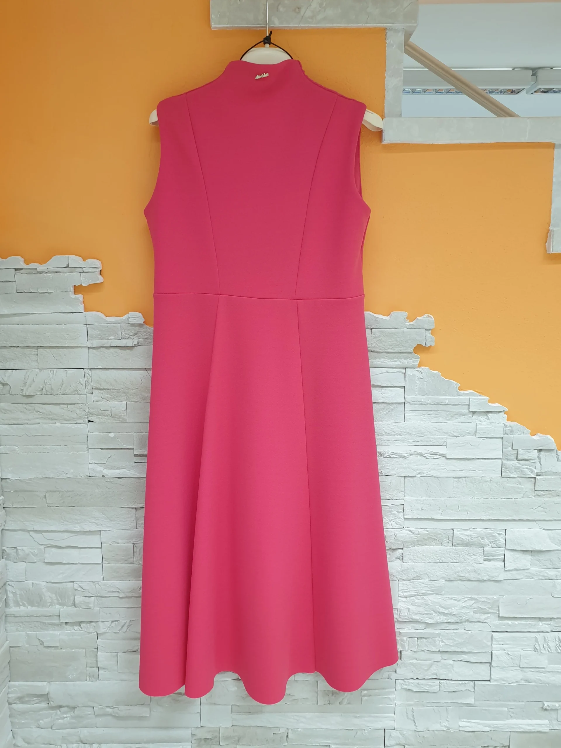 Abito lampone scollo V con colletto a vulcano, sfondo frontale e orlo coda stondata. Articolo con collana. Composizione: 95% Poliestere 5% Elastam MADE IN ITALY