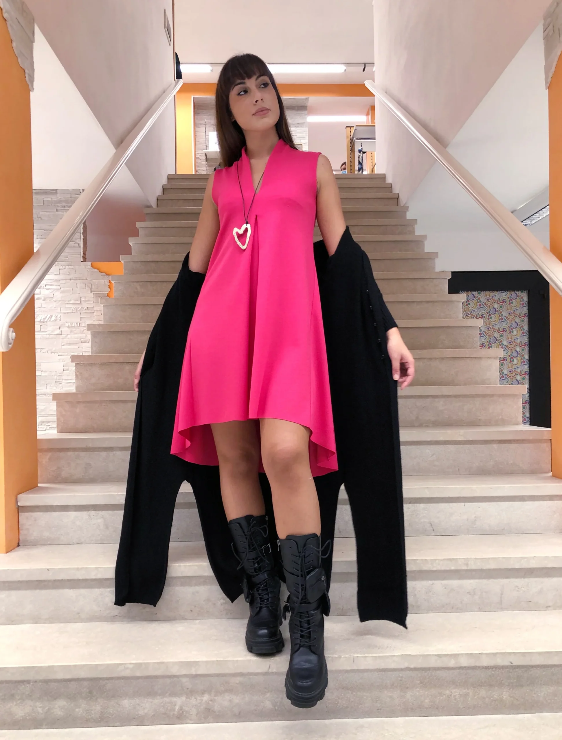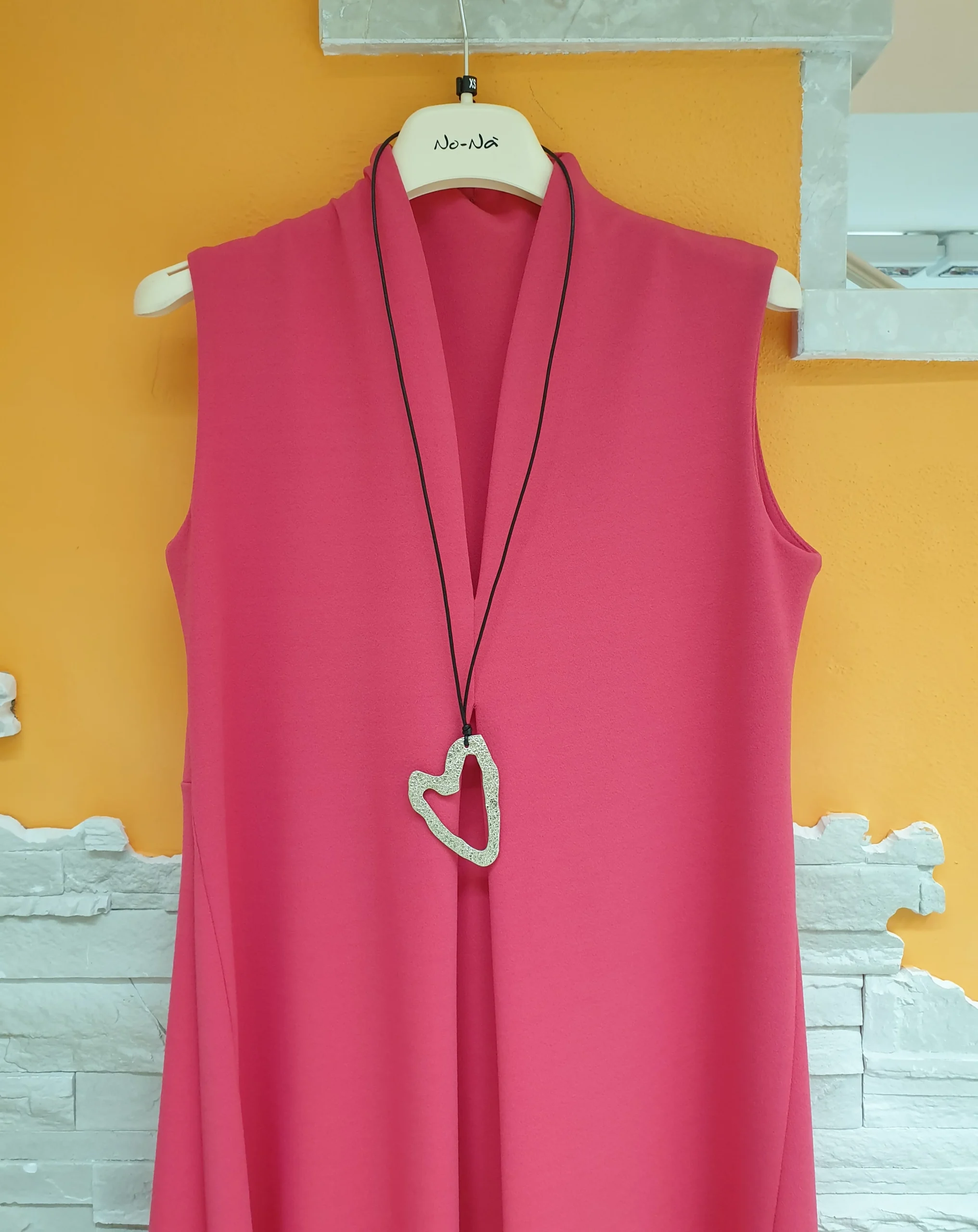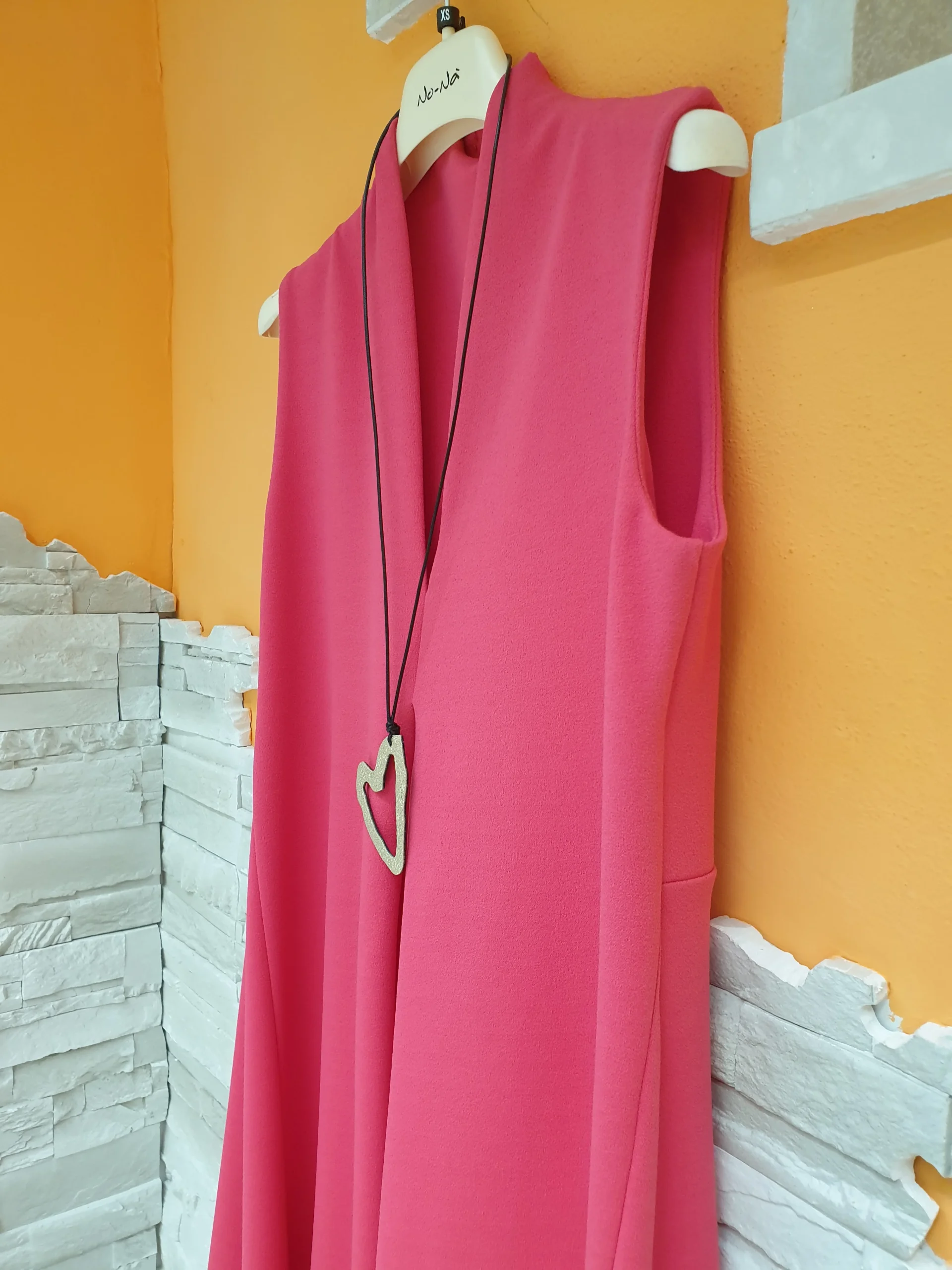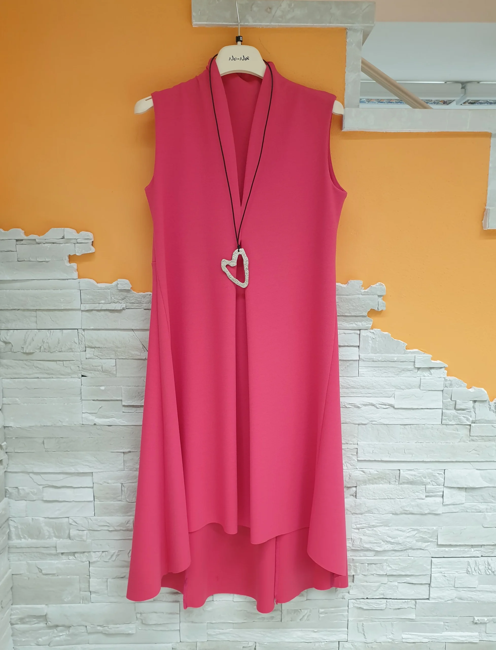 Abito lampone scollo V con colletto a vulcano, sfondo frontale e orlo coda stondata. Articolo con collana.