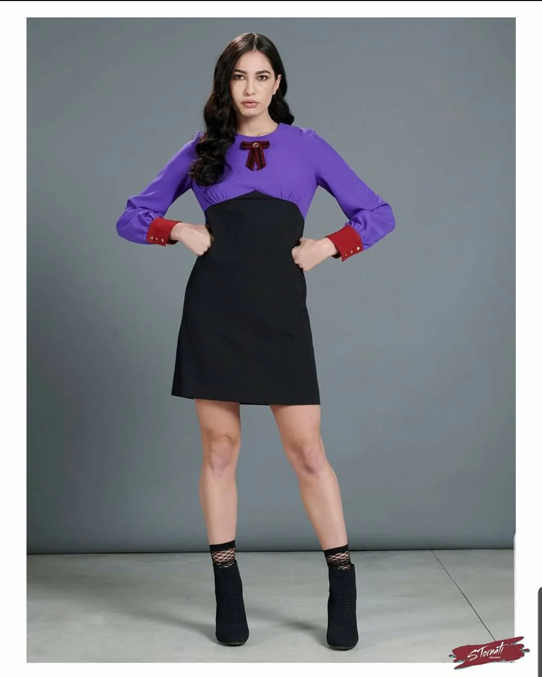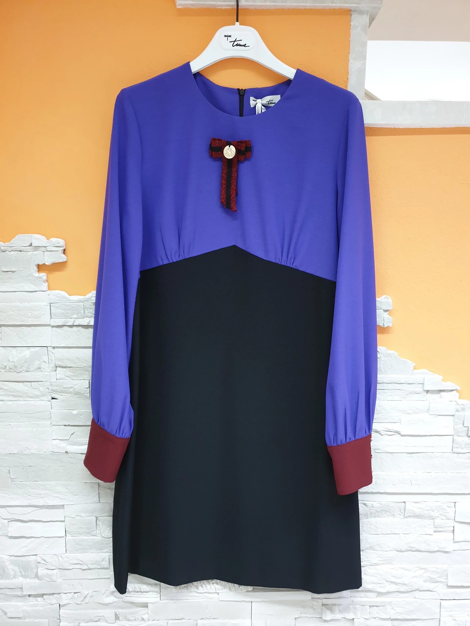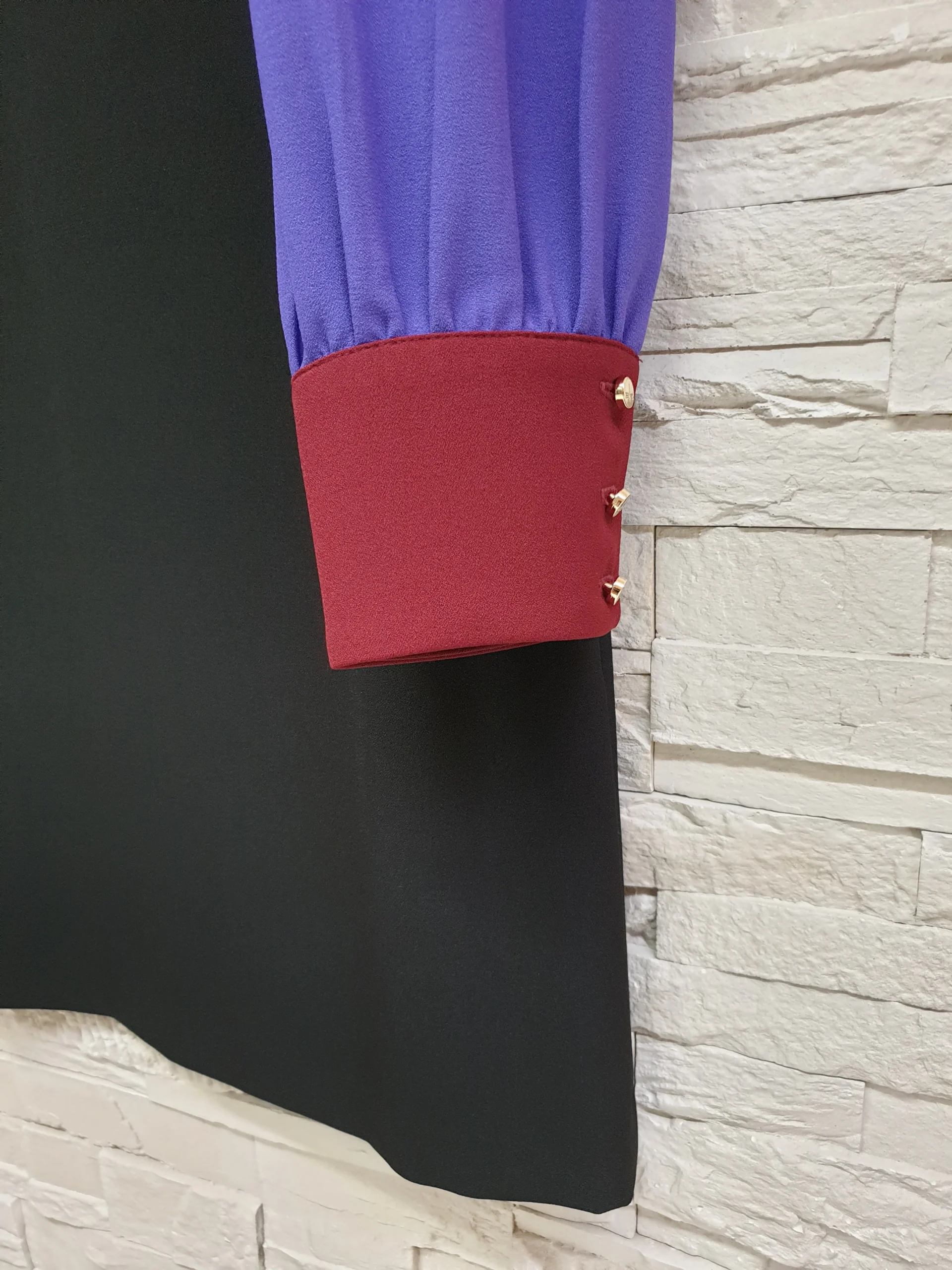 Abito leggermente svasato color block nero, viola, vino. Scollatura girocollo, maniche lunghe a camicia con polsino e fiocco effetto spilla cucito.