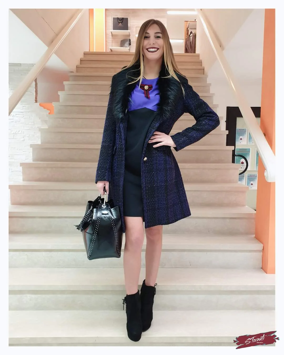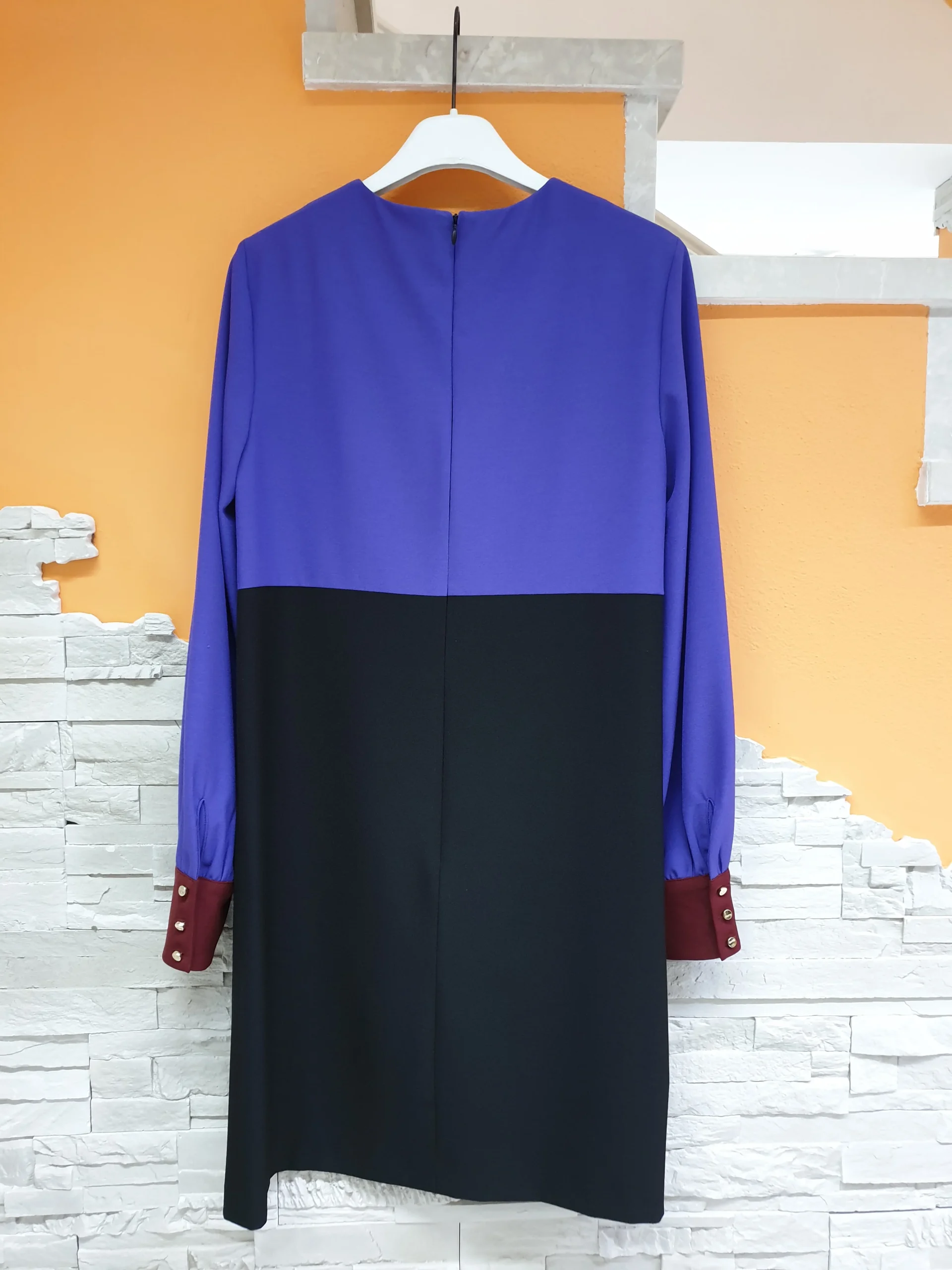 Abito leggermente svasato color block nero, viola, vino. Scollatura girocollo, maniche lunghe a camicia con polsino e fiocco effetto spilla cucito. Composizione: 97% Poliestere 3% Elastan MADE IN ITALY