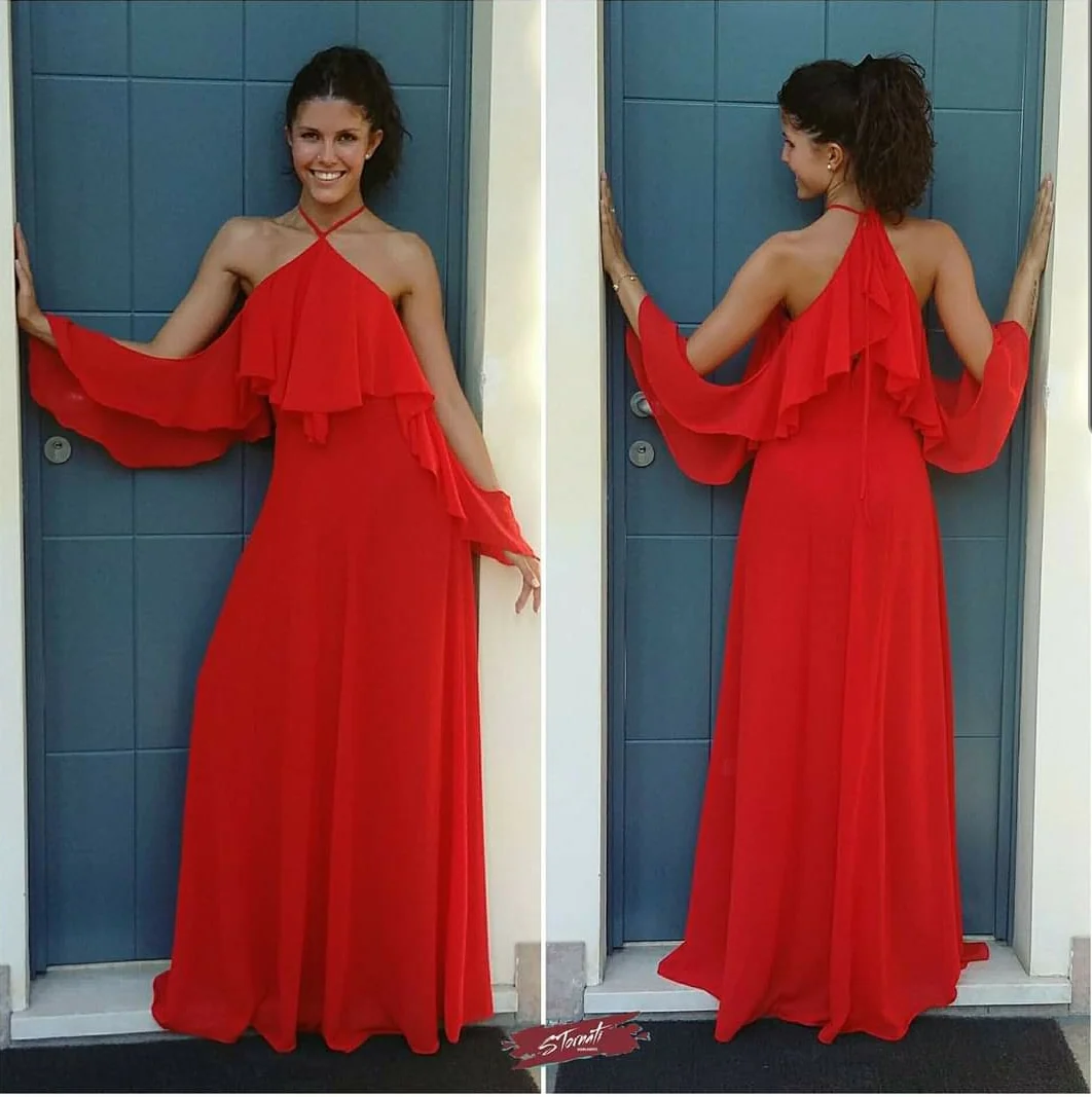 Abito lungo voile dettaglio maniche volant con apertura braccia. Abito con spallini al collo, corpetto con volant e gonna svasata. Chiusura con zip e gancetto sul retro, completamente foderato. >>La modella in foto indossa la tg. XS Composizione: 100% Poliestere MADE IN ITALY