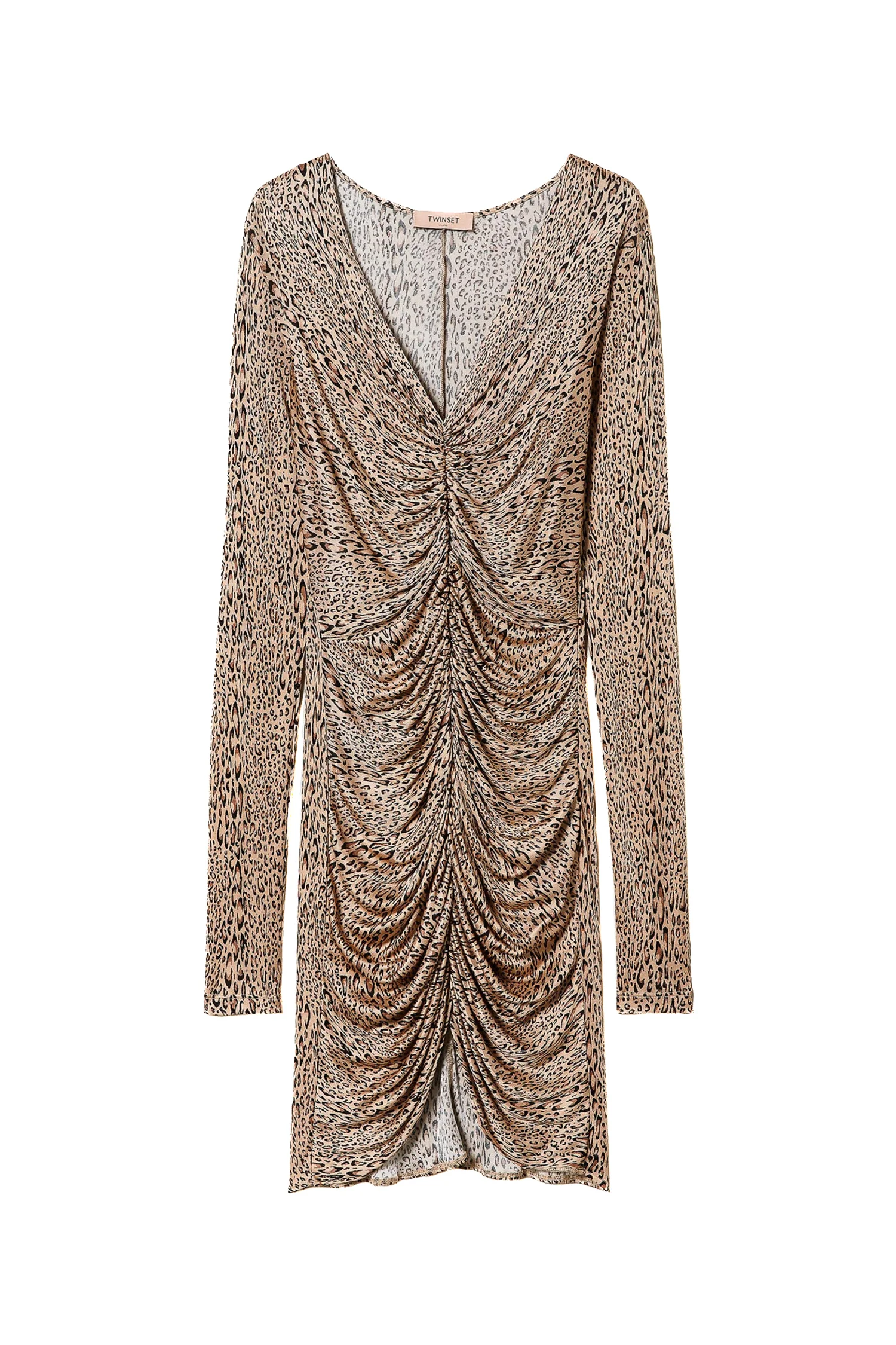 Abito corto in jersey di viscosa a stampa animalier con drappeggio davanti, maniche a guanto, linea fitted.