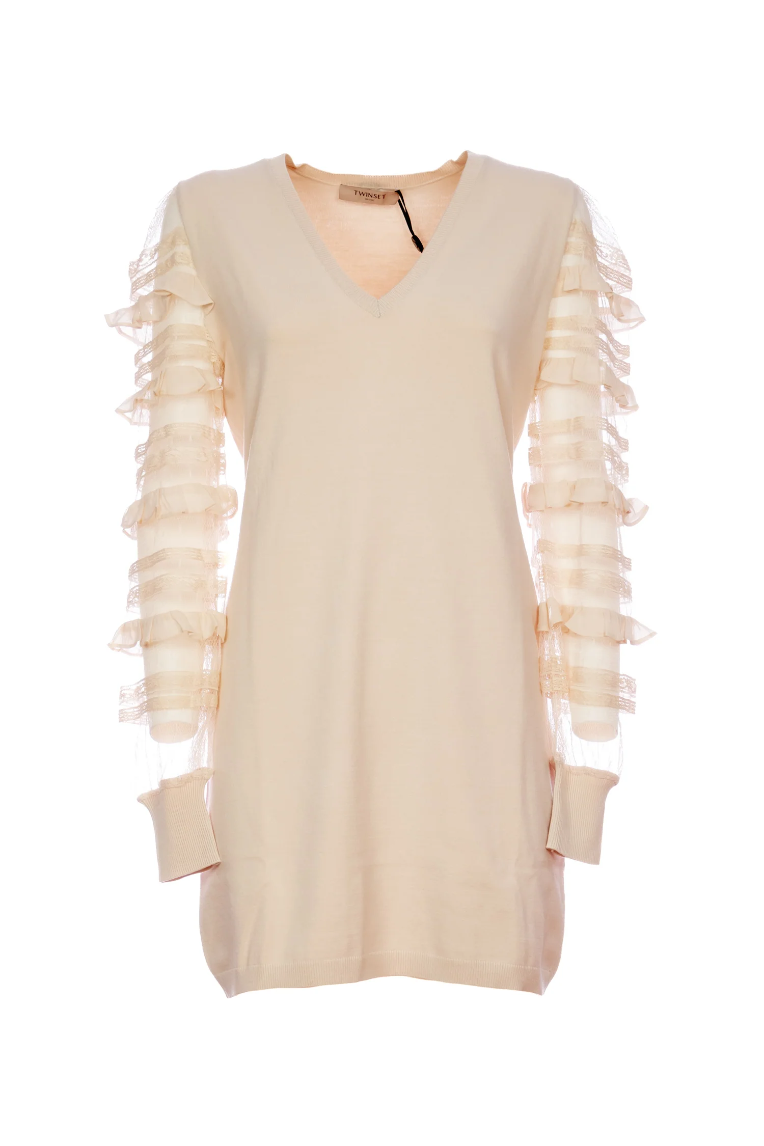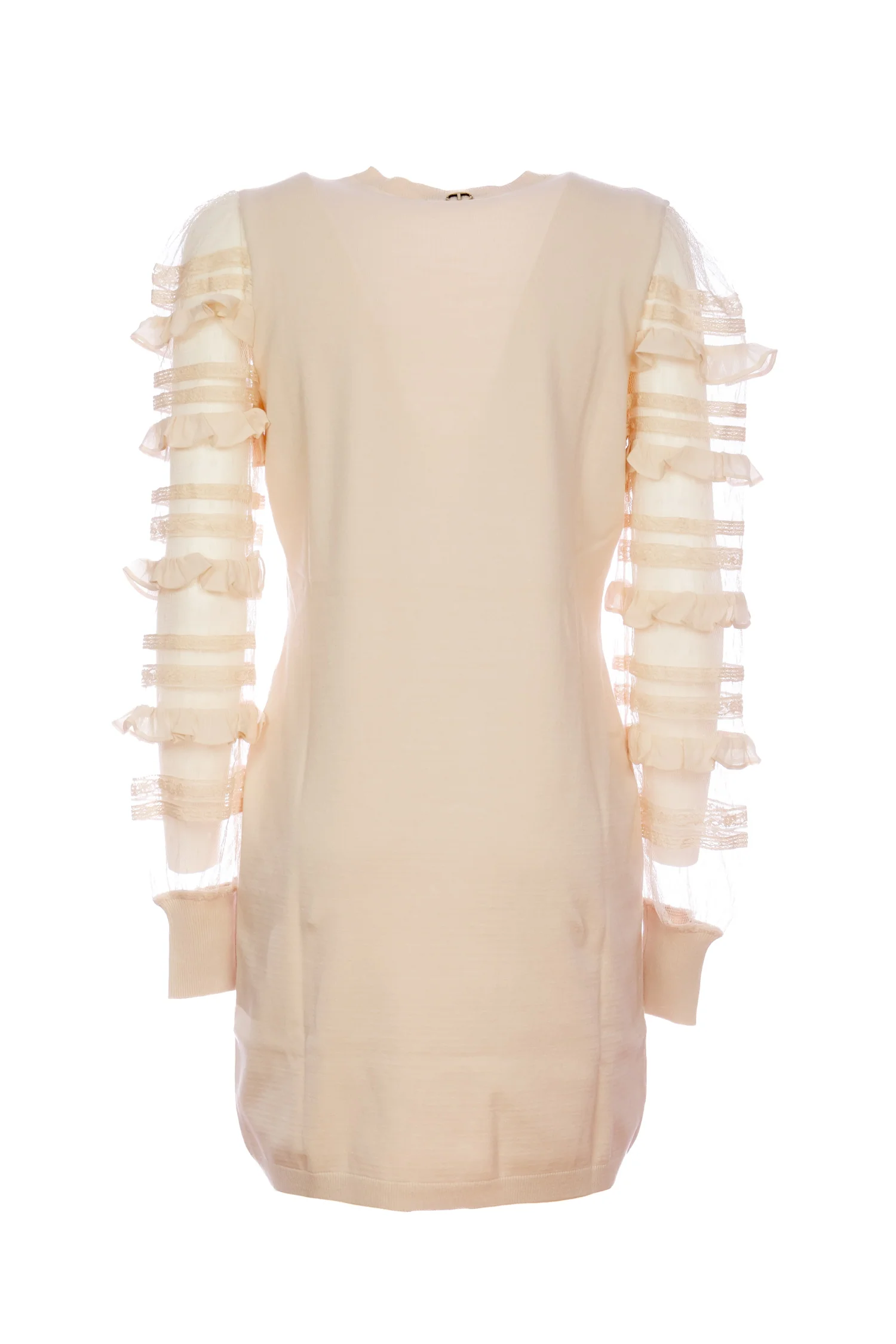 Codice Prodotto: 241TP3530-00018 Dettagli:Abito corto in maglia, scollo a V, maniche lunghe in tulle con volant, polsi a costine.• Avorio• Questo abito ha una linea dritta. • 60% viscosa 25% poliestere 15% elastan. Materiale 2: 100% poliestere. Materiale 3: 100%. poliammide• Non trattare con cloro, Non usare asciugatrice, Lavare a secco, Stirare a rovescio Vestibilità:Regolare
