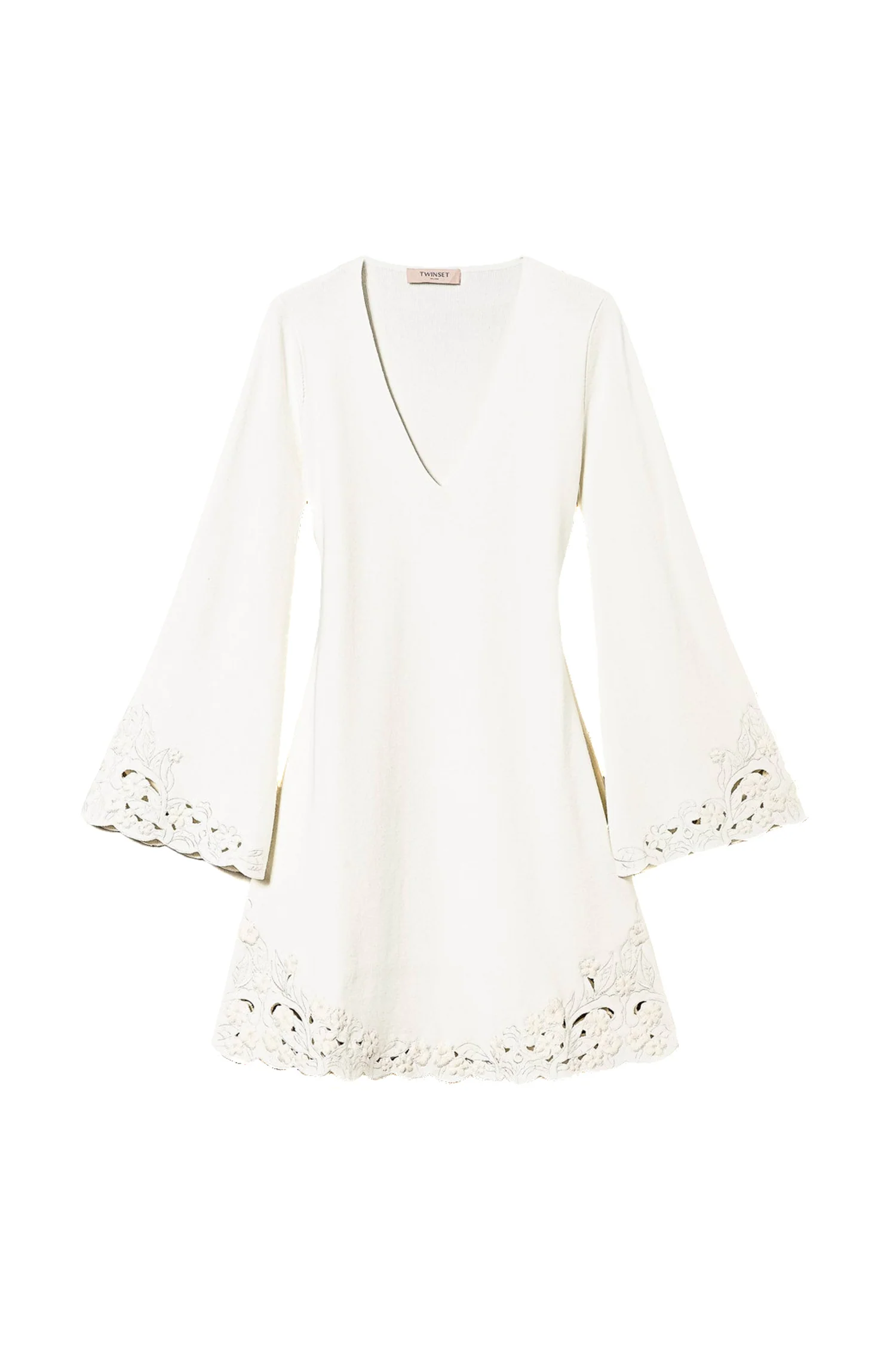 Abito corto in maglia di viscosa stretch con scollo a V e fondi rifiniti da ricami piazzati effetto sangallo.