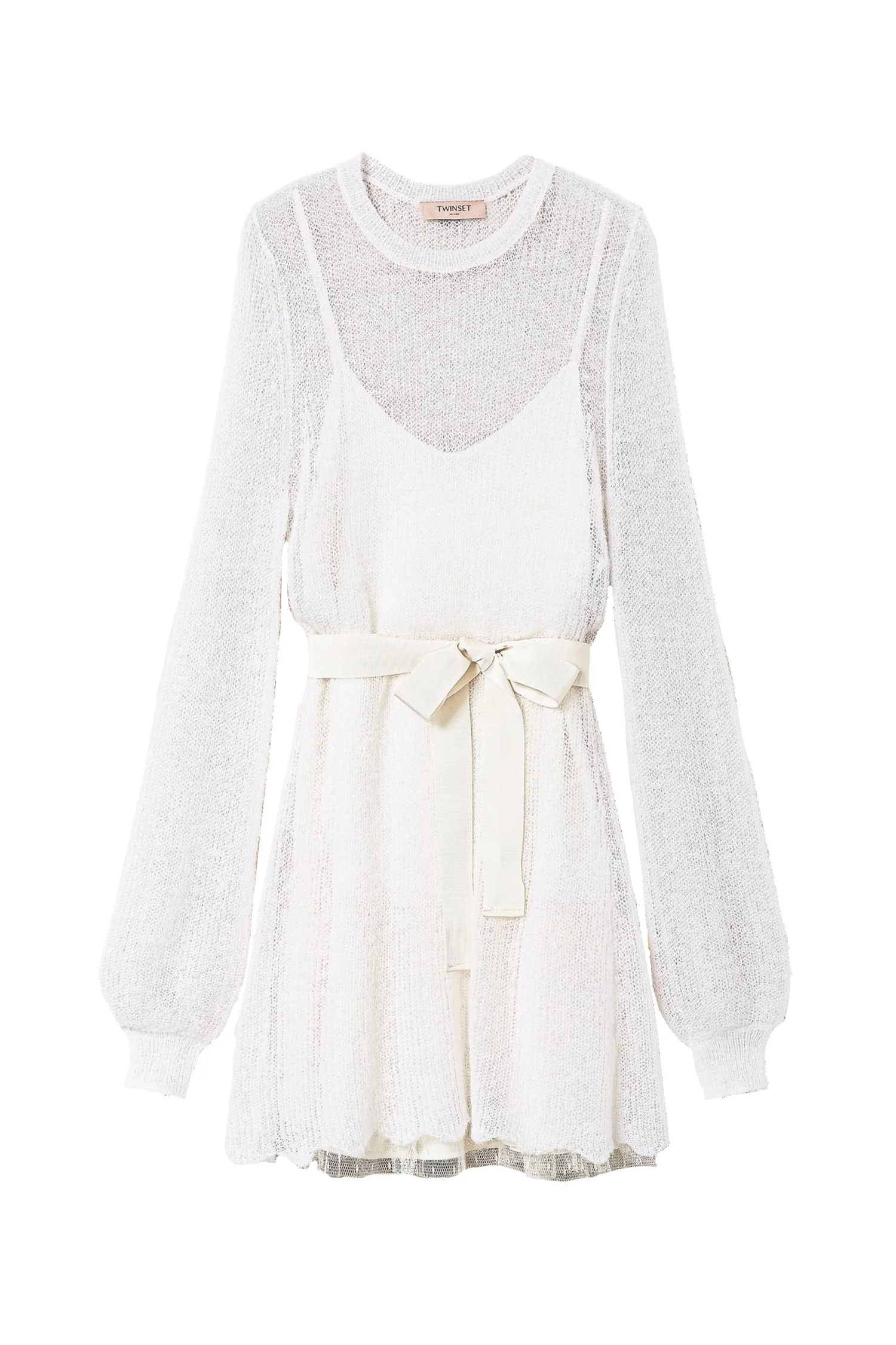 Abito in maglia di lana e mohair con smerlo al fondo e cintura in vita, abbinato a sottoveste in crêpe de Chine.