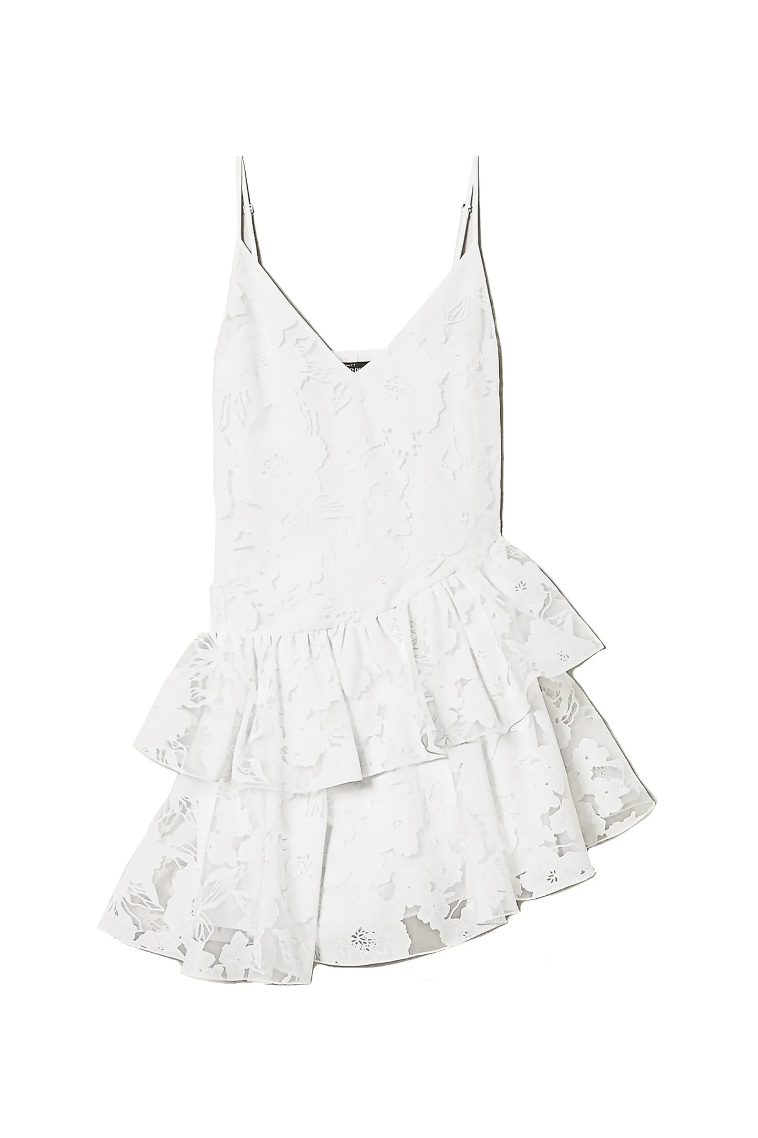 Abito corto collezione Actitude in organza fil coupé a motivo floreale. Ha scollo a V, spalline sottili regolabili, gonna con balze asimmetriche leggermente arricciate, fodera e linea svasata.