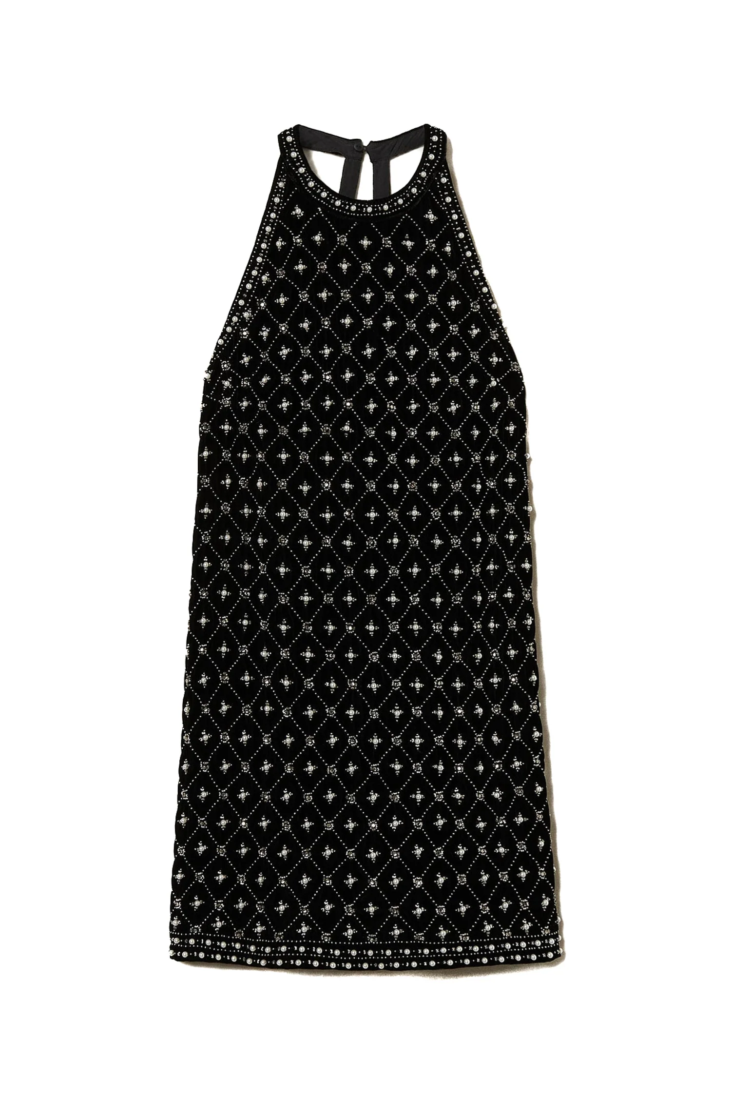 Abito corto halter nero in velluto ricamato con perle