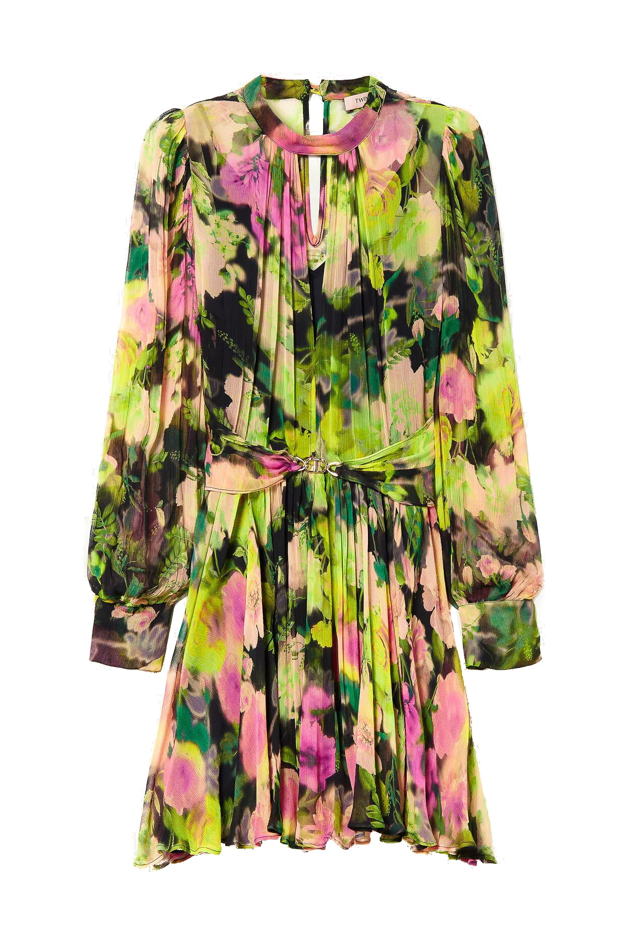 Abito corto in creponne a fiori multicolor con fusciacca cucita in vita con morsetto Oval T, sottoveste abbinata.