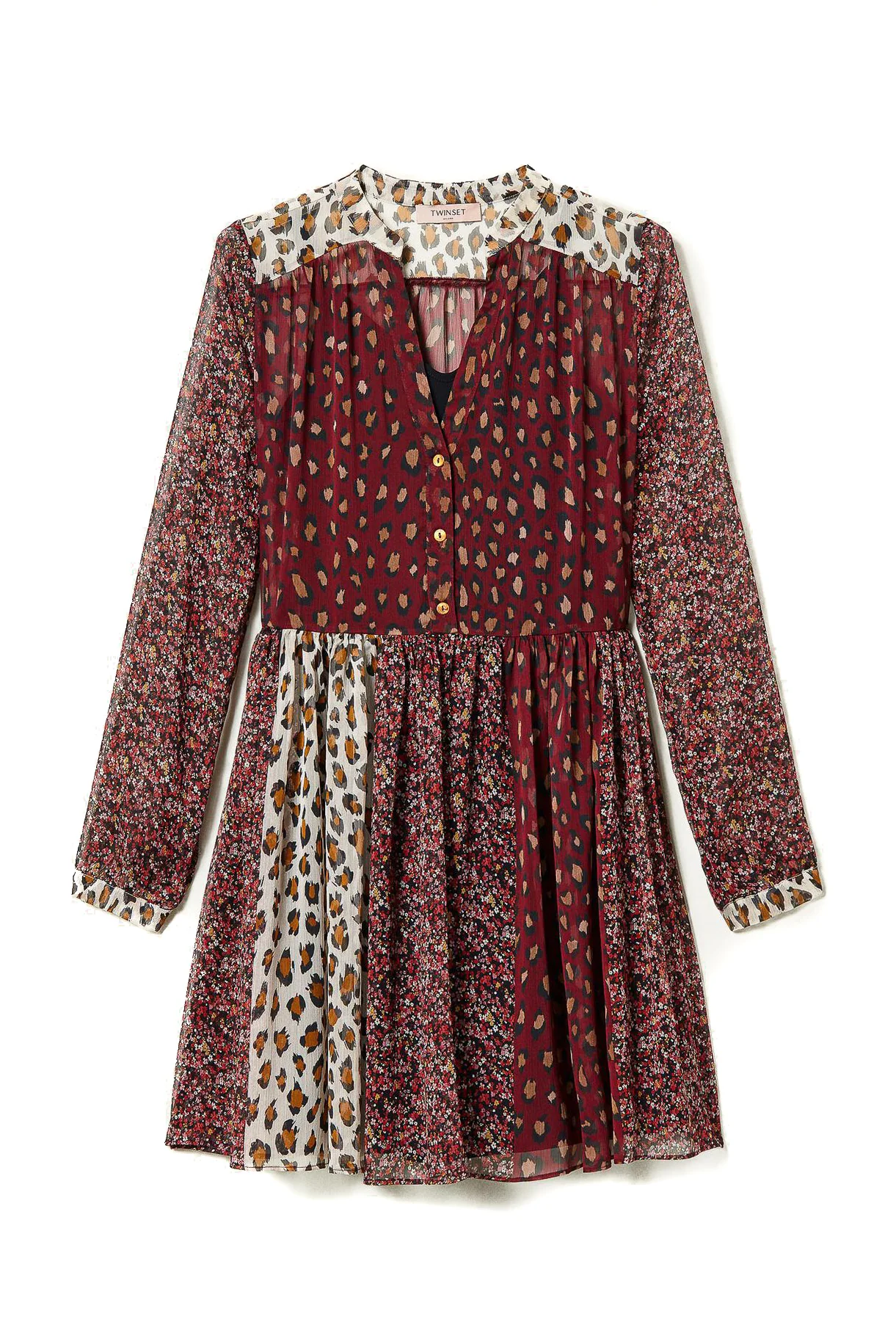 Patchwork di fiori e animalier per l’abito corto chemisier in creponne italiano leggero con stampa esclusiva firmata Twinset. Ha collo alla coreana, bottoni in madreperla, cintura abbinata in tessuto, sottoveste in crêpe de Chine stretch. Aggiungi stivali alti e tote per completare il look.