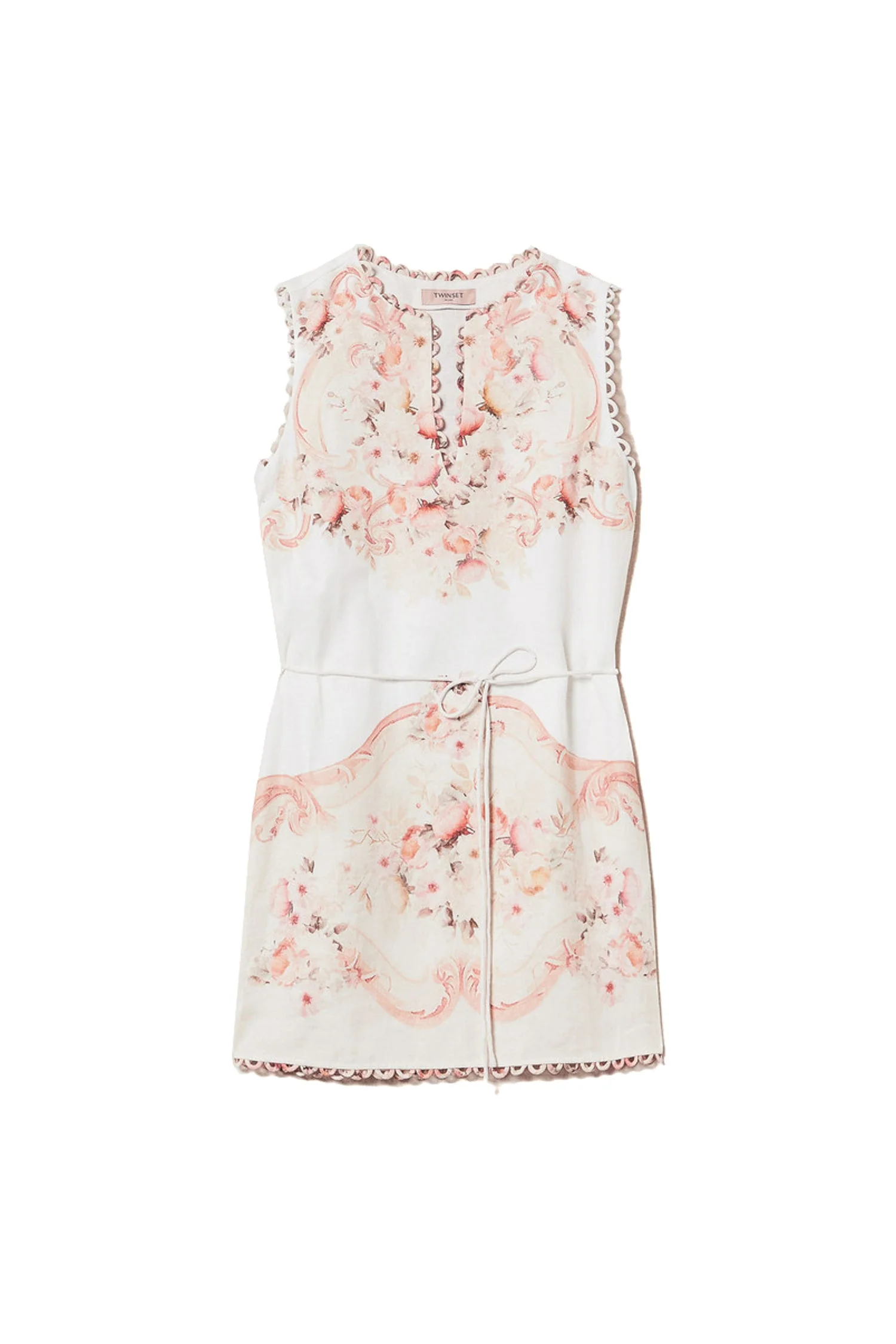 Abito corto in lino con stampa piazzata a fiori in stile tapestry, rifinito ai profili da passamaneria a semicerchio. Ha collo tondo con apertura a V, cintura rimovibile in tubolare abbinata, placchetta logo Oval T sul retro, linea dritta.