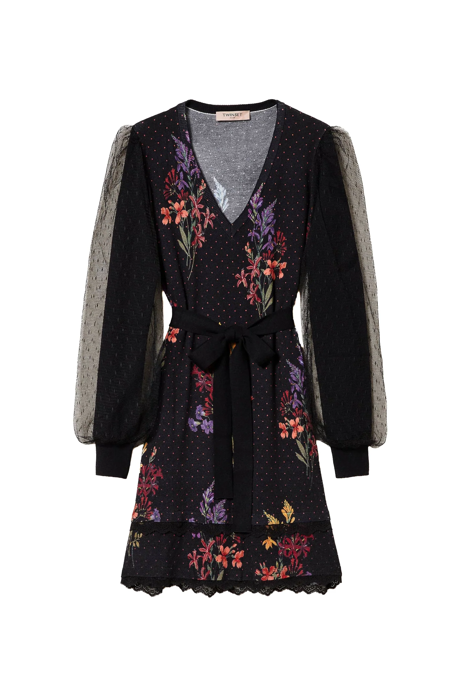 Abito corto in maglia di misto viscosa stretch con stampa bouquet e pois, maniche doppiate in tulle plumetis.