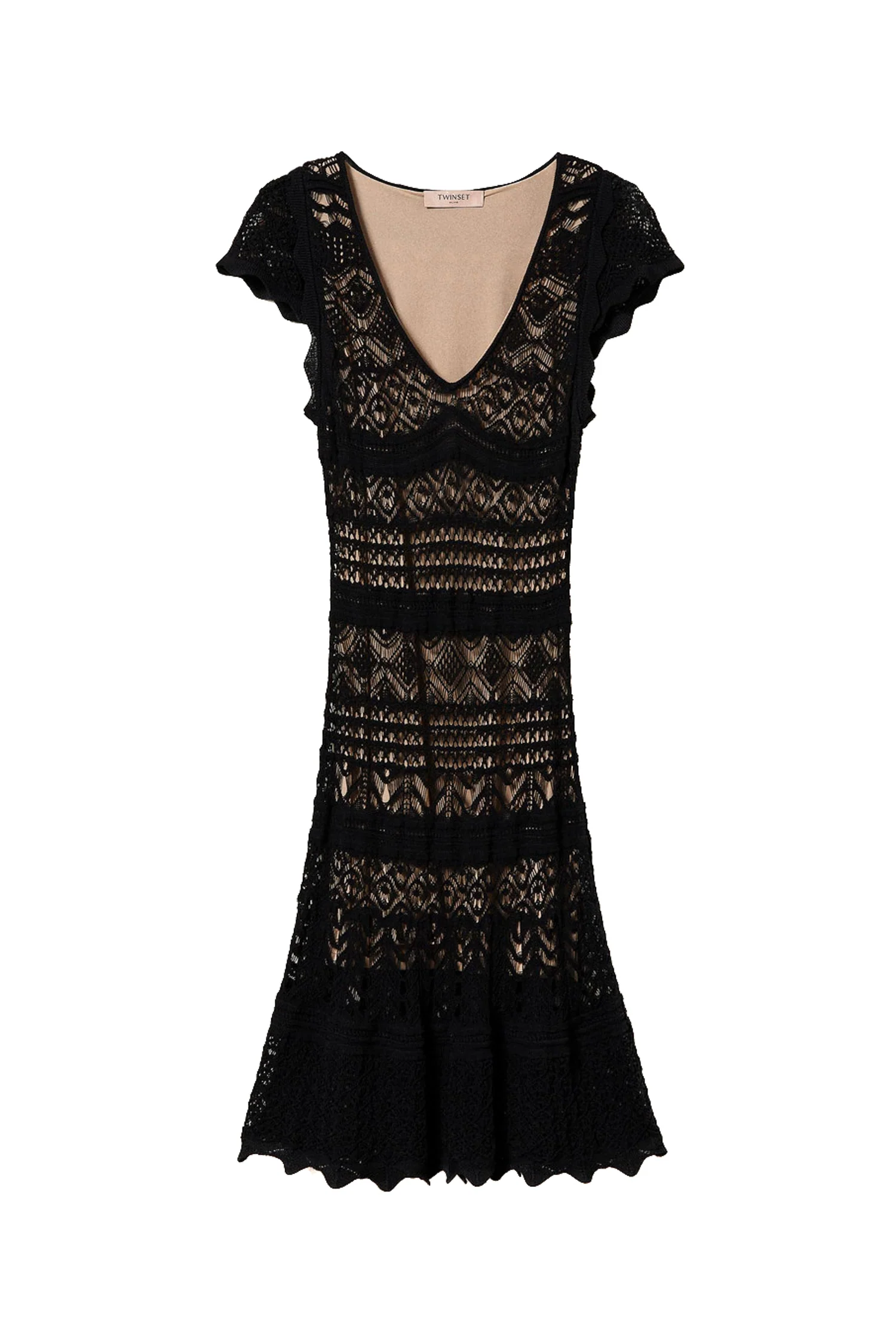 Fascino iconico Twinset per l’abito corto fitted in maglia di misto viscosa con disegni punzonati effetto righe see-through. Ha scollatura a V, maniche corte, placchetta logo Oval T in metallo sul retro, fodera a contrasto. Con tacchi alti o sandali flat a seconda dell’occasione.