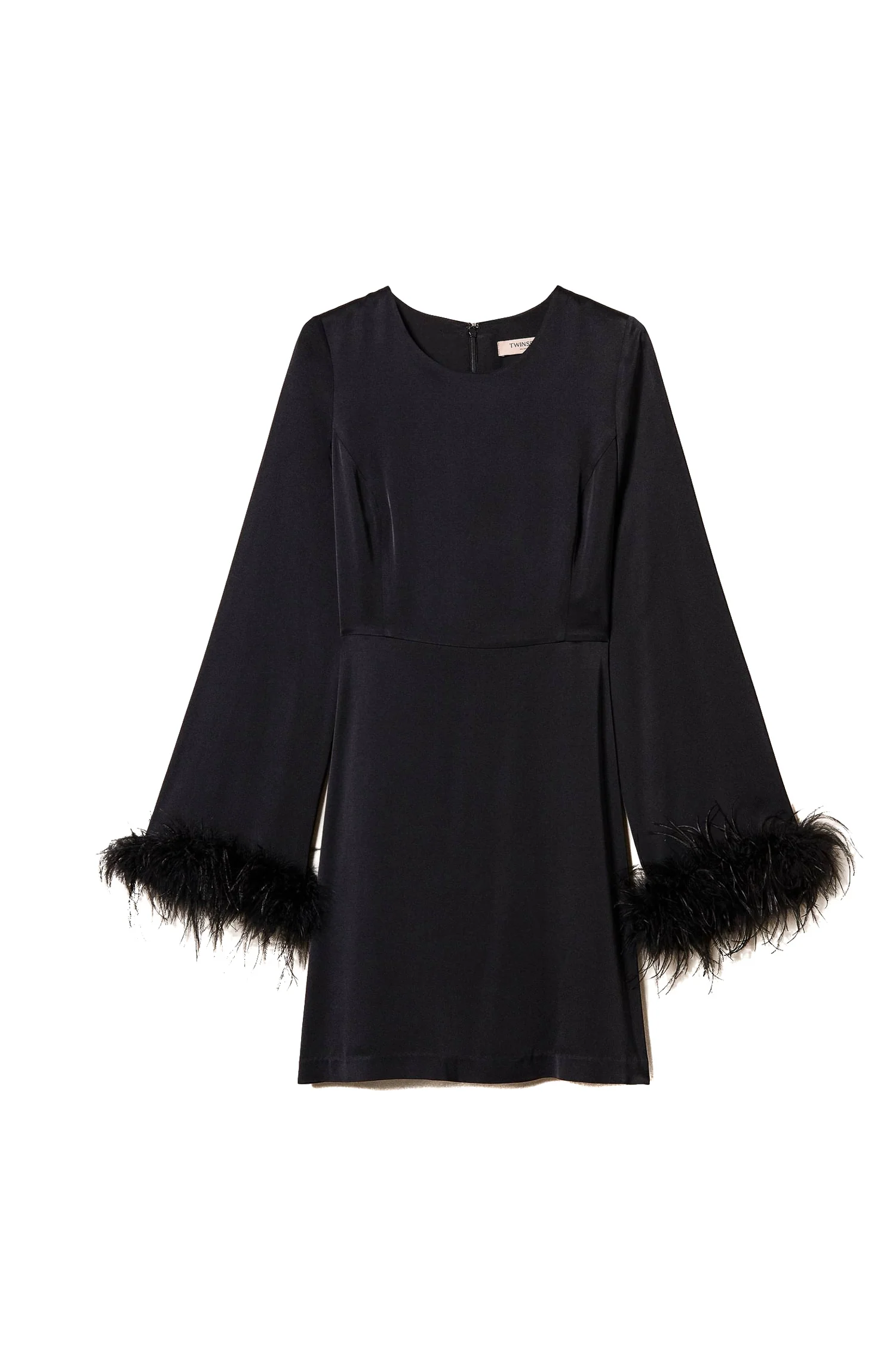 Abito corto in raso di viscosa con polsi rifiniti da torchon di piume in tono applicato a mano. Collo tondo, maniche lunghe ampie, taglio in vita, chiusura con zip e placchetta logo Oval T sul retro, foderato, linea morbida. Questo abito è perfetto per una cerimonia.