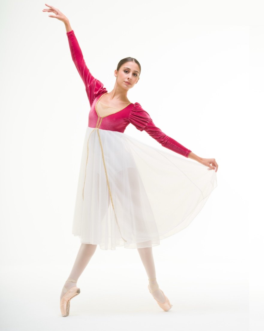 Abito con doppia gonna a ruota e maniche lunghe, parte alta del body in velluto. Capo realizzato sartorialmente su ordinazione. Tempi di consegna variabili.