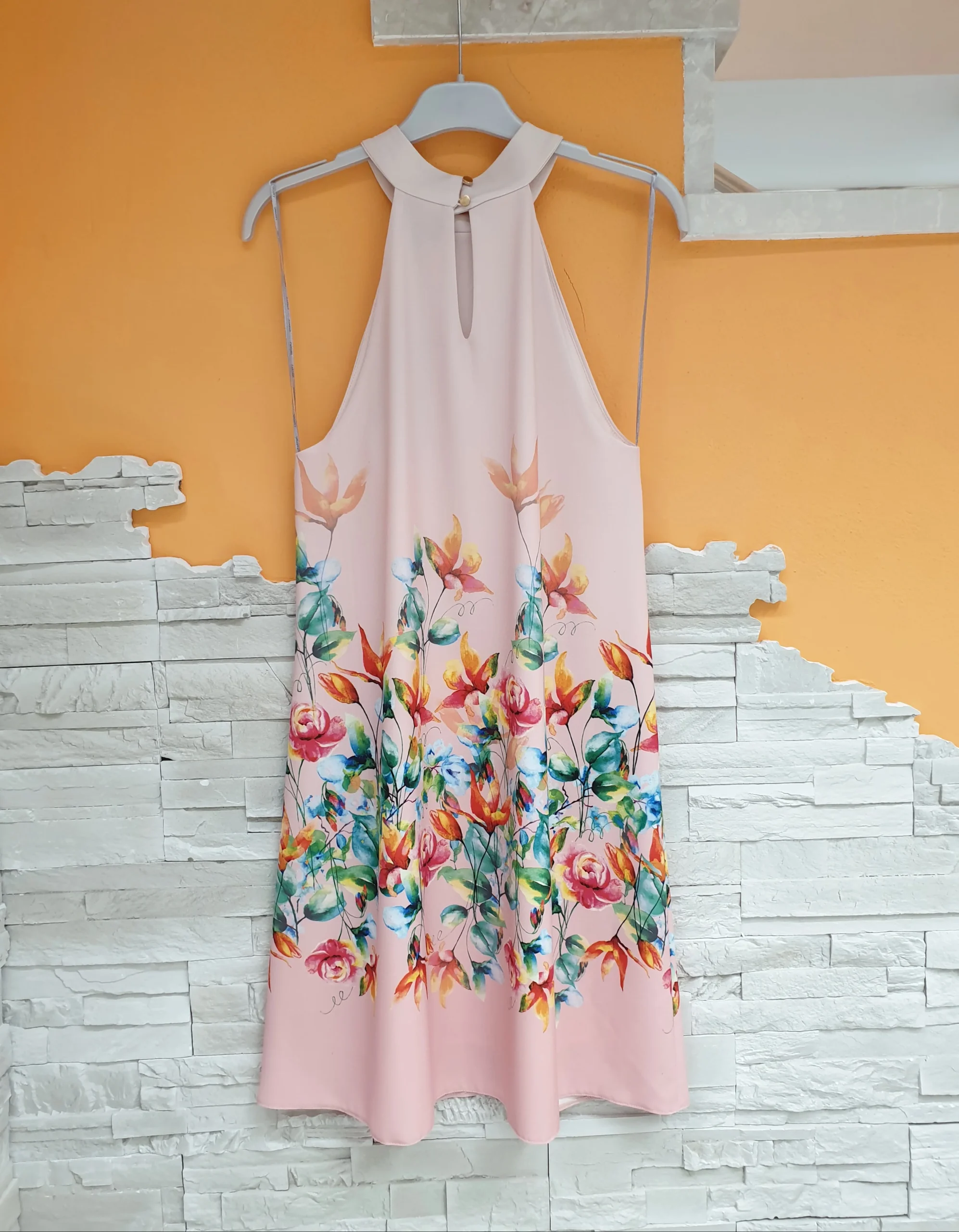 Abito rosa scollo americana con fantasia fiori acquarelle, modello a trapezio, chiusura bottoncini retro collo.