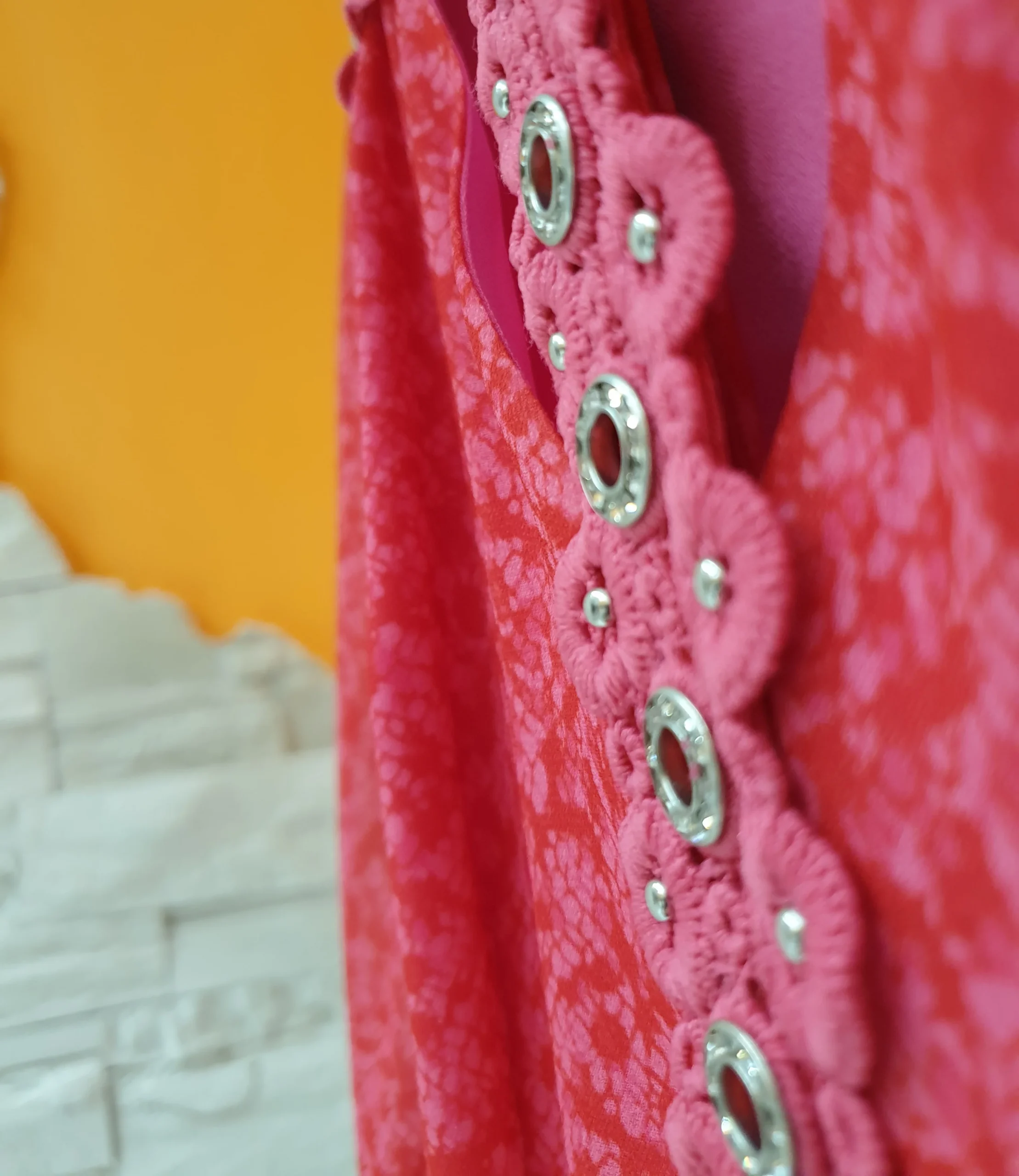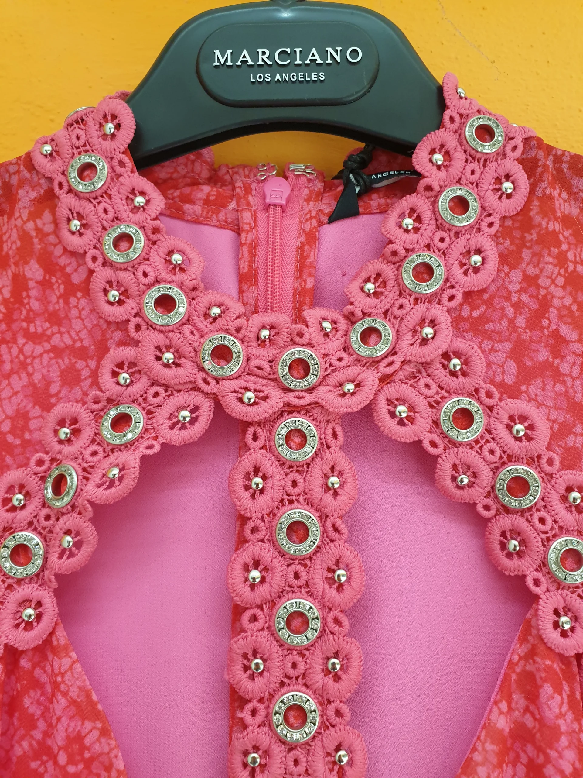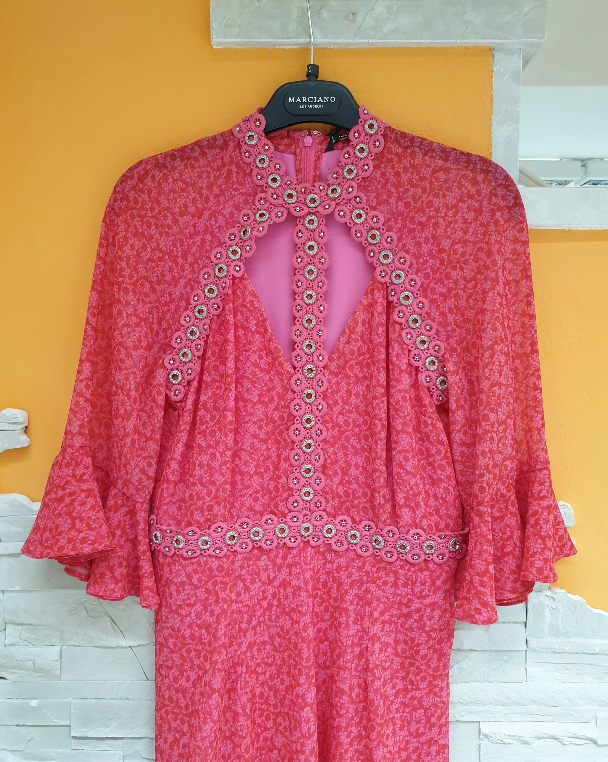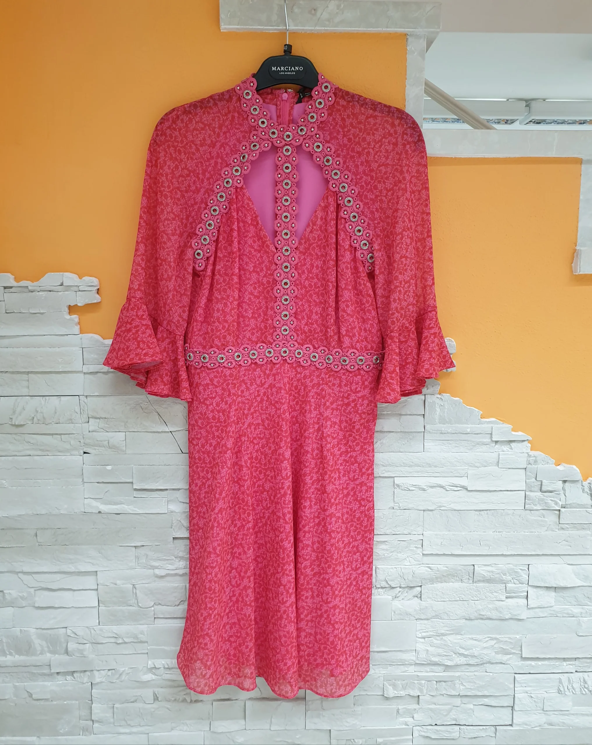 Abito corto svasato fantasia effetto pizzo fuxia/corallo con manica 3/4 a campanella. Inserto passamaneria gioiello con dettagli colore silver, chiusura zip sul retro e completamente foderato.