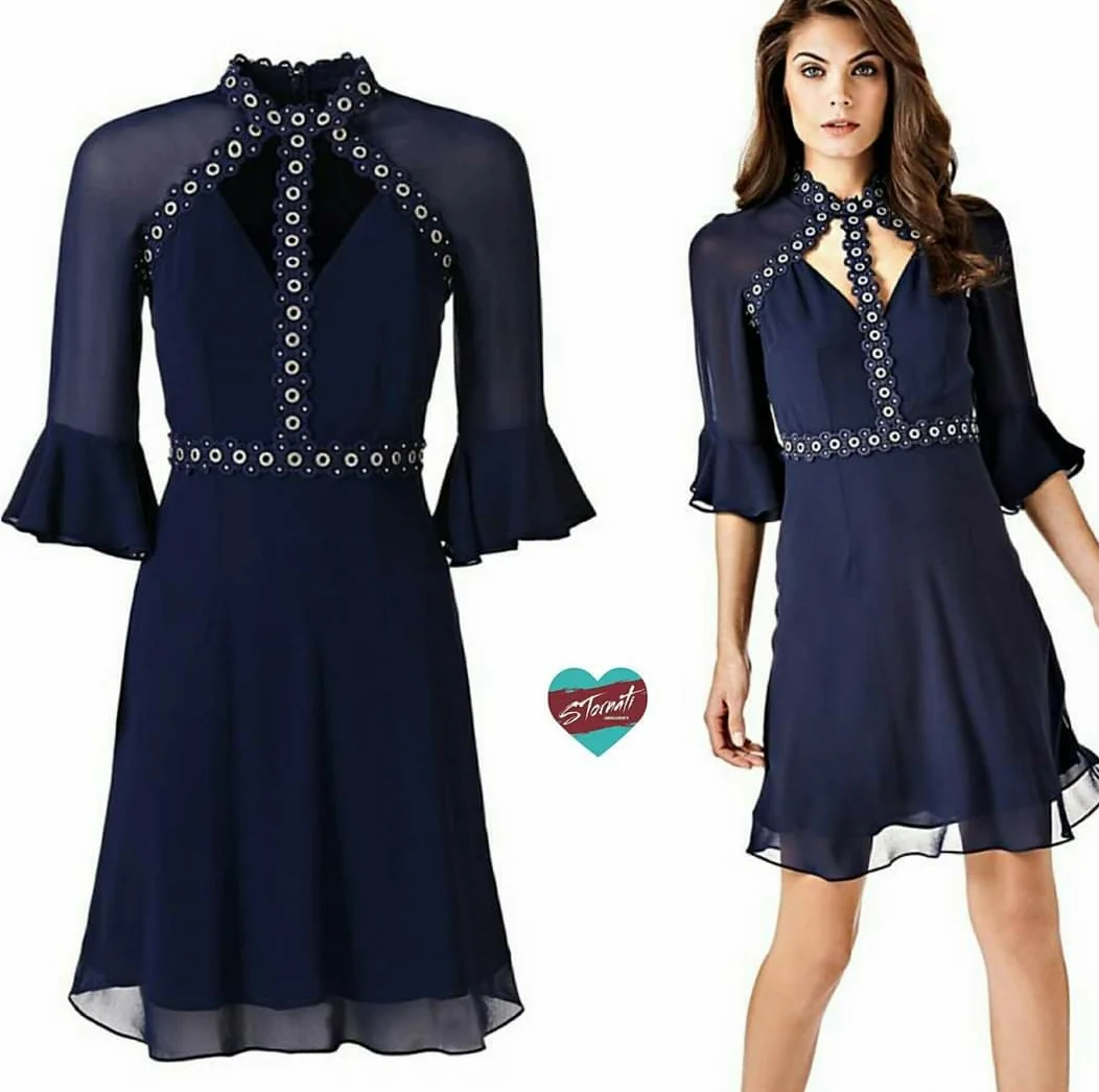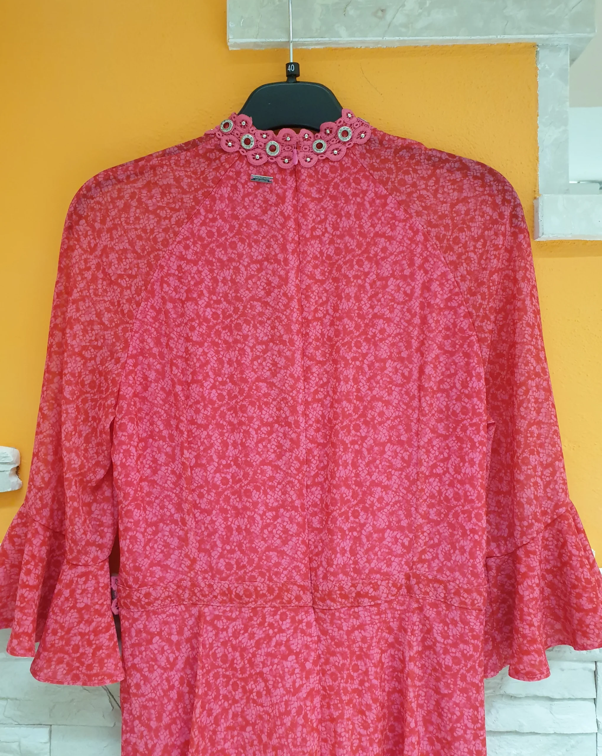 Abito corto svasato fantasia effetto pizzo fuxia/corallo con manica 3/4 a campanella. Inserto passamaneria gioiello con dettagli colore silver, chiusura zip sul retro e completamente foderato. Composizione: 100% Poliestere