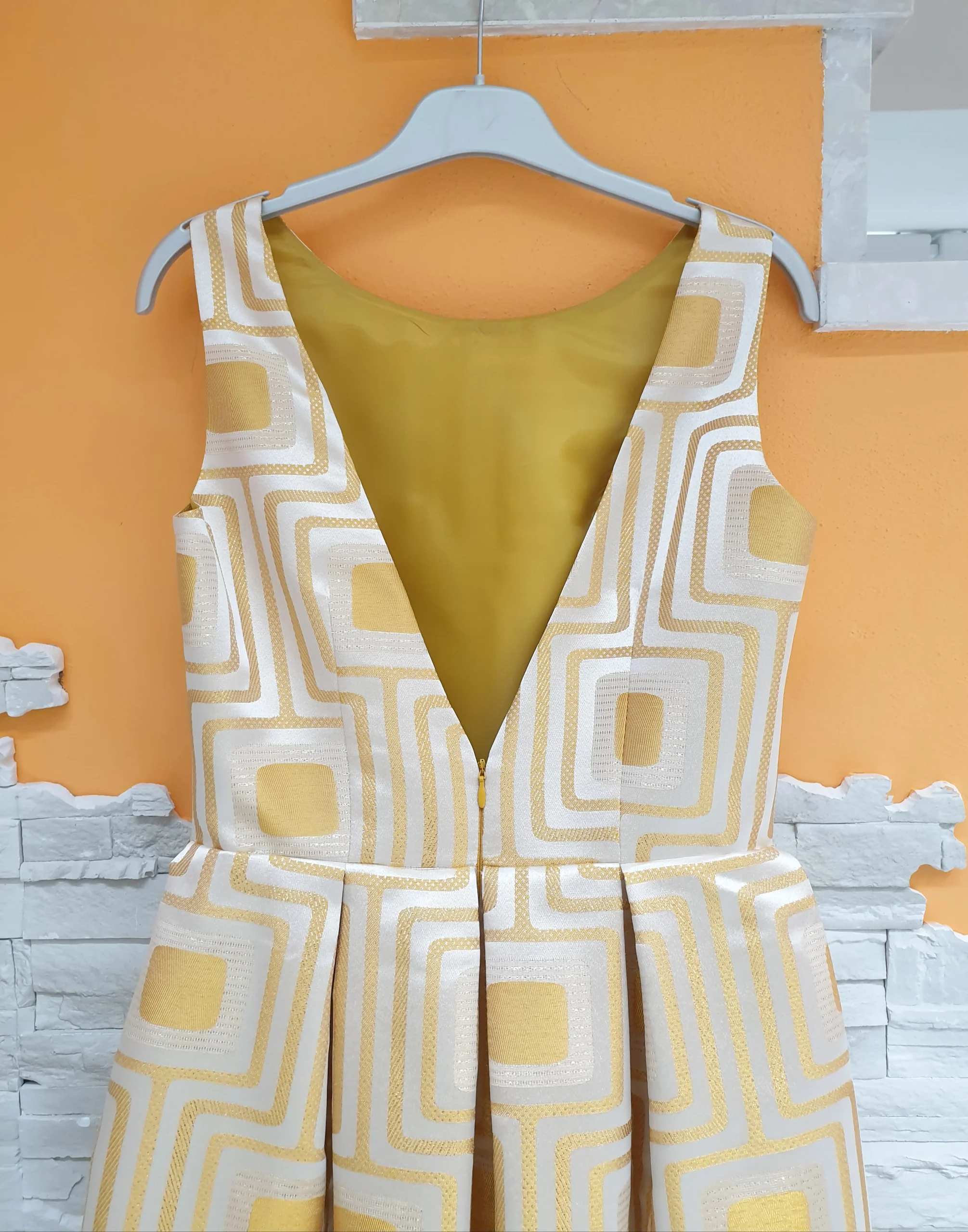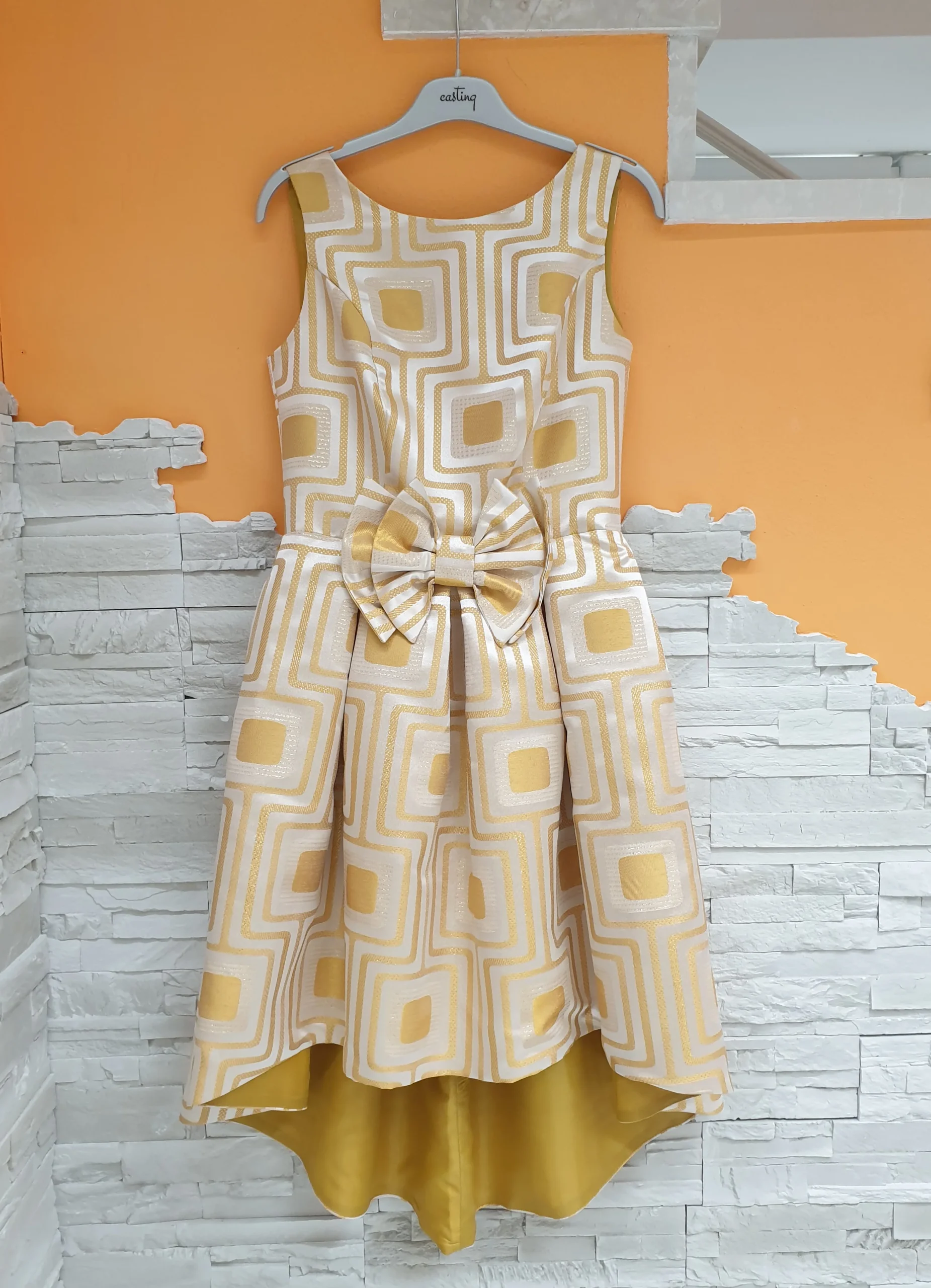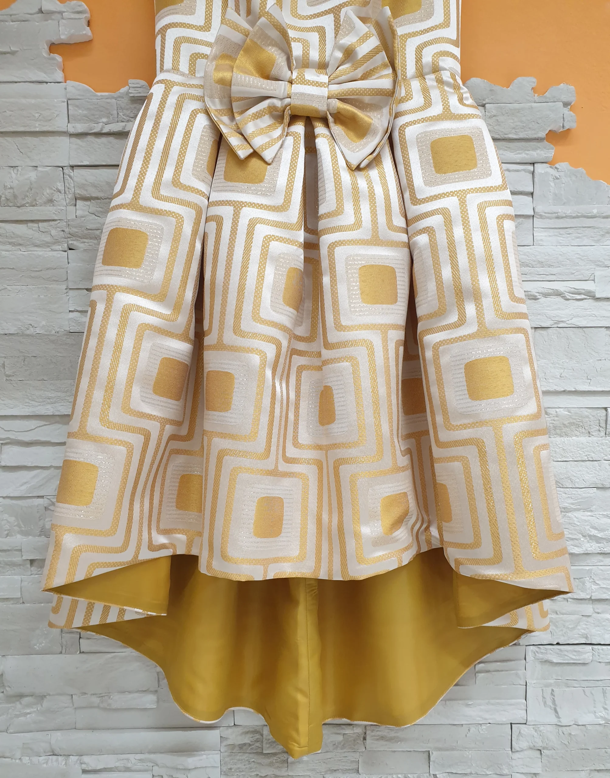Abito giallo dorato/acorio fantasia geometrica iridescente con fili lurex silver. Modello con fiocco in vita, retro con scollatura a V e coda, tasche laterali.