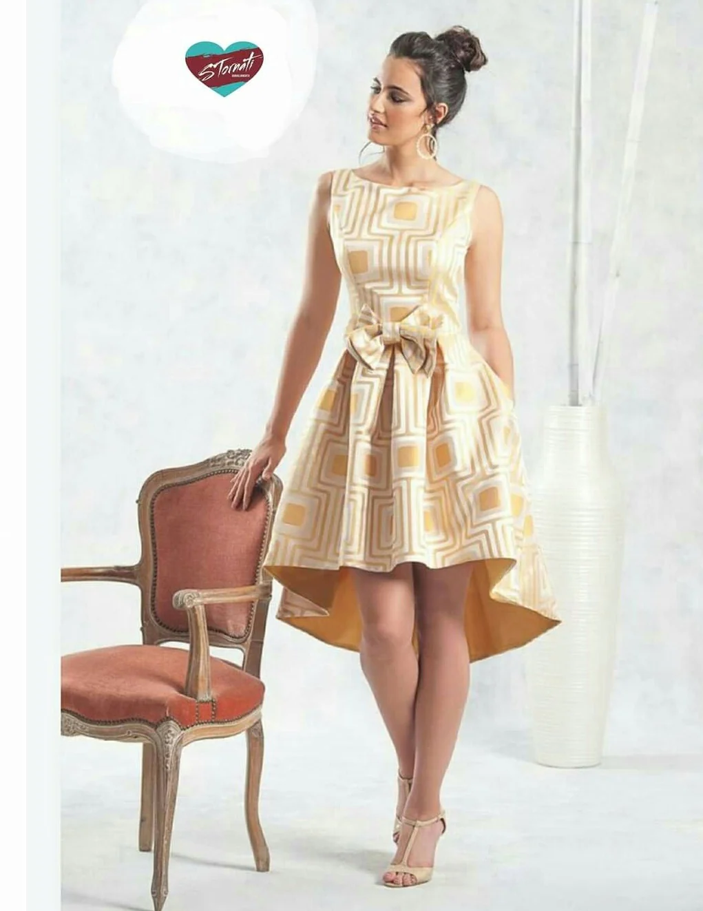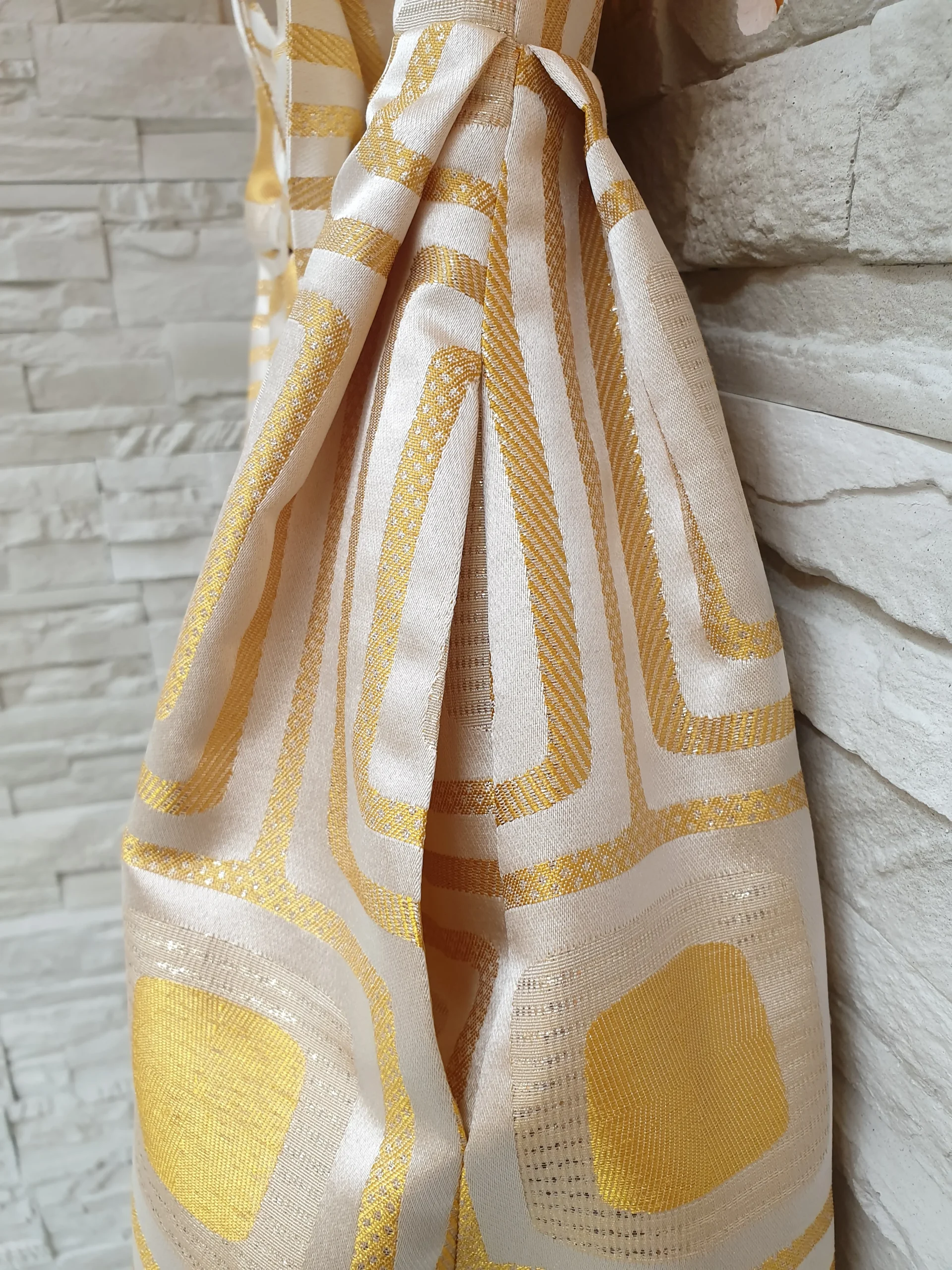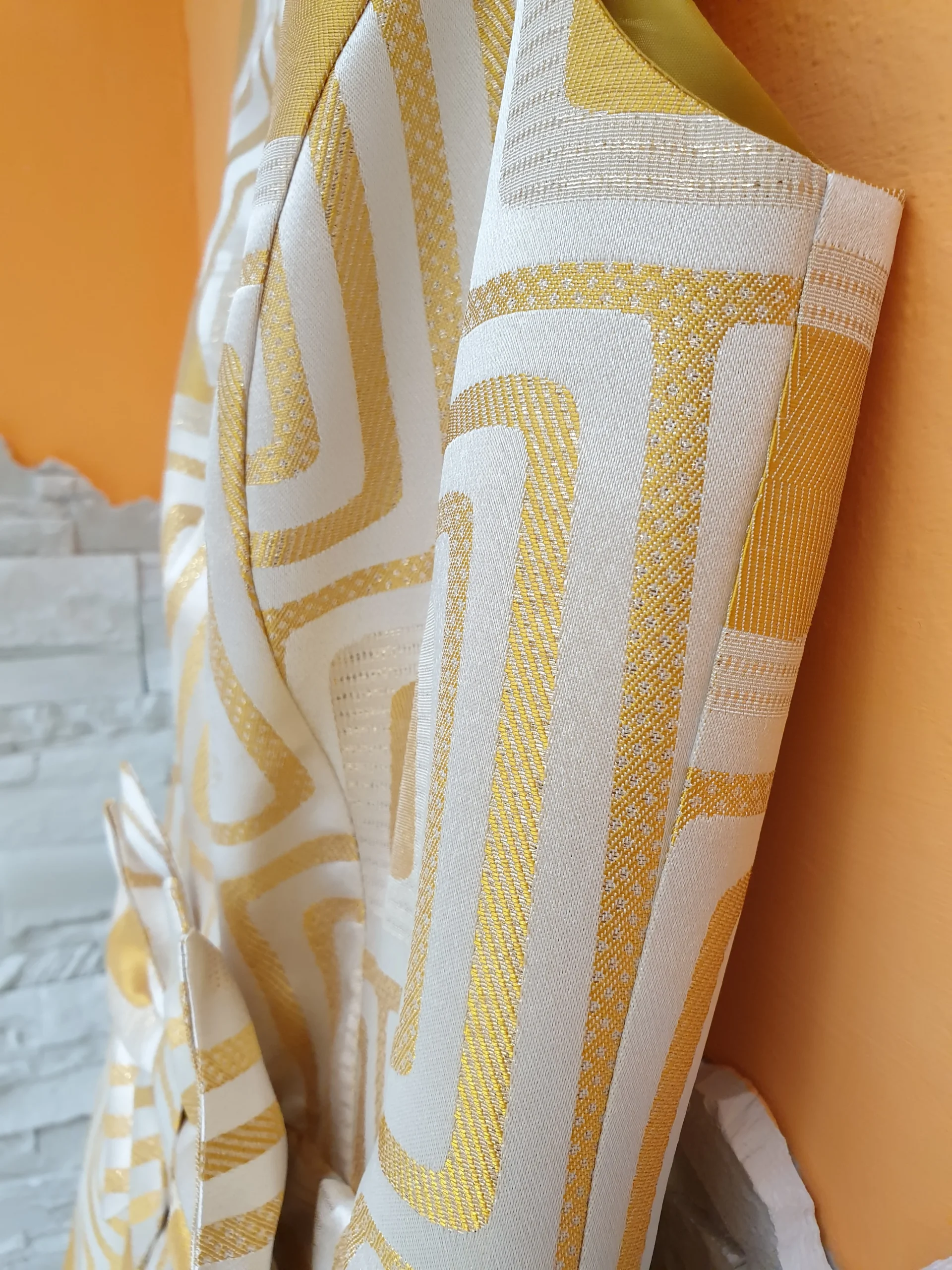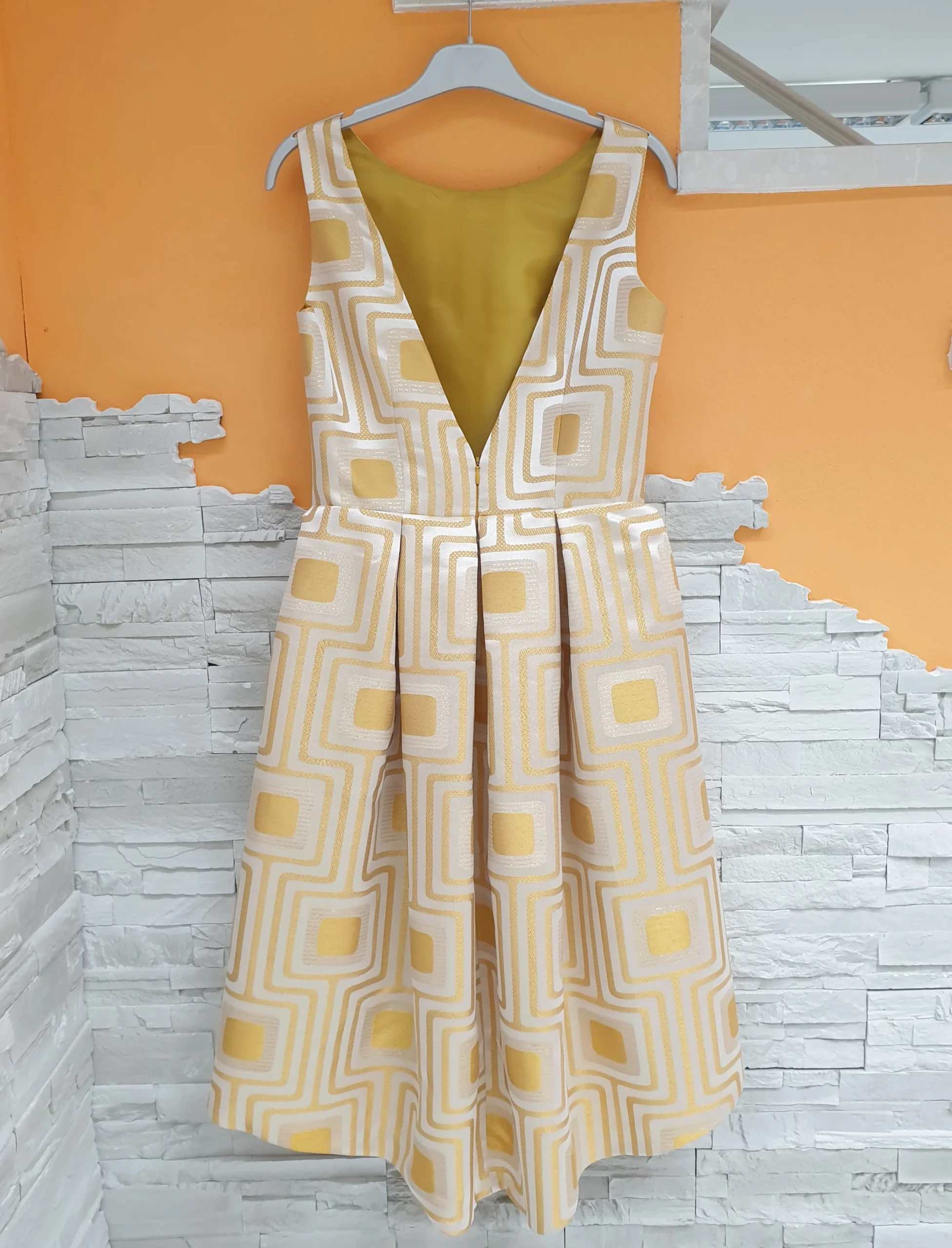 Abito giallo dorato/acorio fantasia geometrica iridescente con fili lurex silver. Modello con fiocco in vita, retro con scollatura a V e coda, tasche laterali.