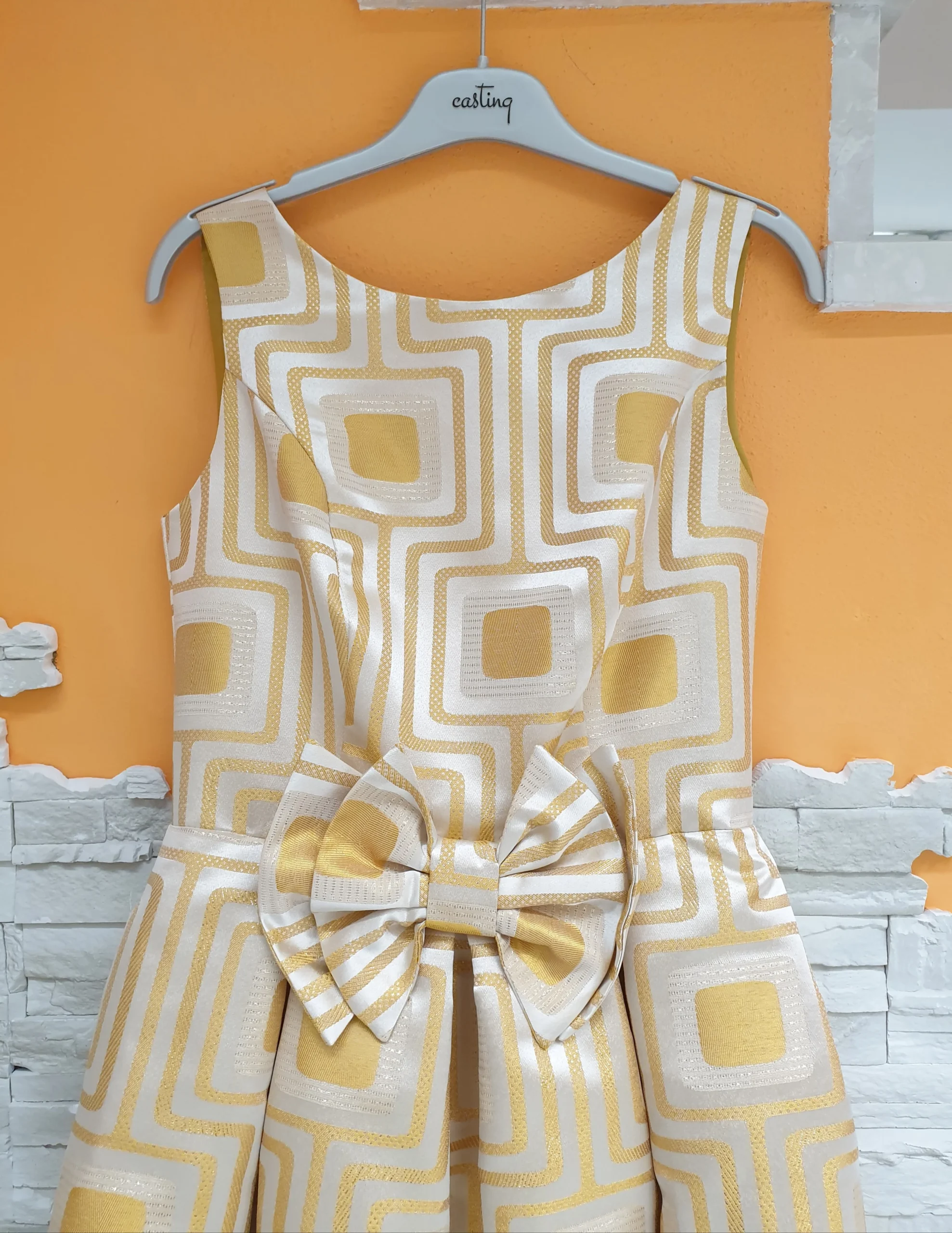 Abito giallo dorato/acorio fantasia geometrica iridescente con fili lurex silver. Modello con fiocco in vita, retro con scollatura a V e coda, tasche laterali. Composizione: 100% Poliestere MADE IN SPAIN