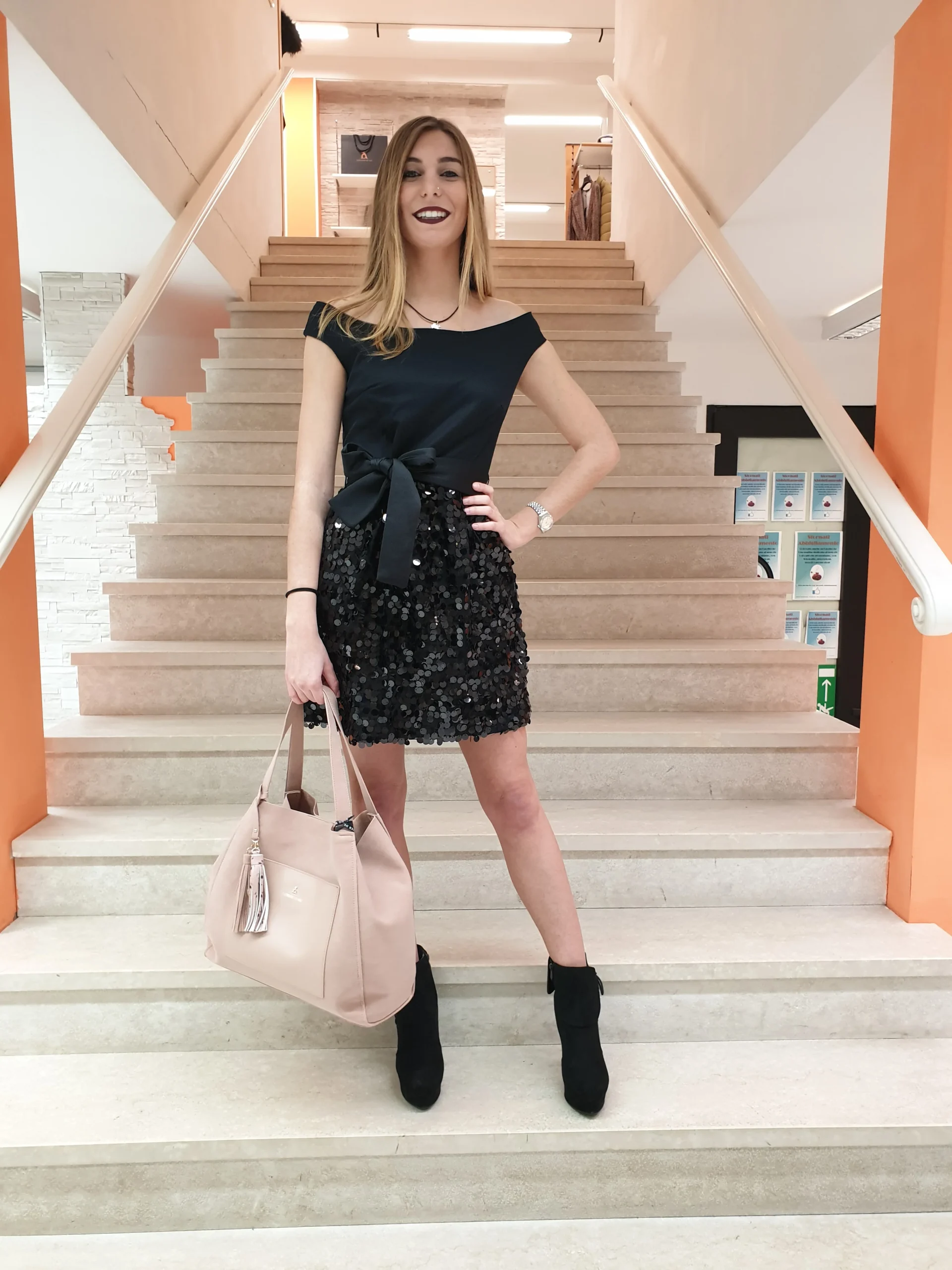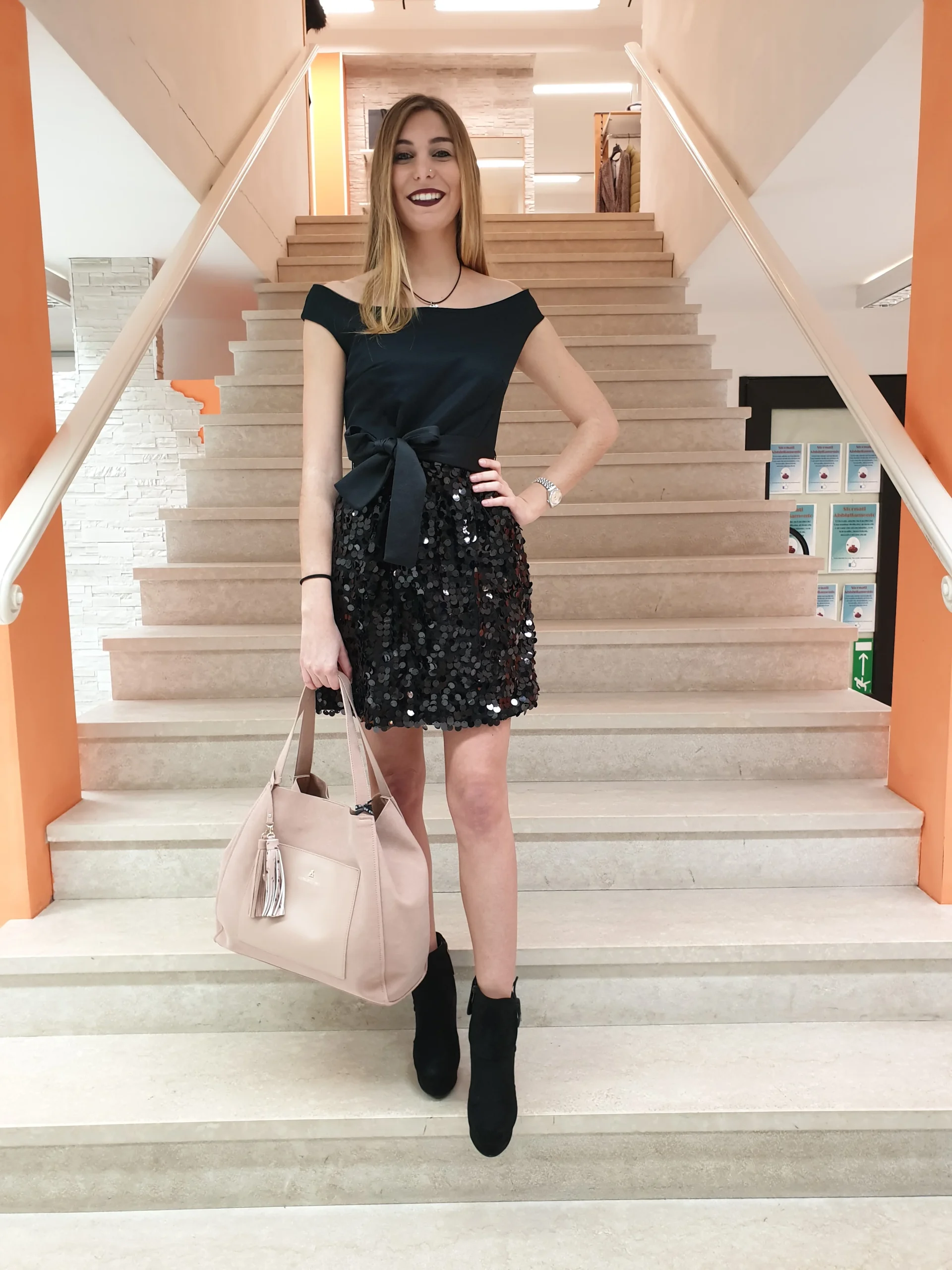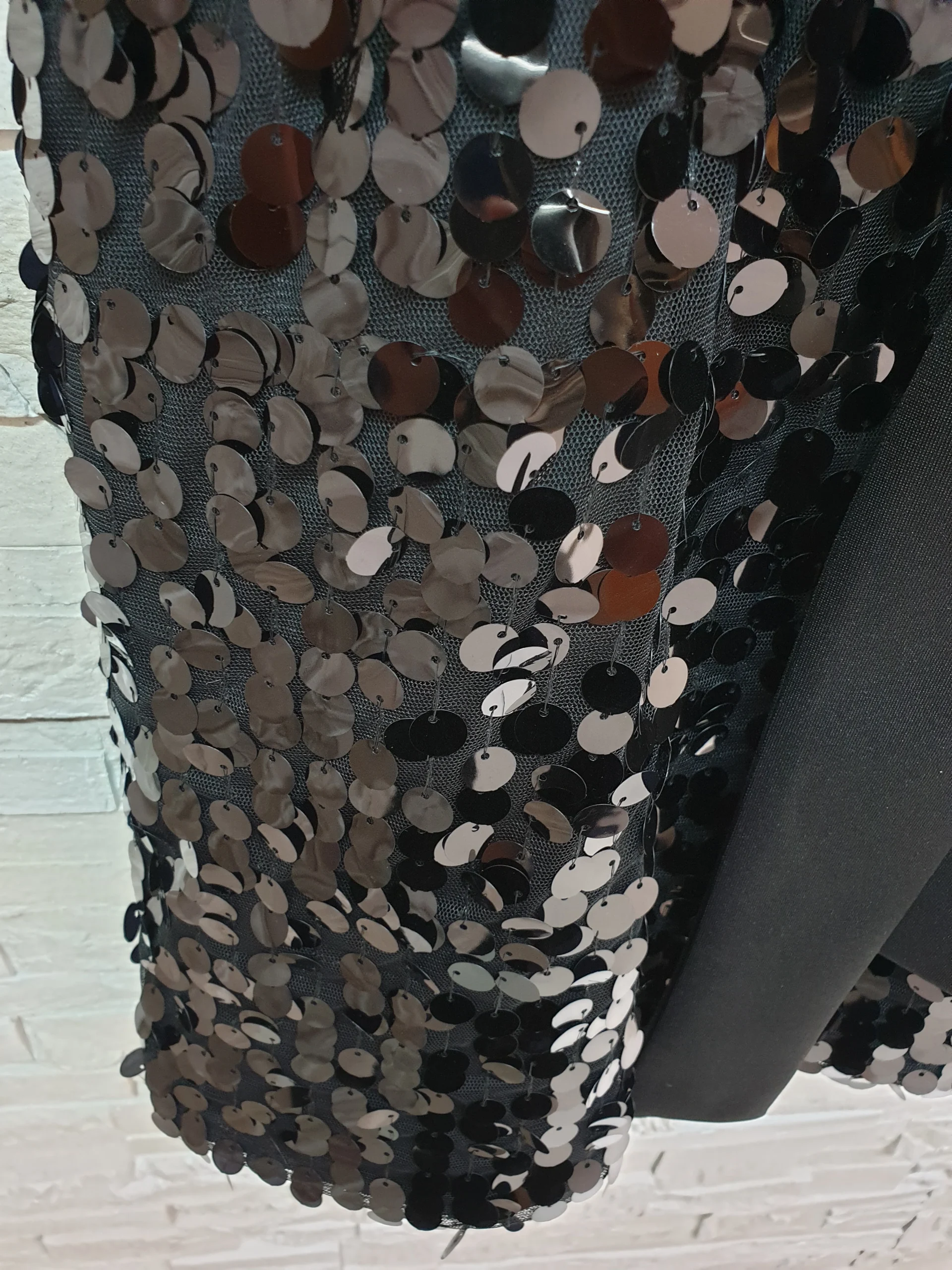 Mini abito a canotta scollo barchetta spalla scesa, gonna tulle con pailletes applicate e fusciacca vita.