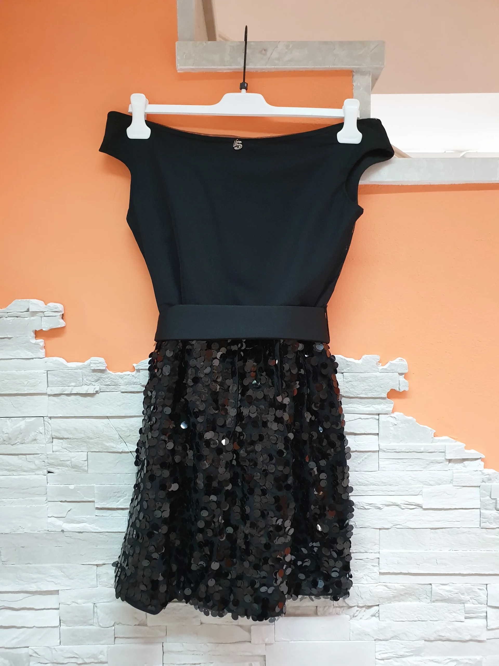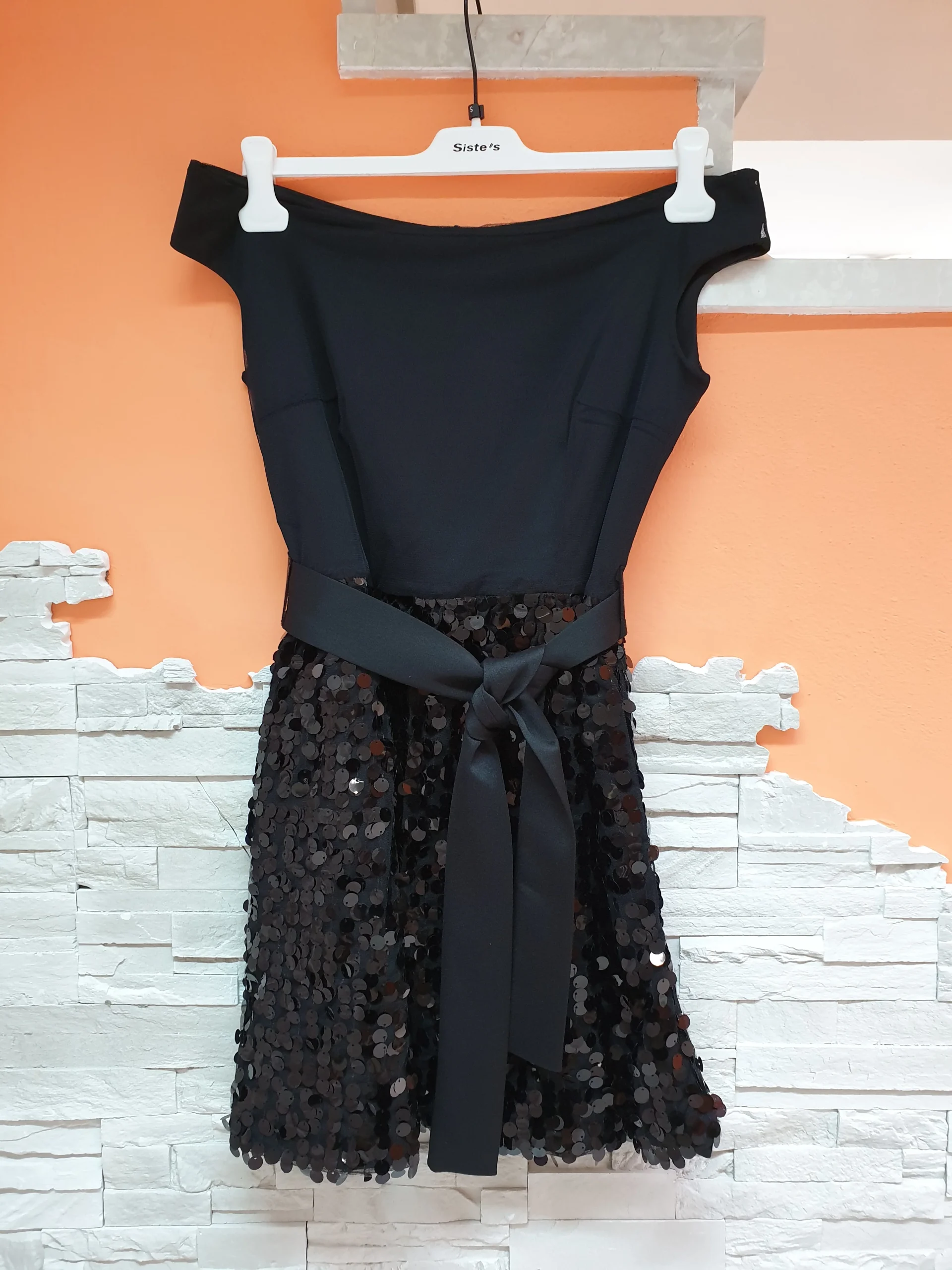 Mini abito a canotta scollo barchetta spalla scesa, gonna tulle con pailletes applicate e fusciacca vita. Composizione: 97% Poliestere 3% Elastan MADE IN ITALY
