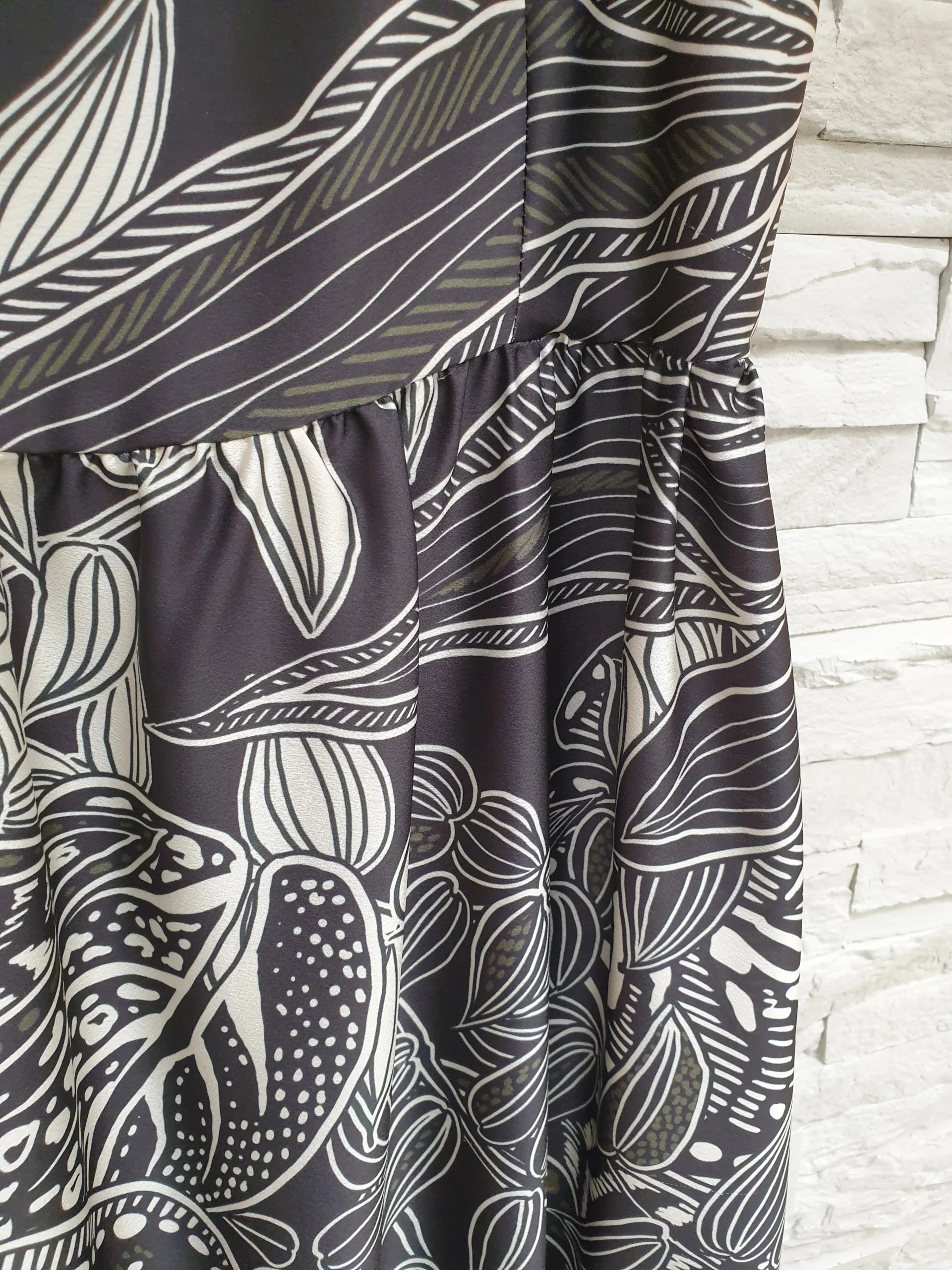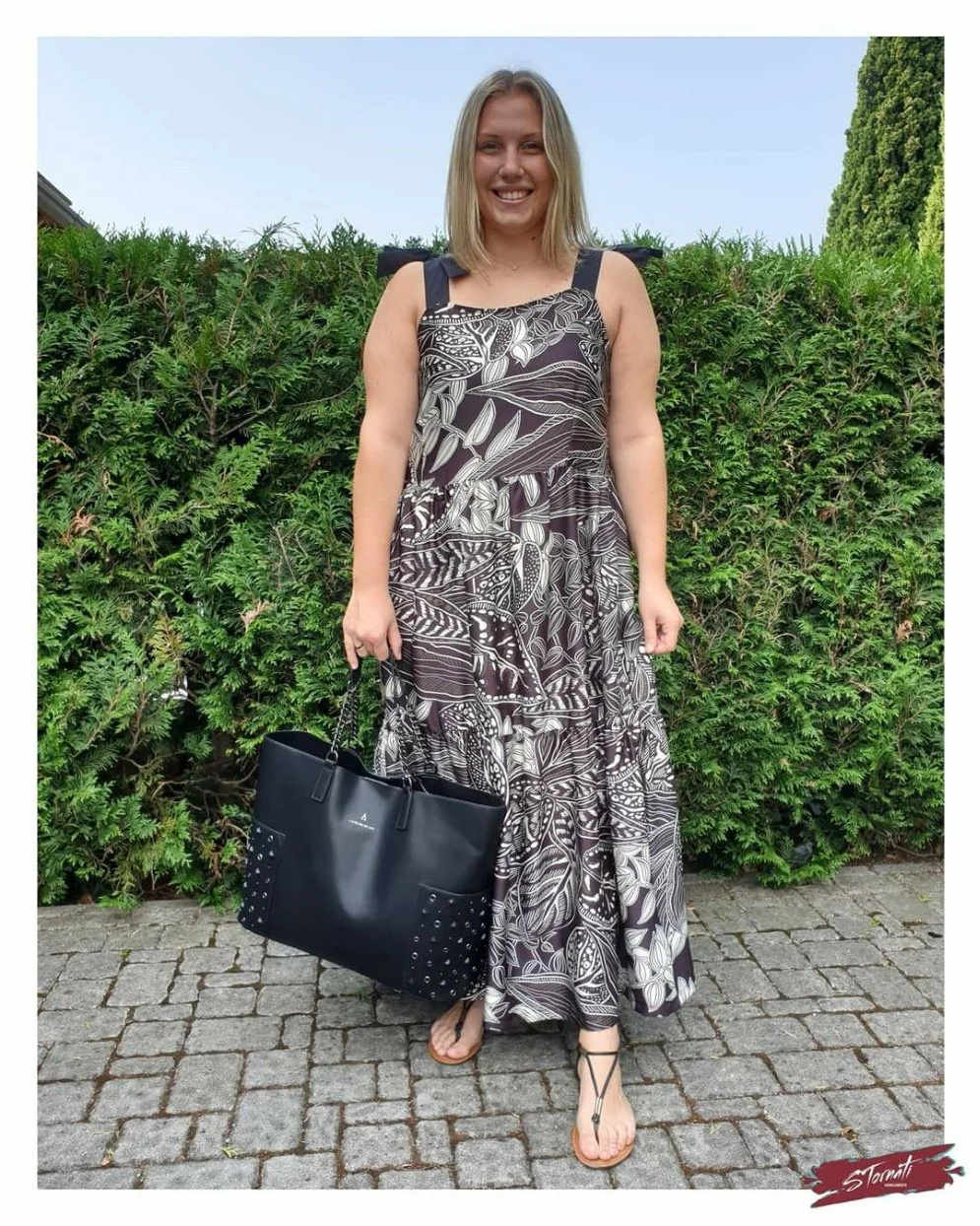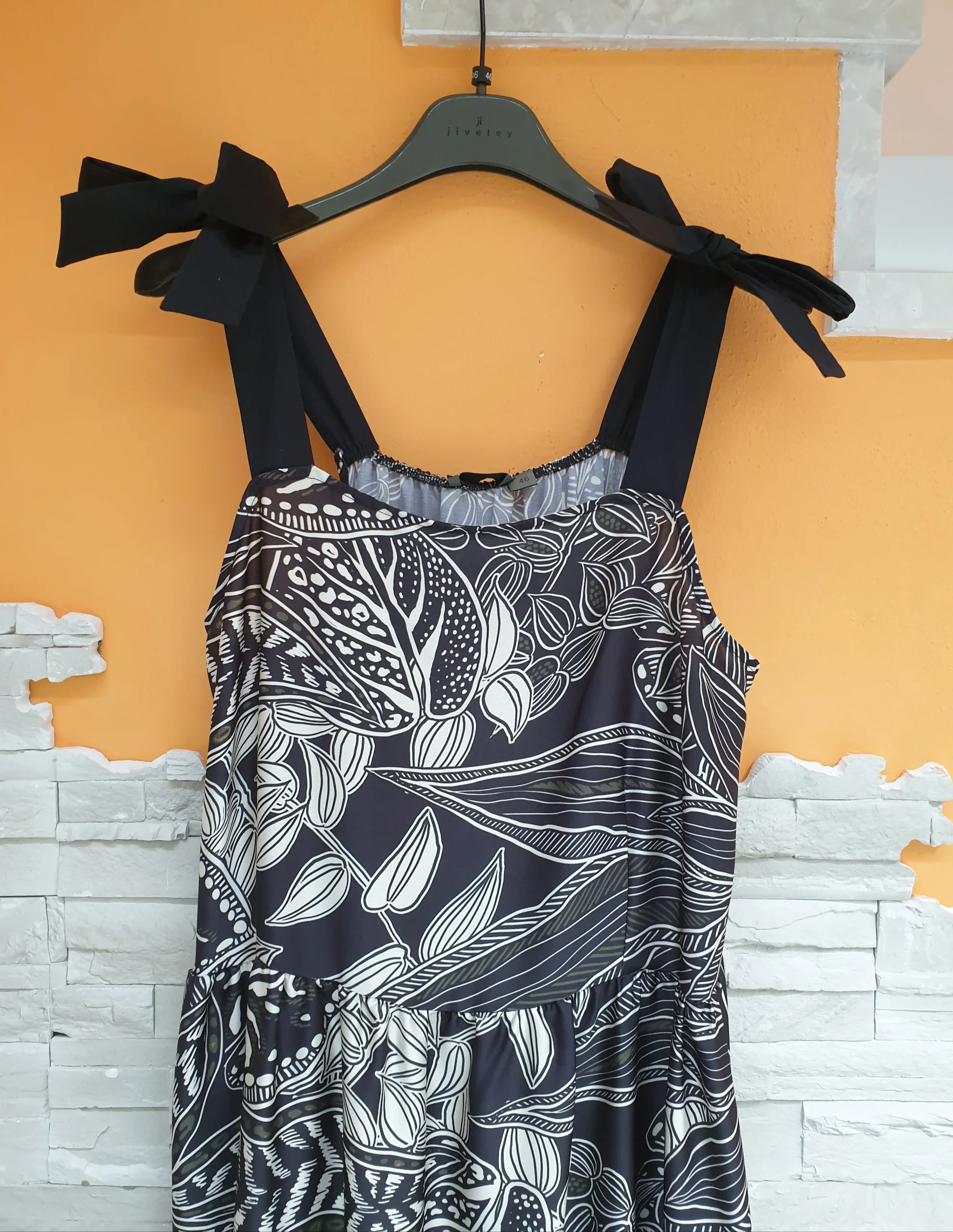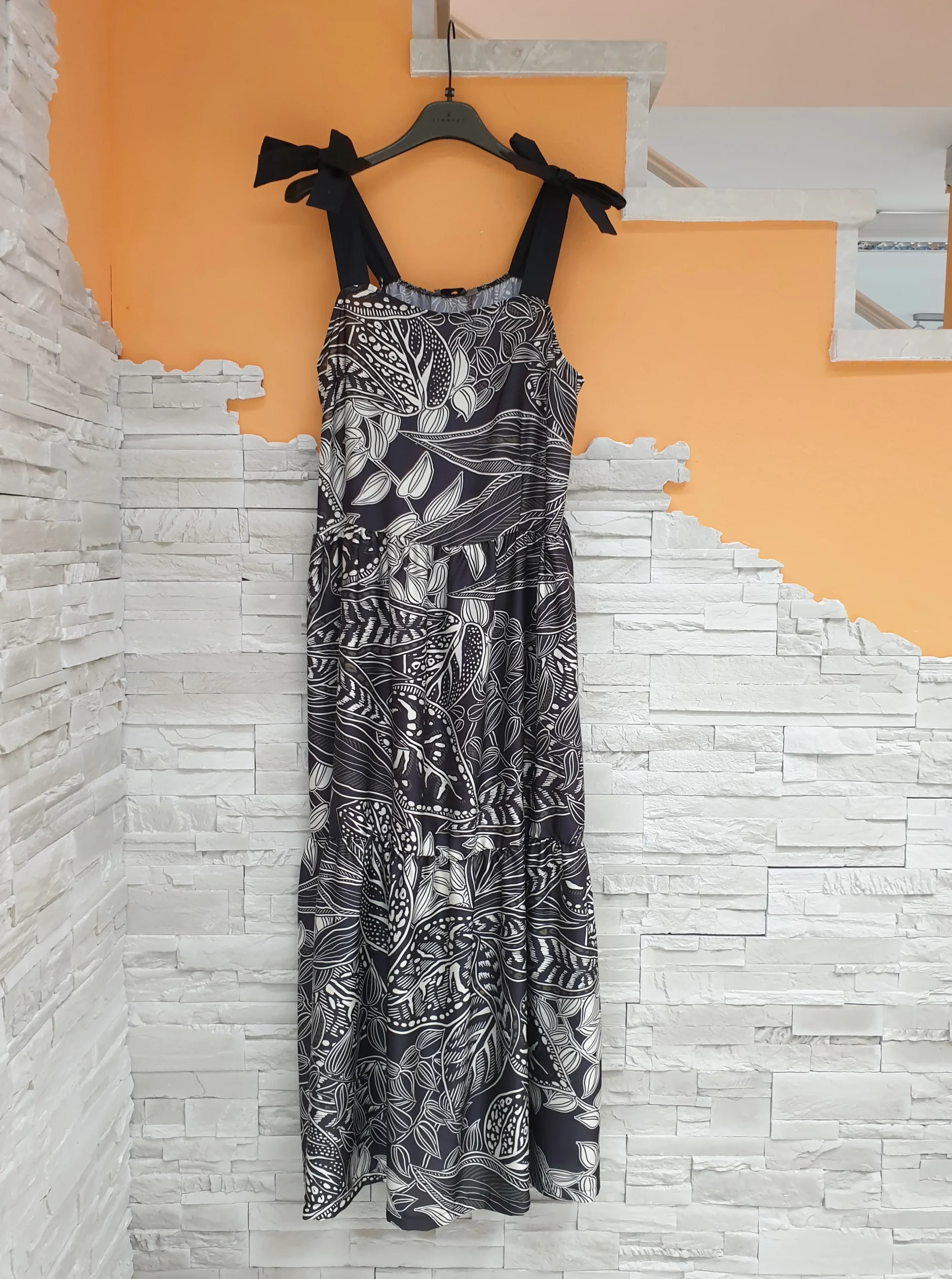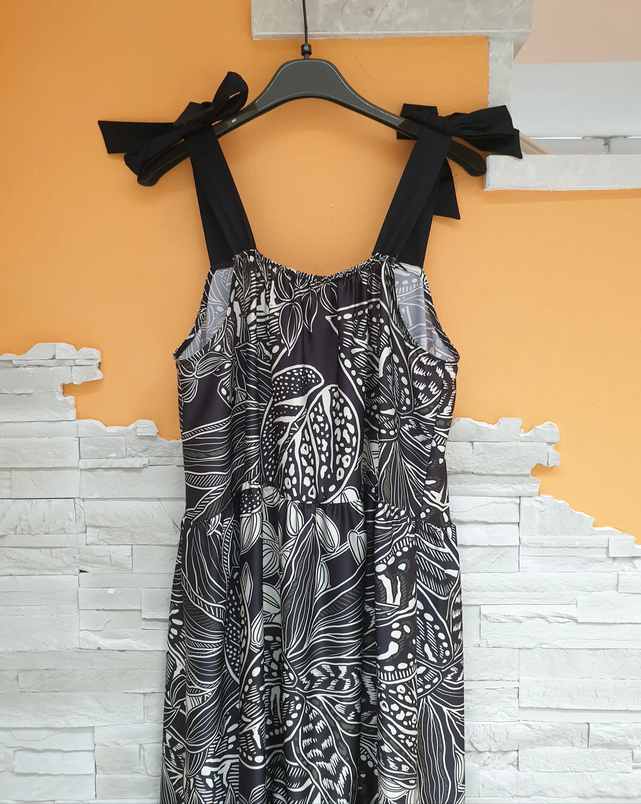 Abito lungo fantasia panna/nero/militare con bretelline fiocchi. Tessuto fluido con cucitura in vita e sulla gonna. Vestibilità morbida, una misura veste due taglie.