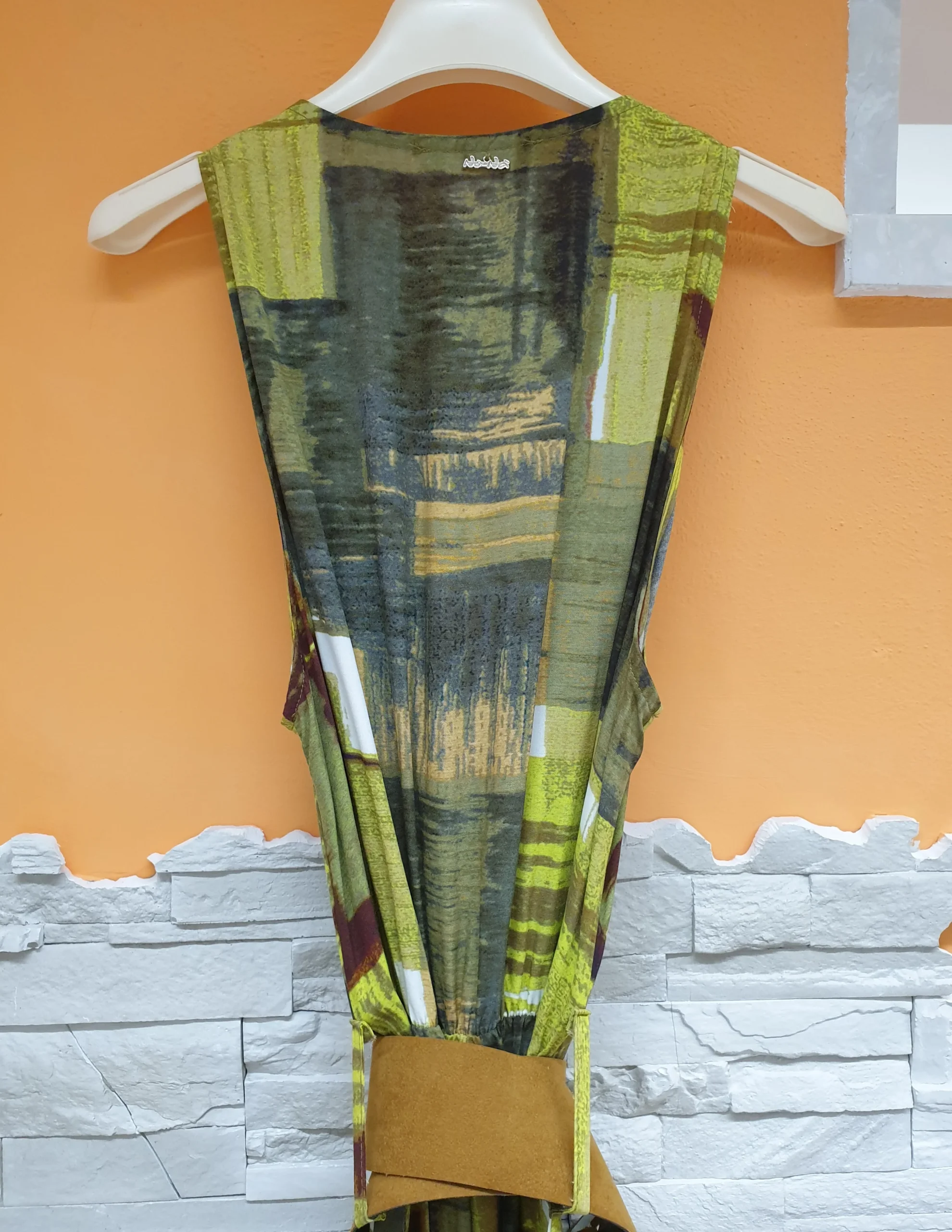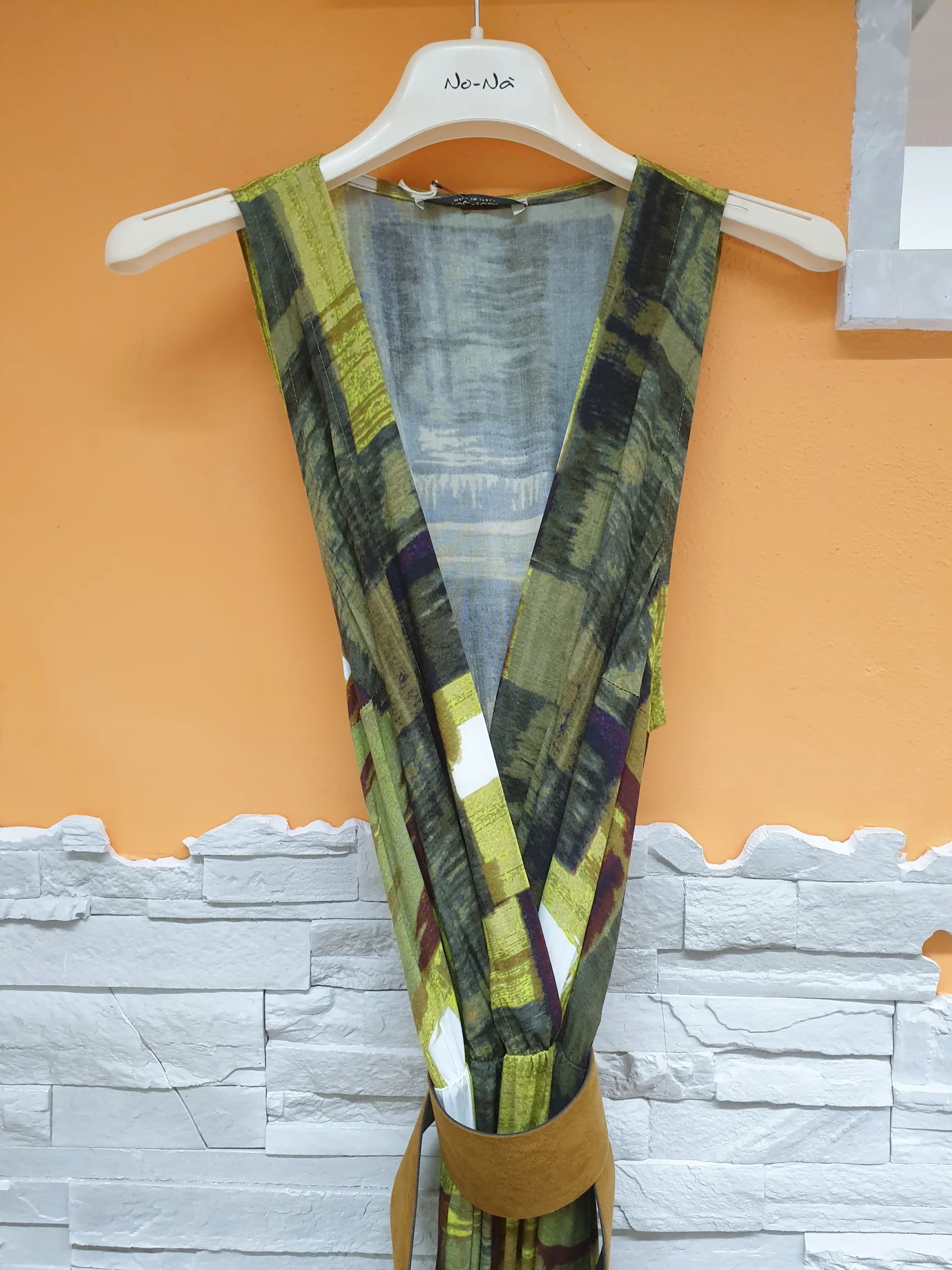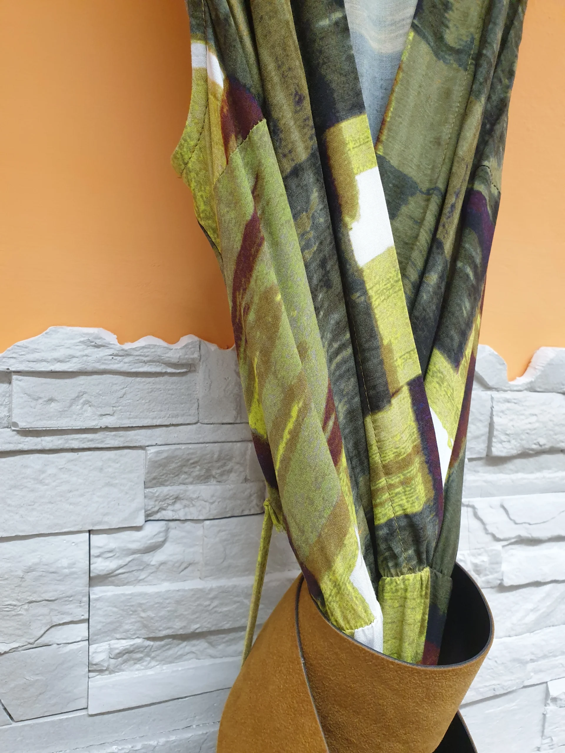 Abito lungo a spalla larga con scollo incrocio, taglio in vita e cinturone suede cuoio. Tessuto leggerissimo stampa murales cedro.