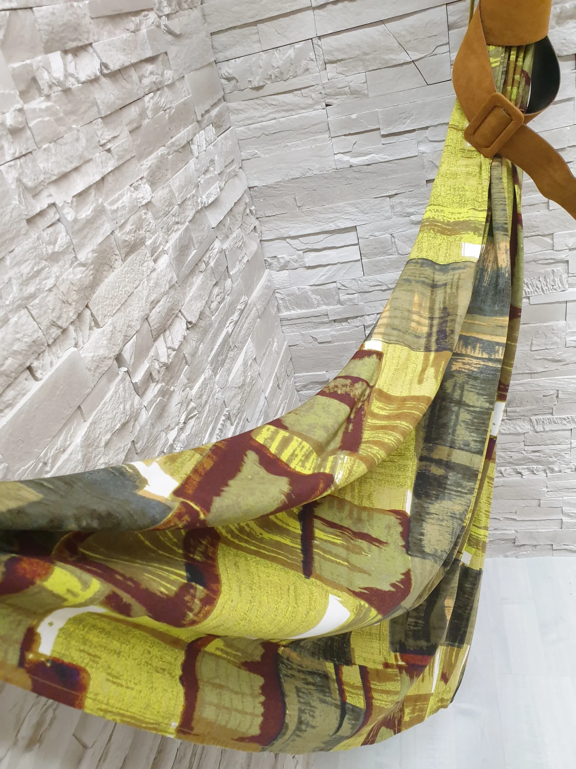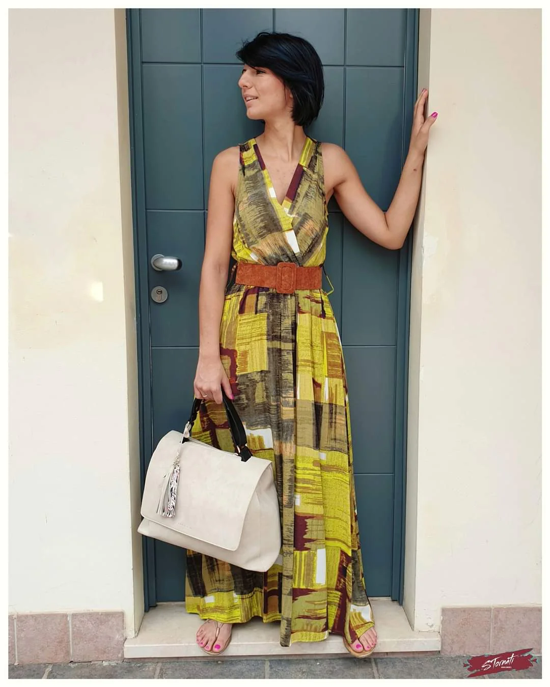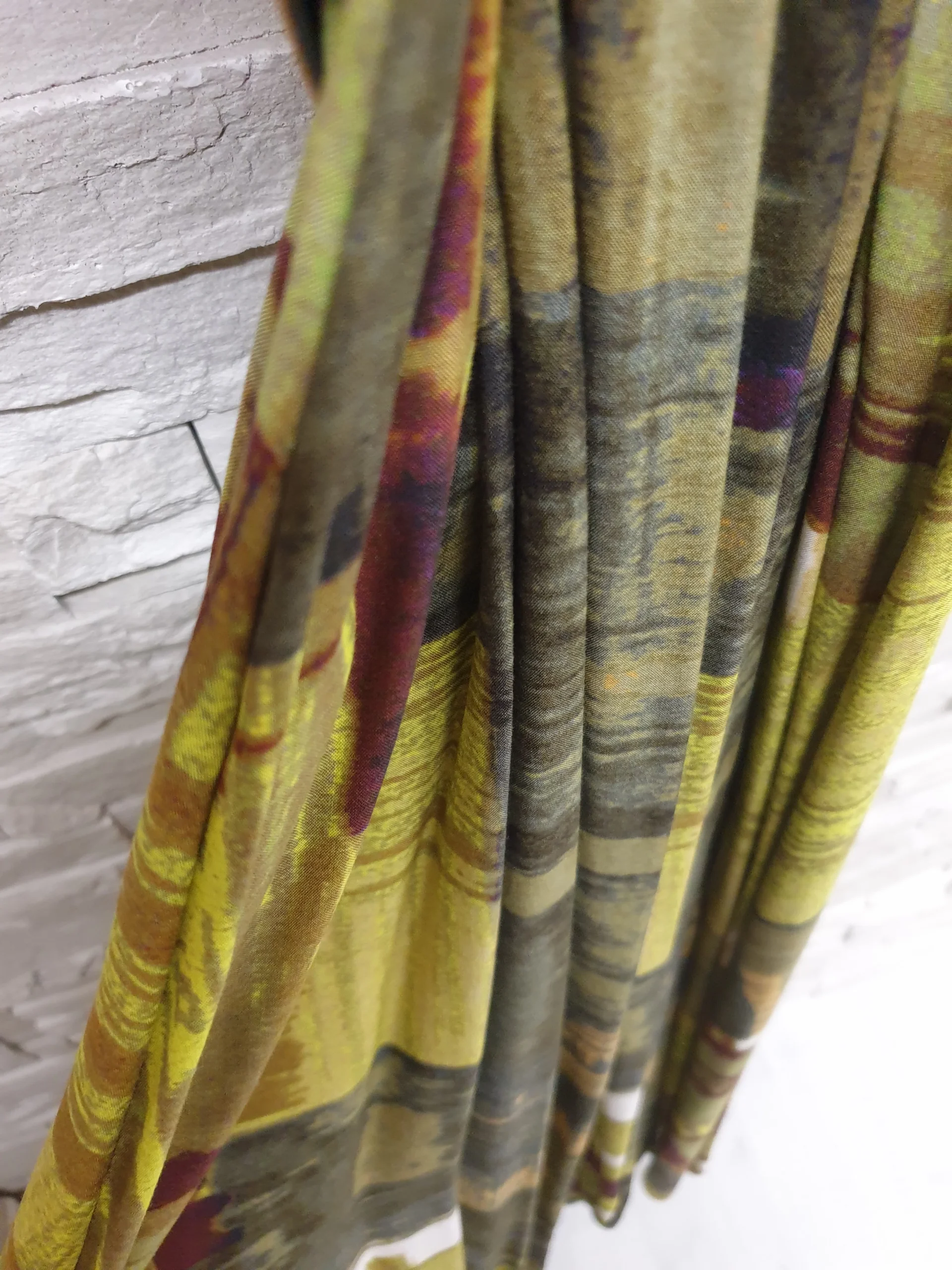 Abito lungo a spalla larga con scollo incrocio, taglio in vita e cinturone suede cuoio. Tessuto leggerissimo stampa murales cedro.