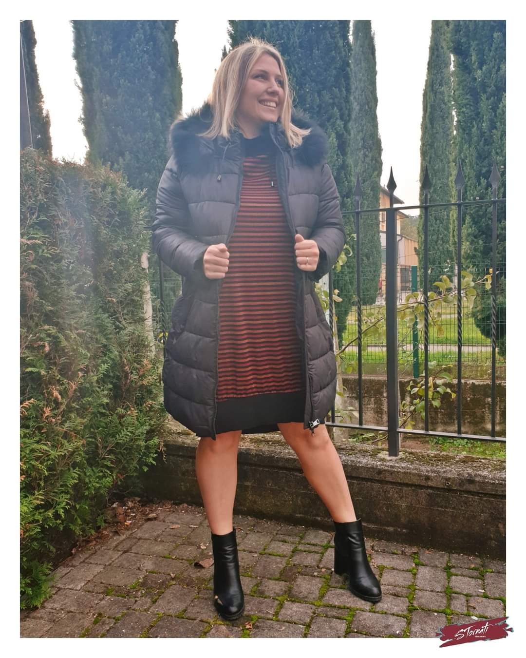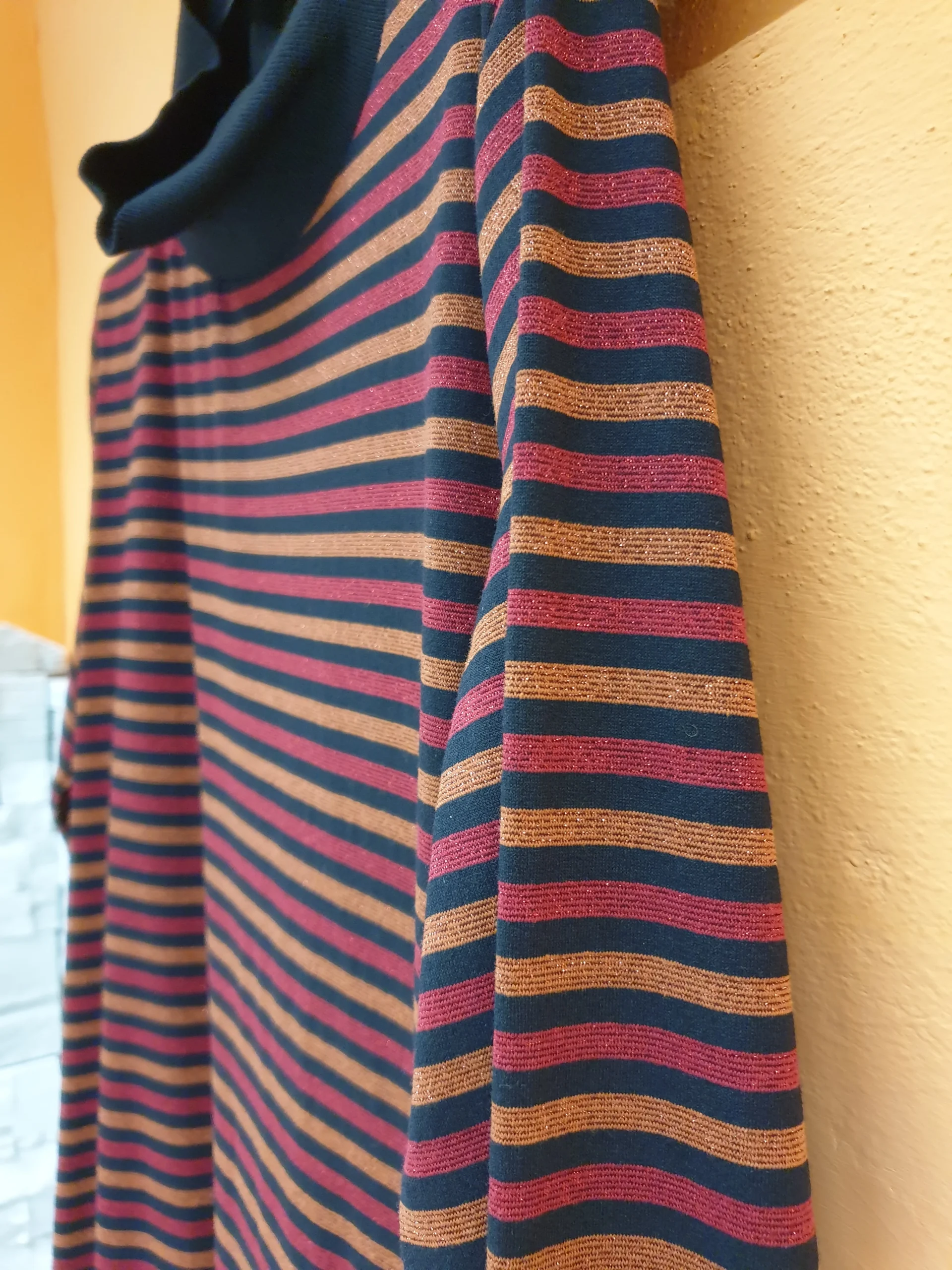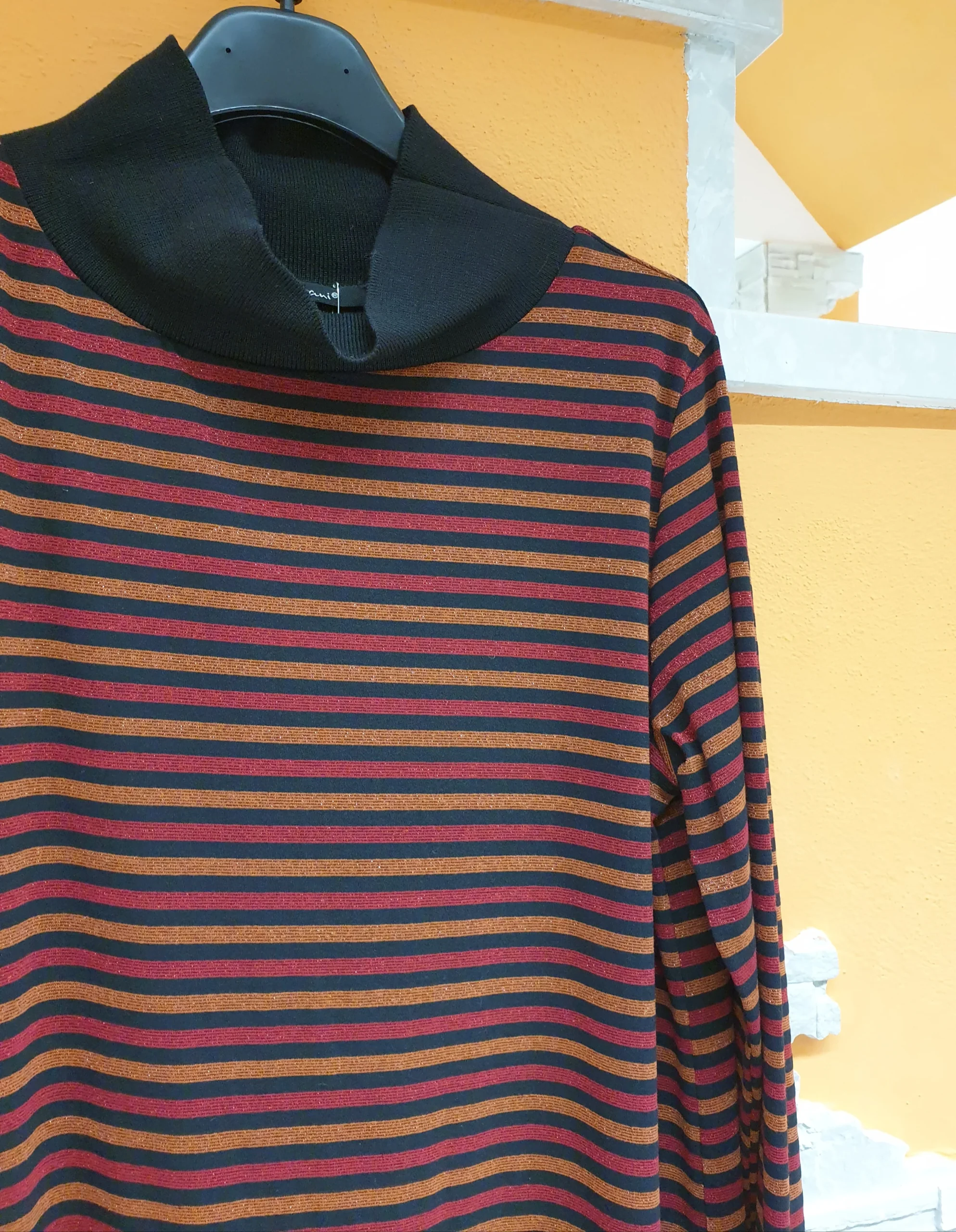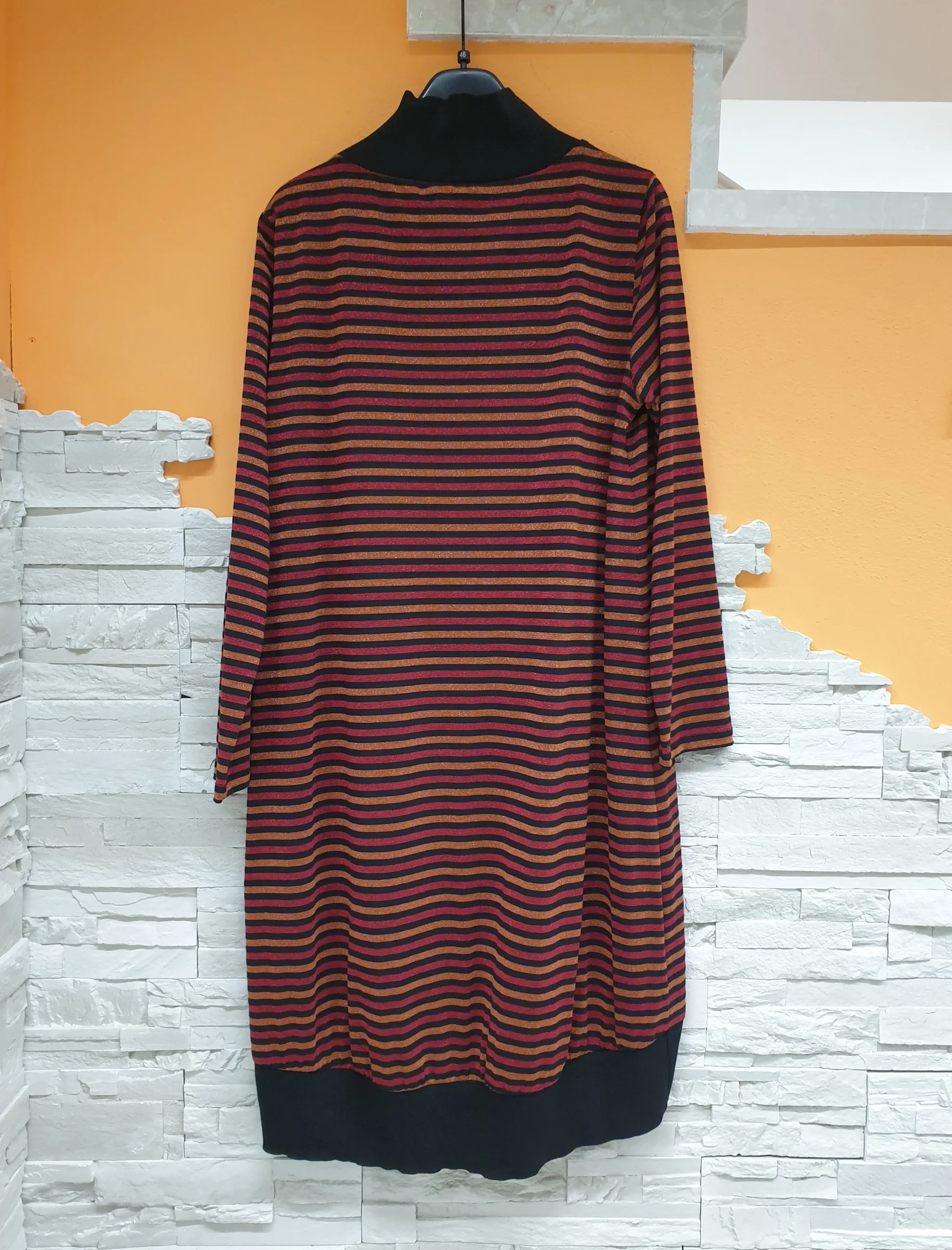 Abito in maglia rigata nero, arancio e rosso con fili lurex, profili tessuto a contrasto nero orlo e collo alto. Vestibilità morbida, ed essendo in maglia elasticizzata è adattabile a più taglie.