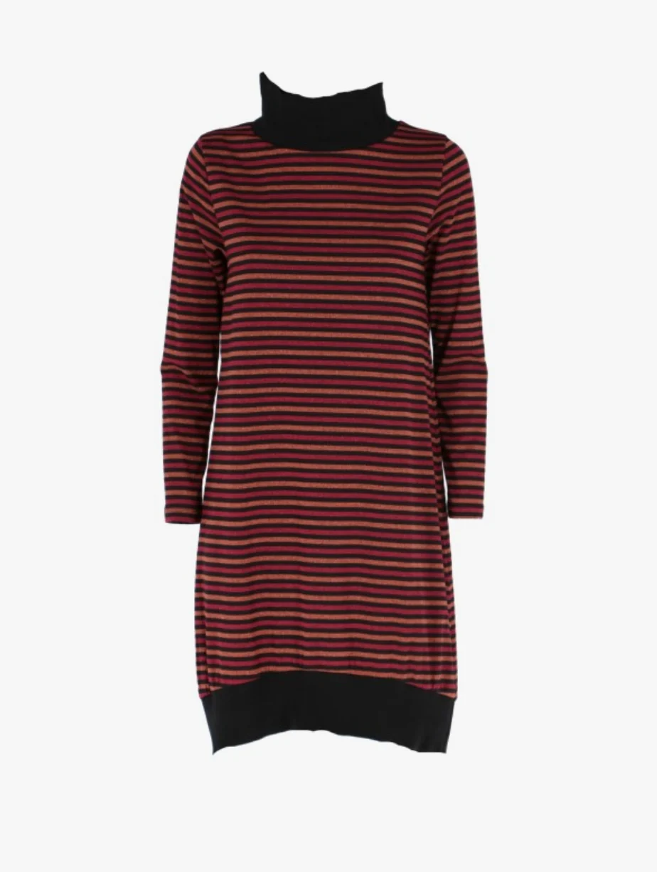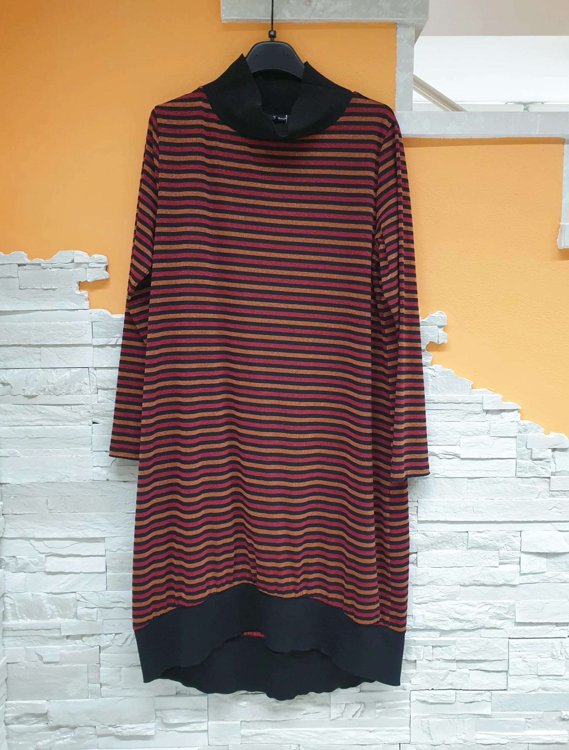 Abito in maglia rigata nero, arancio e rosso con fili lurex, profili tessuto a contrasto nero orlo e collo alto. Vestibilità morbida, ed essendo in maglia elasticizzata è adattabile a più taglie. Composizione: 59% Poliestere 25% Cotone 12% Lurex 4% Elastan MADE IN ITALY