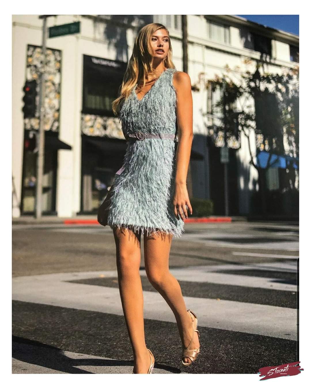 Abito corto effetto piume con fili lurex. Vestibilità a trapezio con banda laterale in grosgrain colore contrasto con zip fino all’orlo, munito di cintura gioiello con strass e fibbia colore silver. Abito foderato con maglina elasticizzata.