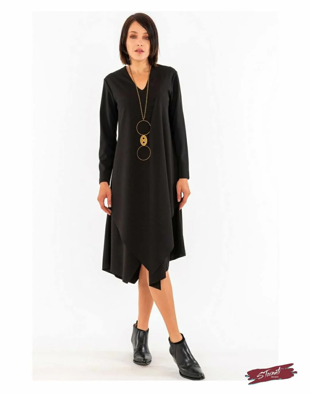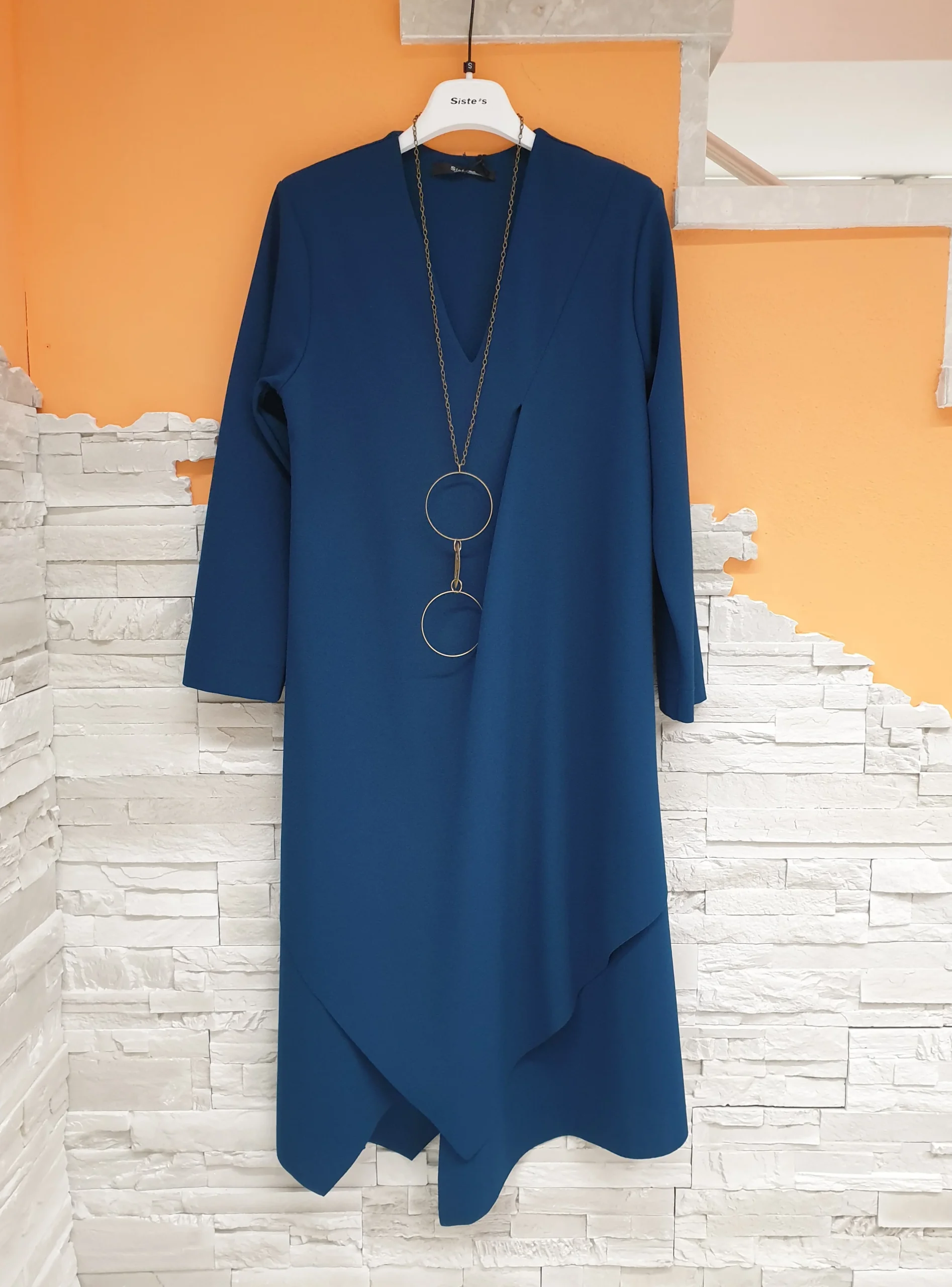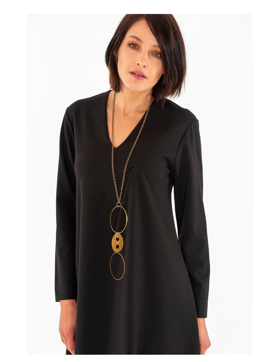Abito ottanio lunghezza midi con maniche a 3/4, pinces vicino allo scollo e punte asimmetriche orlo taglio vivo. Vestibilità leggermente svasata adattabile a diverse fisicità. La collana è compresa con l’abito.