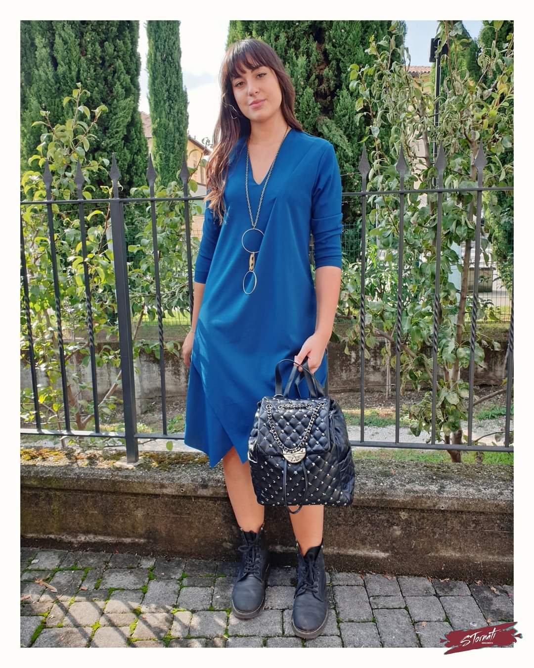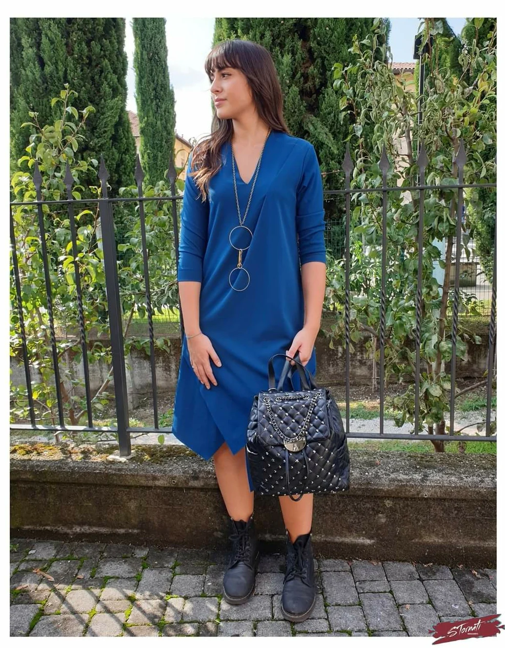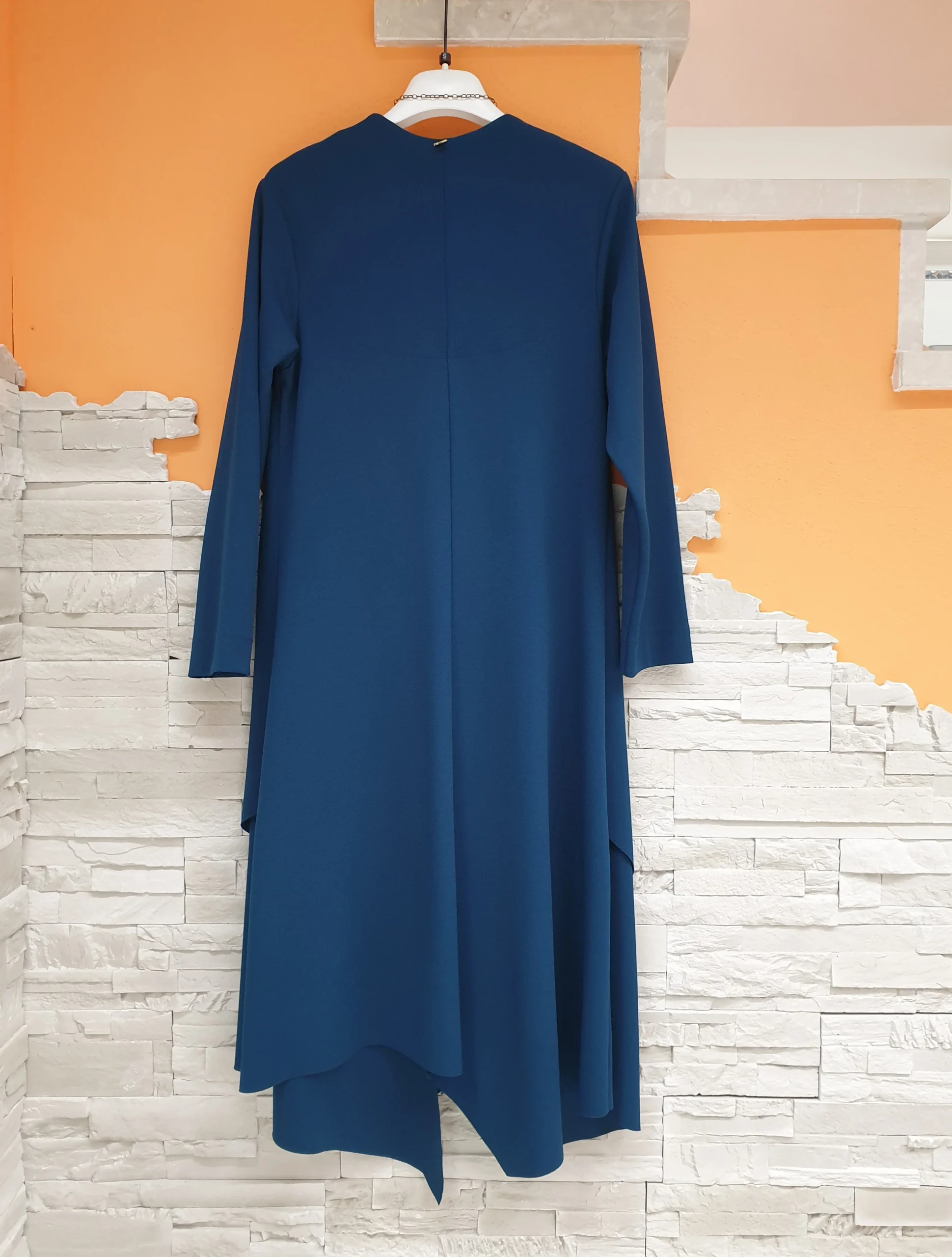 Abito ottanio lunghezza midi con maniche a 3/4, pinces vicino allo scollo e punte asimmetriche orlo taglio vivo. Vestibilità leggermente svasata adattabile a diverse fisicità. La collana è compresa con l’abito.