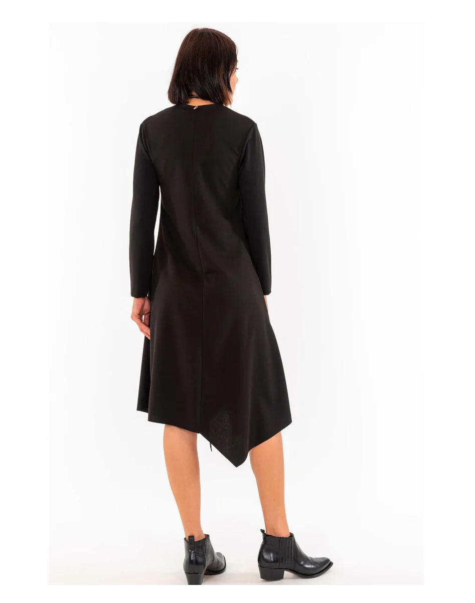 Abito ottanio lunghezza midi con maniche a 3/4, pinces vicino allo scollo e punte asimmetriche orlo taglio vivo. Vestibilità leggermente svasata adattabile a diverse fisicità. La collana è compresa con l’abito. Composizione: 95% Poliestere 5% Elastan MADE IN ITALY