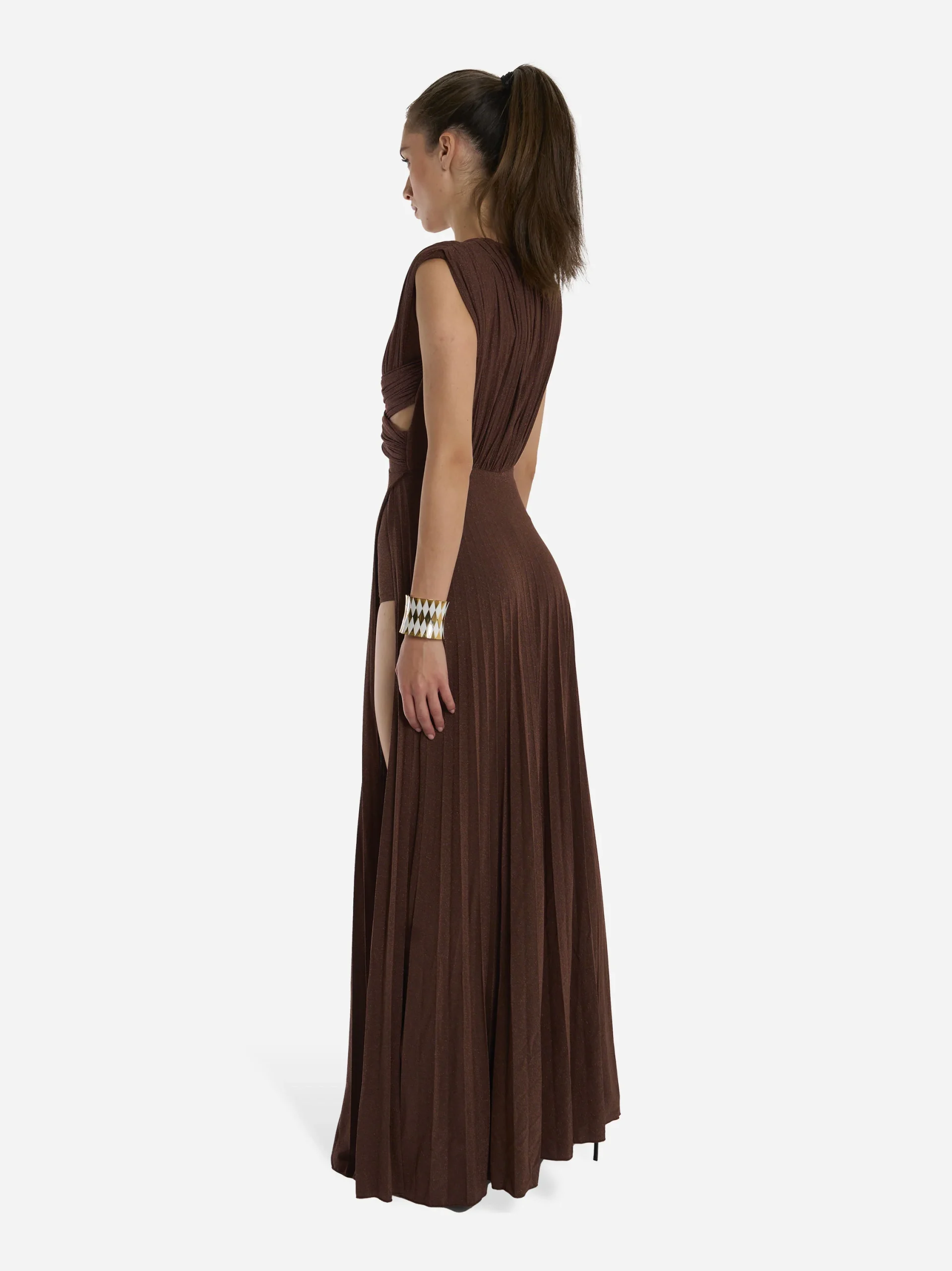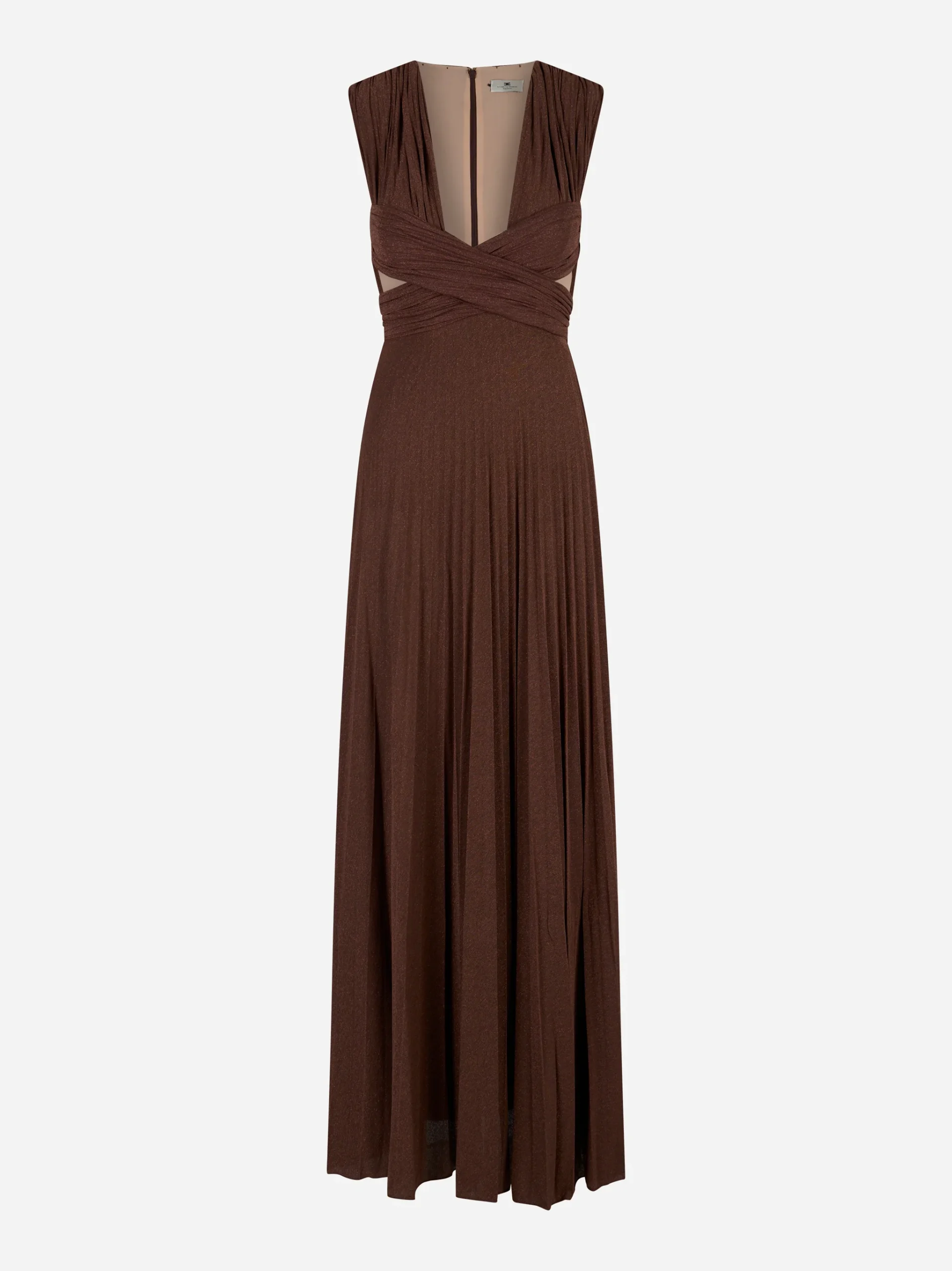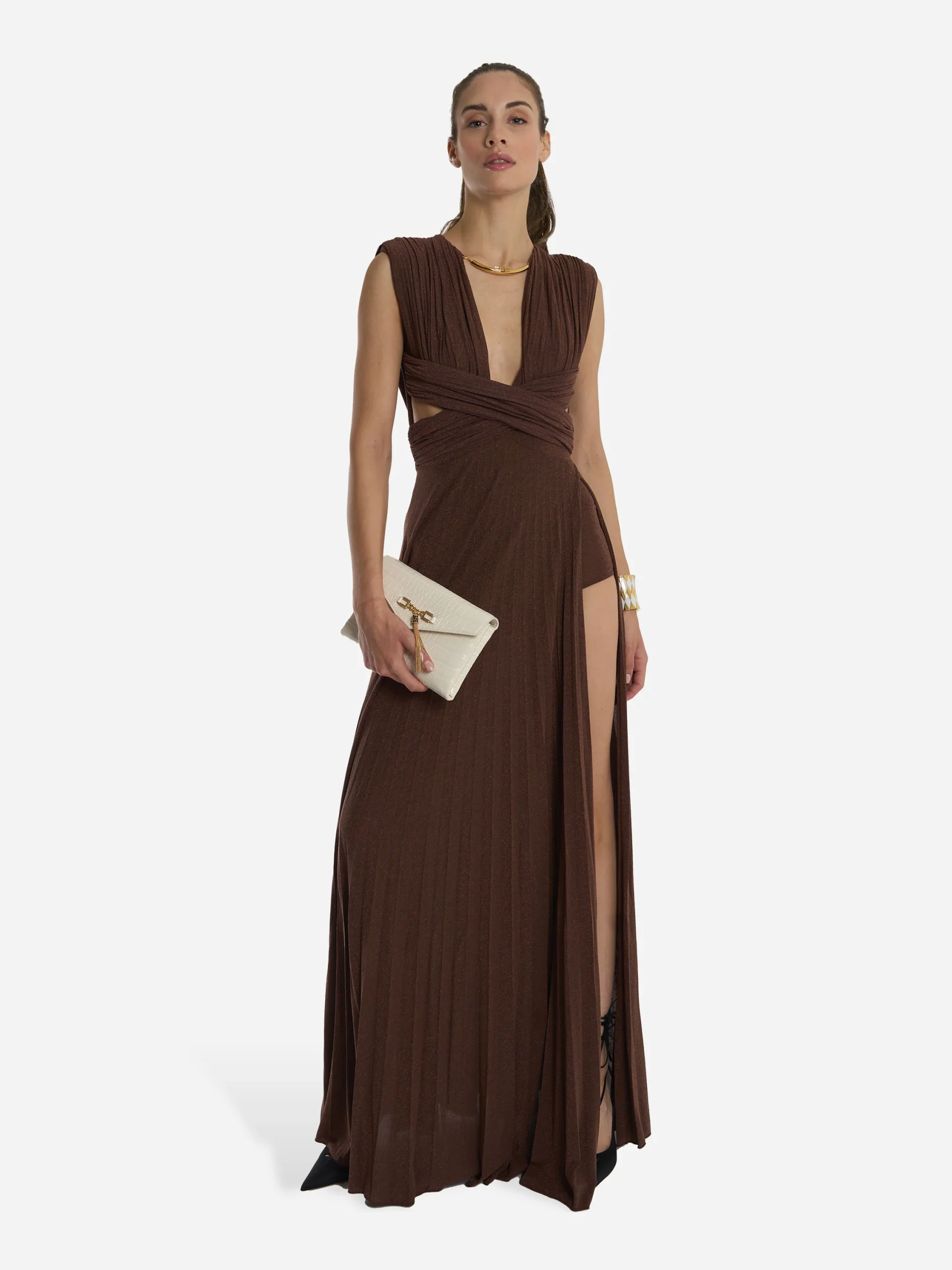 ITEM INFO Abito lungo in jersey lurex color cioccolato Corpino incrociato con profondo scollo a V e dettagli drappeggiati Senza maniche con spalle leggermente arricciate Chiusura posteriore con zip invisibile Gonna lunga plissé effetto fluido Taglio Red Carpet, aderente sul busto e scivolato sui fianchi Dettaglio trasparente nude nella parte anteriore sotto al seno Composizione: […]
