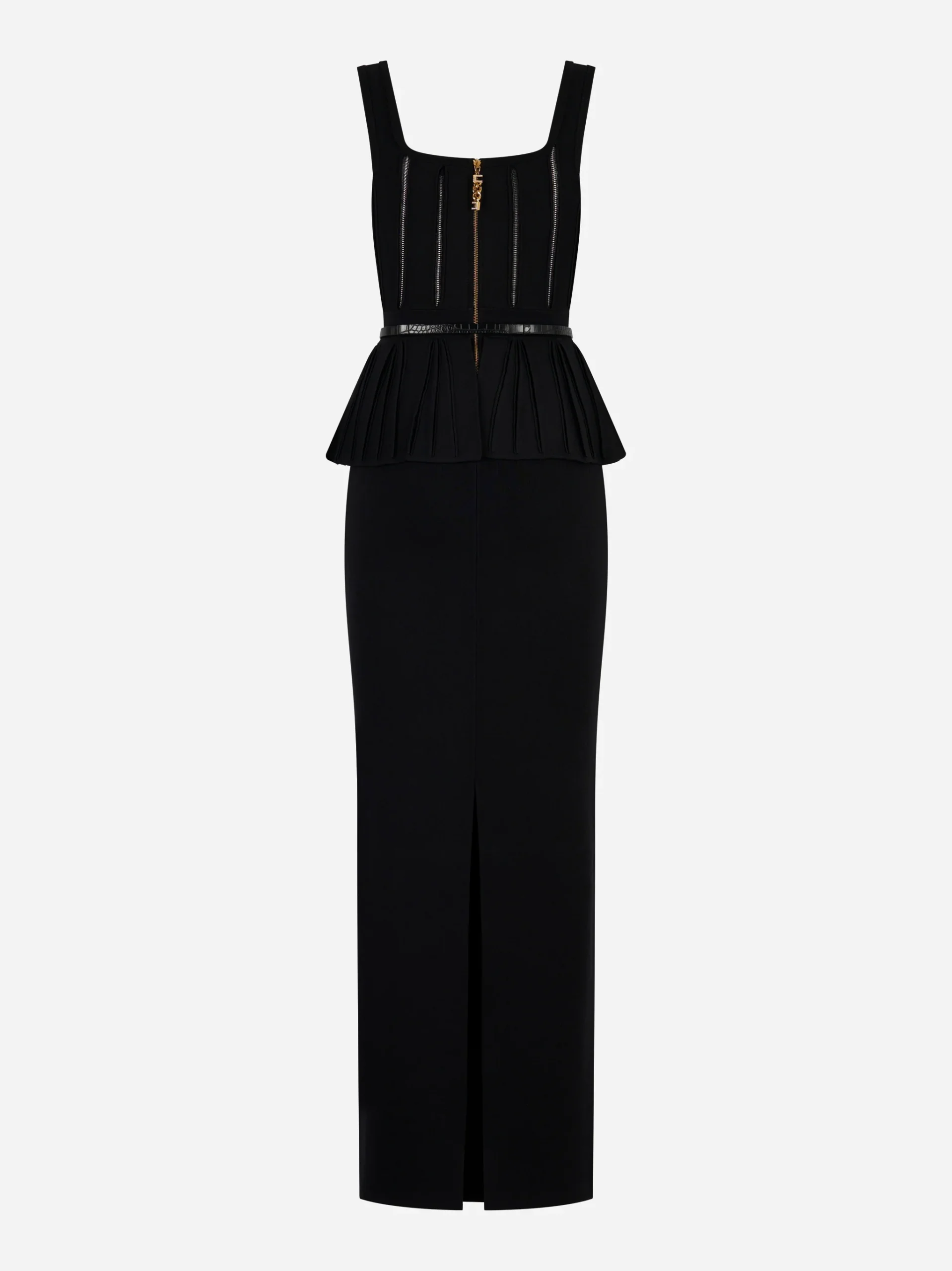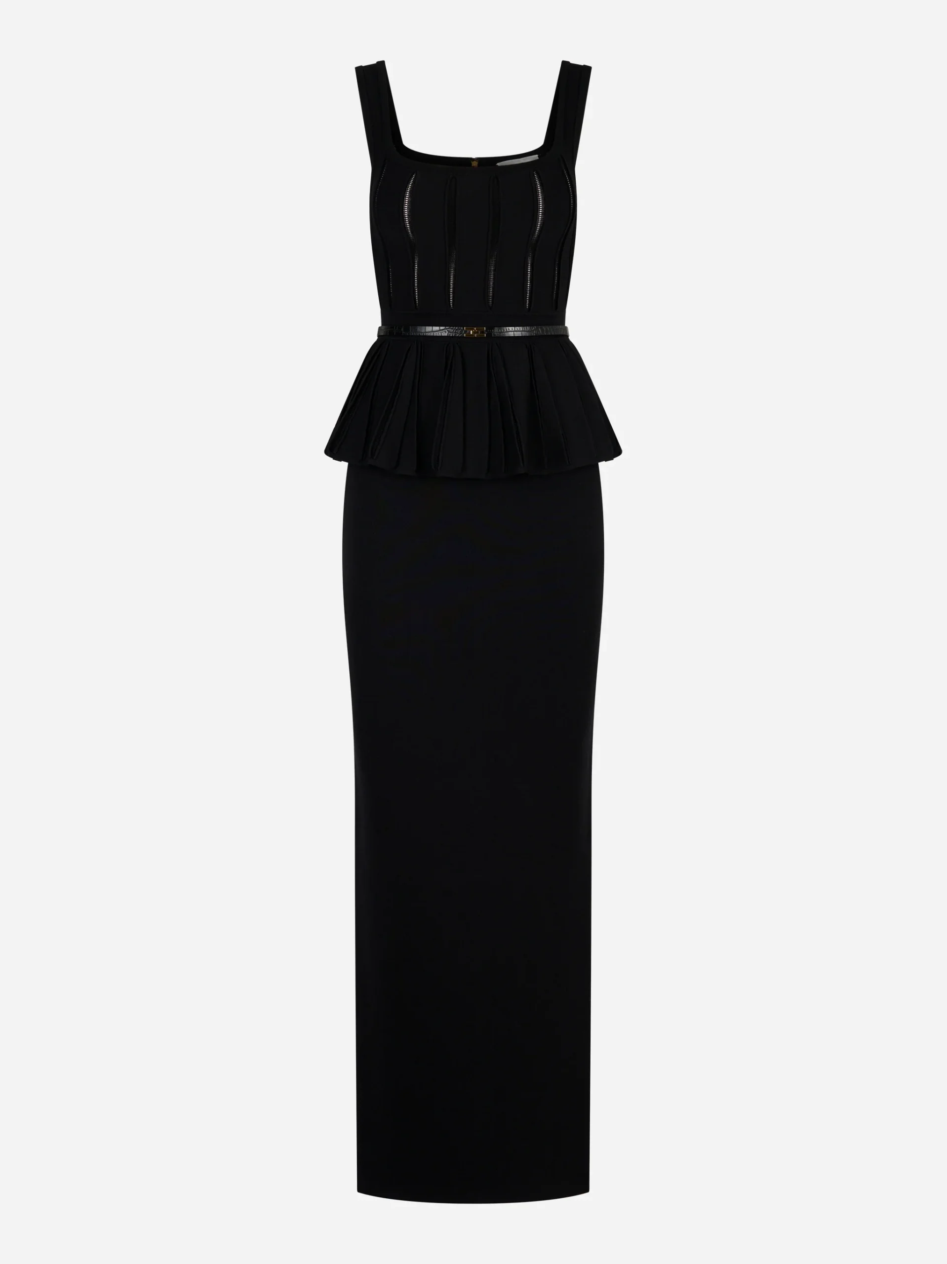 ITEM INFO Abito lungo in maglia stretch nero Corpetto con lavorazioni a costine e trasparenze effetto vedo-non-vedo Baschina plissé strutturata in vita Dettaglio cintura sottile con fibbia dorata logata Chiusura con zip dorata sul retro Spacco centrale posteriore per facilitare il movimento Composizione: 53% Viscosa, 42% Poliammide, 5% Poliestere Made in Italy TAGLIA E VESTIBILITÀ […]
