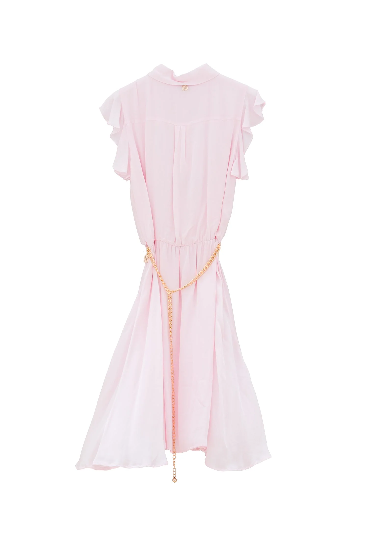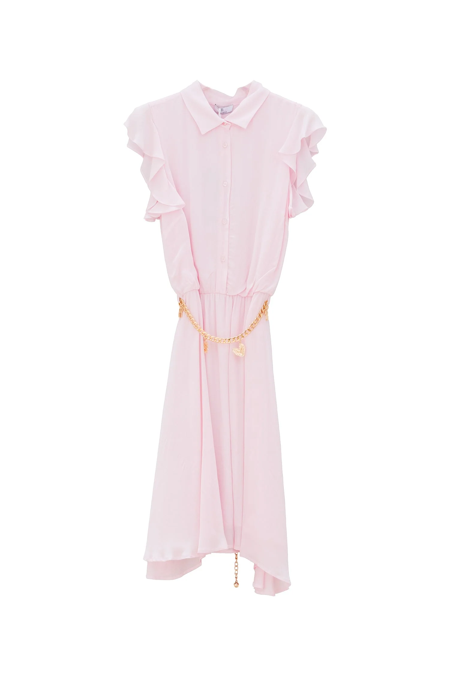 Abito regular chemisier midi con seta, colletto classico, bottoni centrali per apertura, cintura in vita in catena, e con gale sul giromanica.