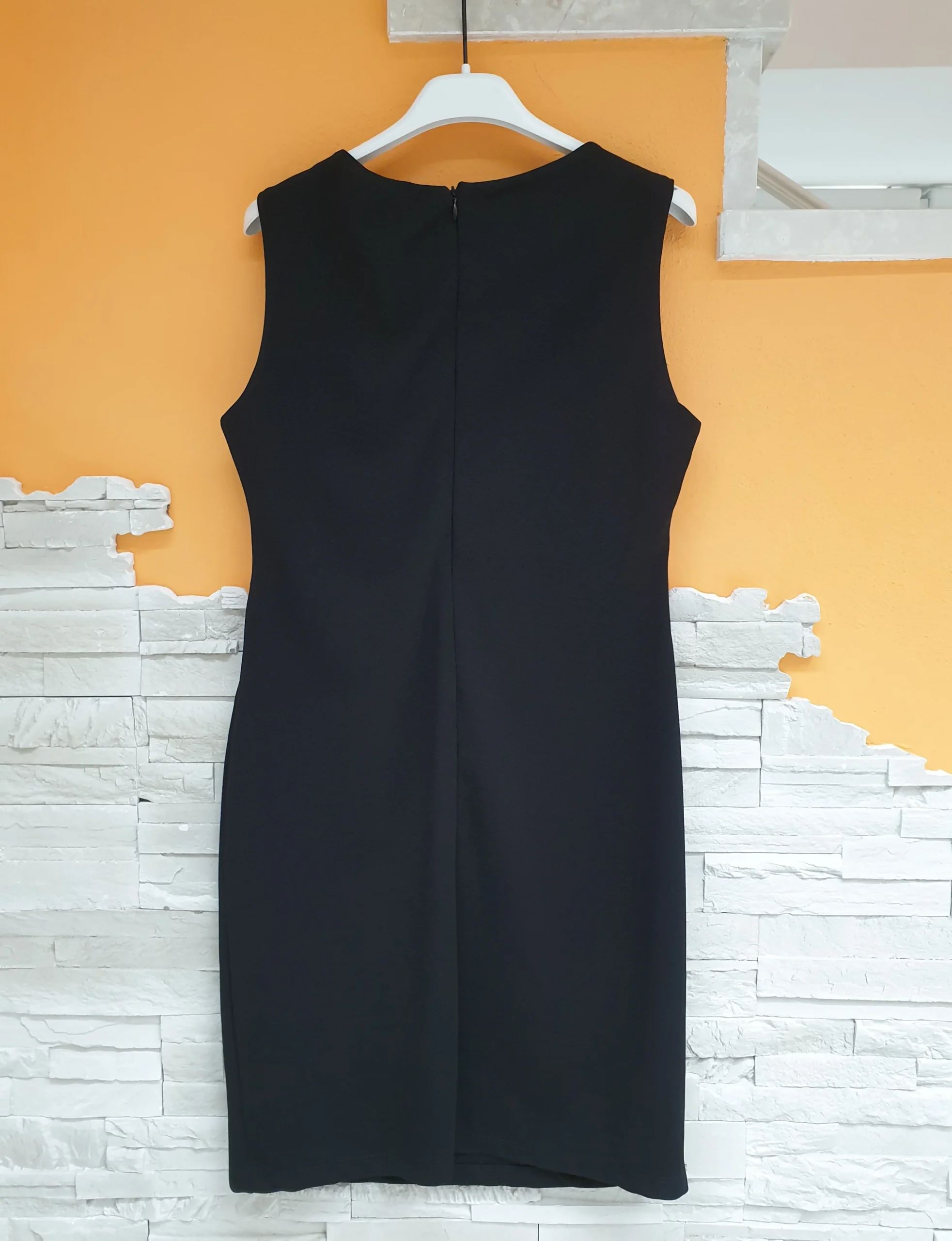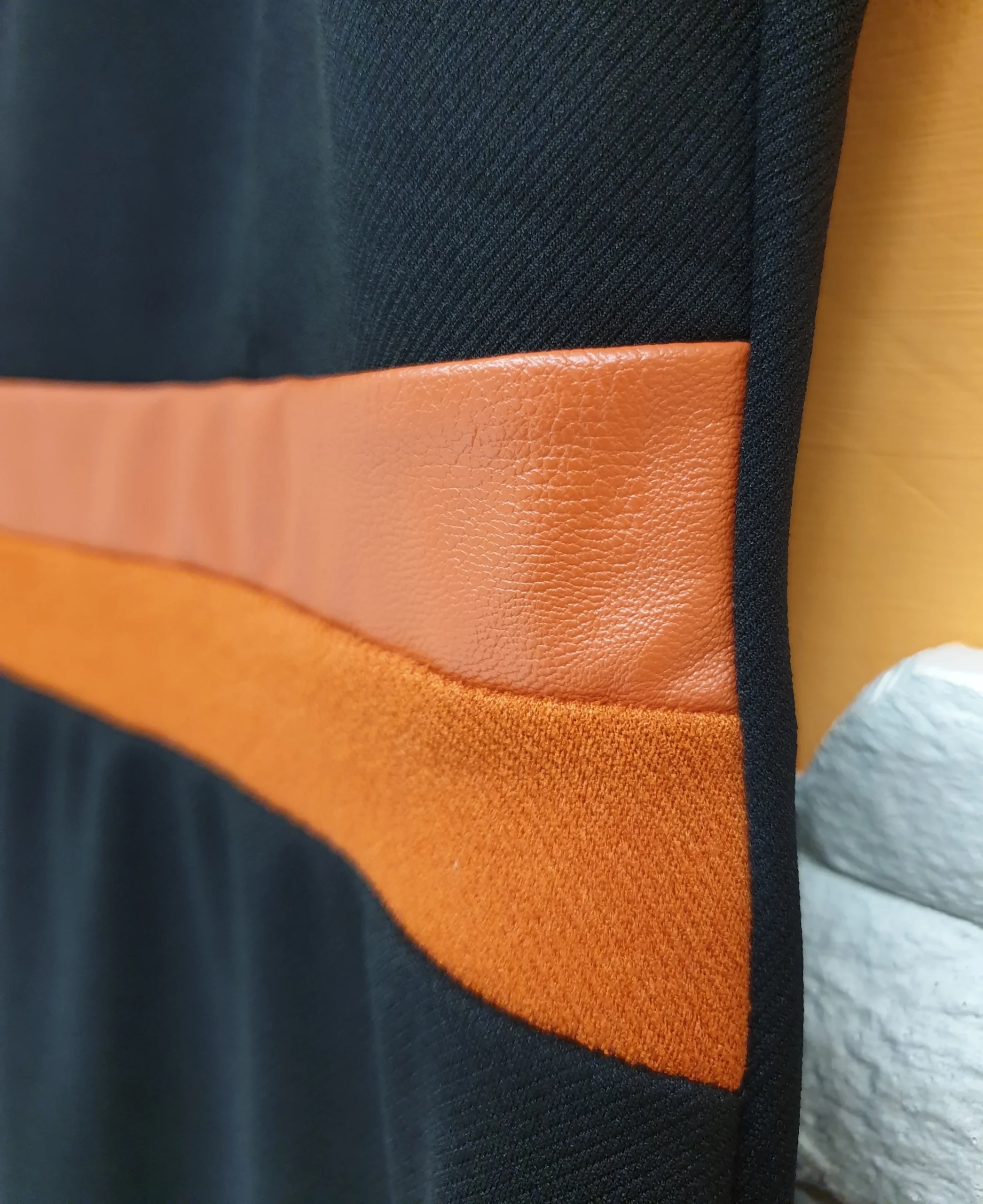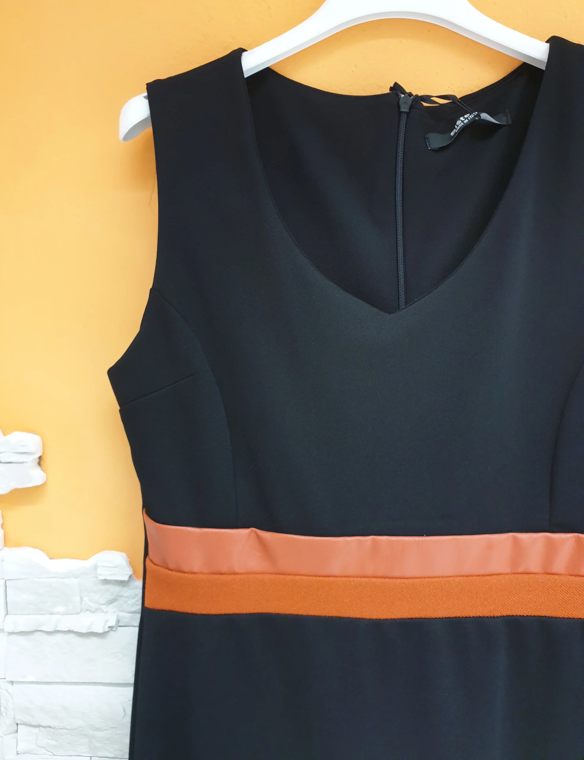 Abito tubino smanicato scollo V nero con fascia bi tessuto arancio in vita. Tessuto elasticizzato con chiusura zip sul retro.