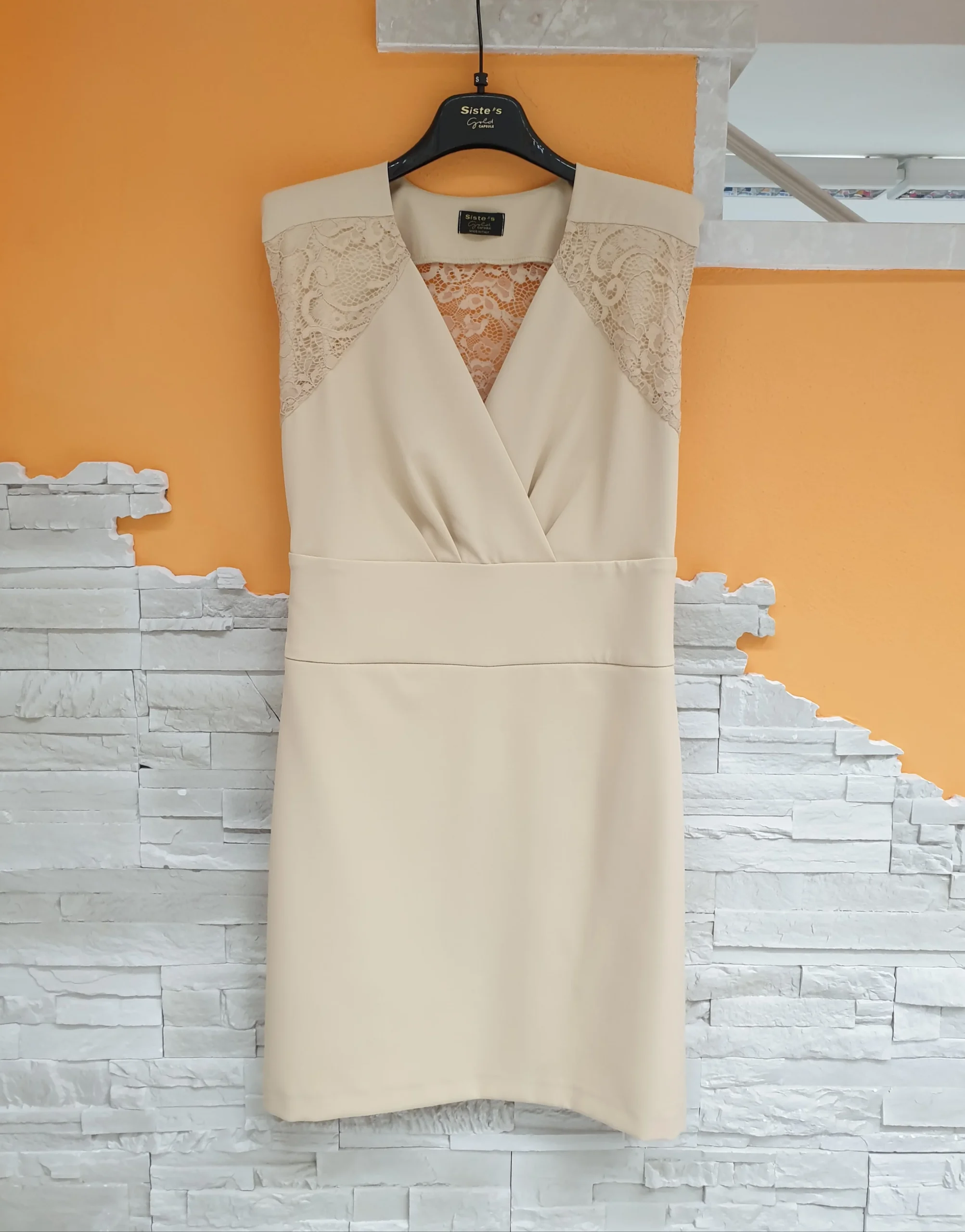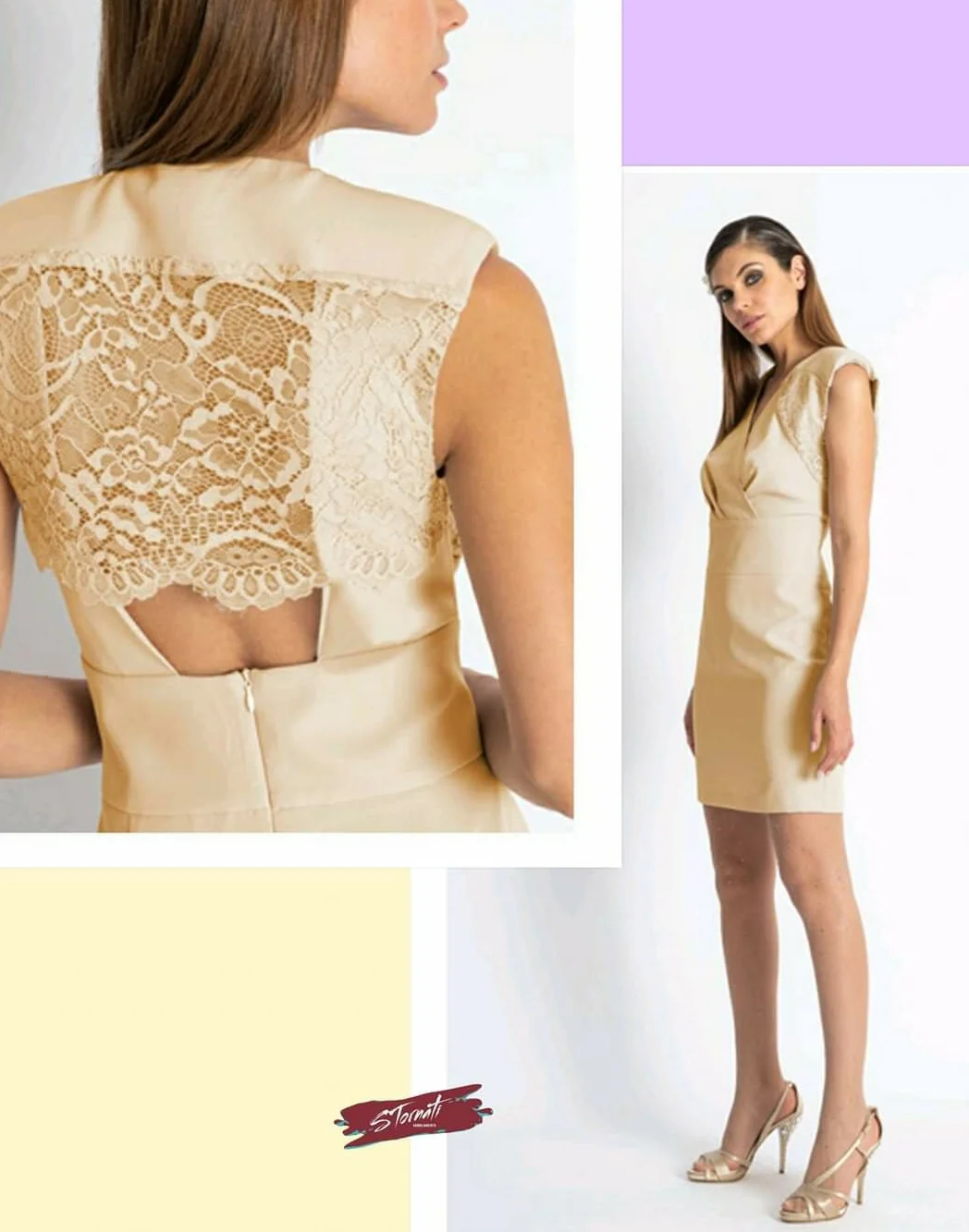 Abito a tubino spalla larga con spalline, scollo V ad incrocio, arricciatura sotto il seno e cucitura in vita. Retro con oblò schiena e inserto pizzo, chiusura con zip.