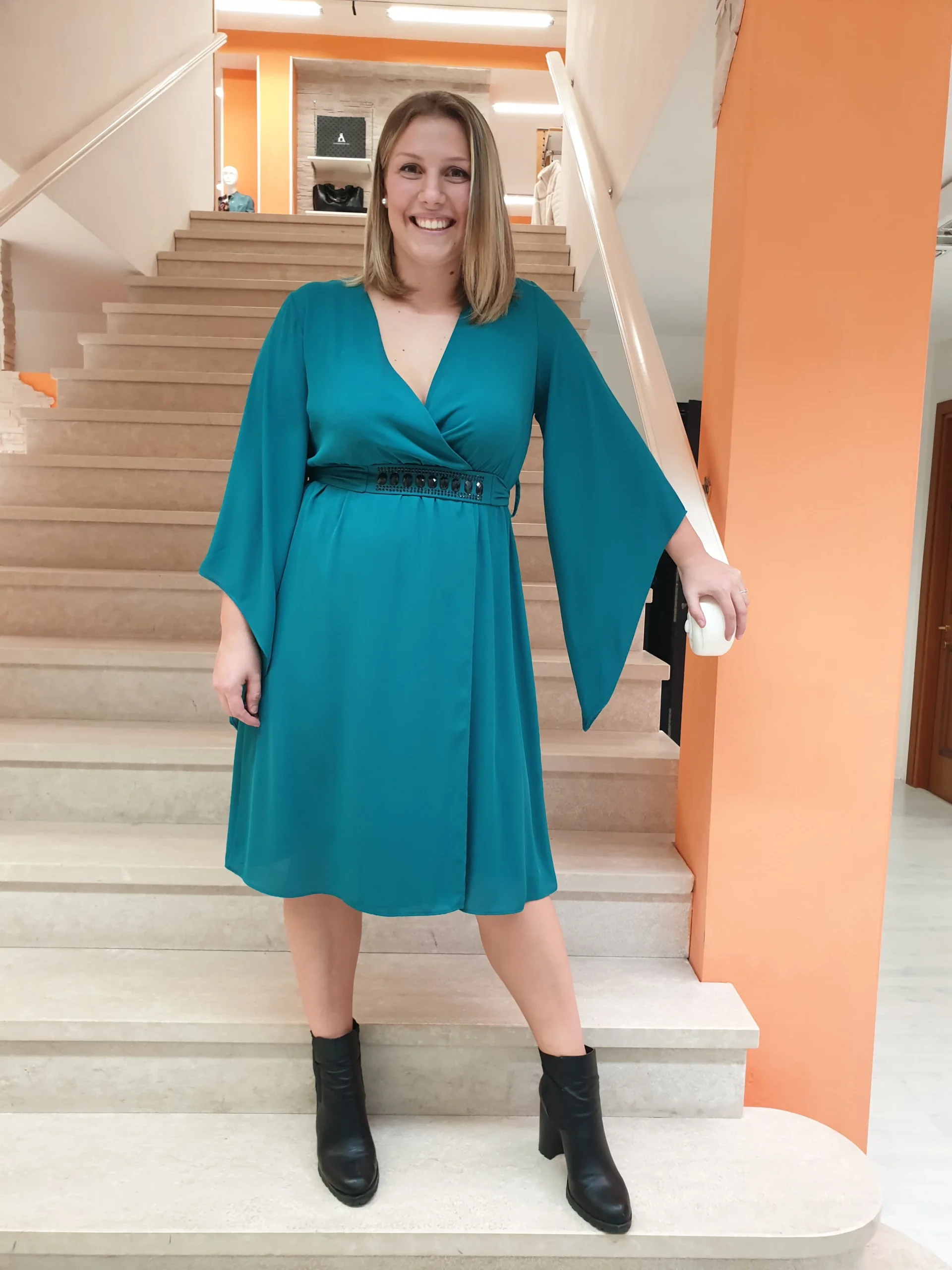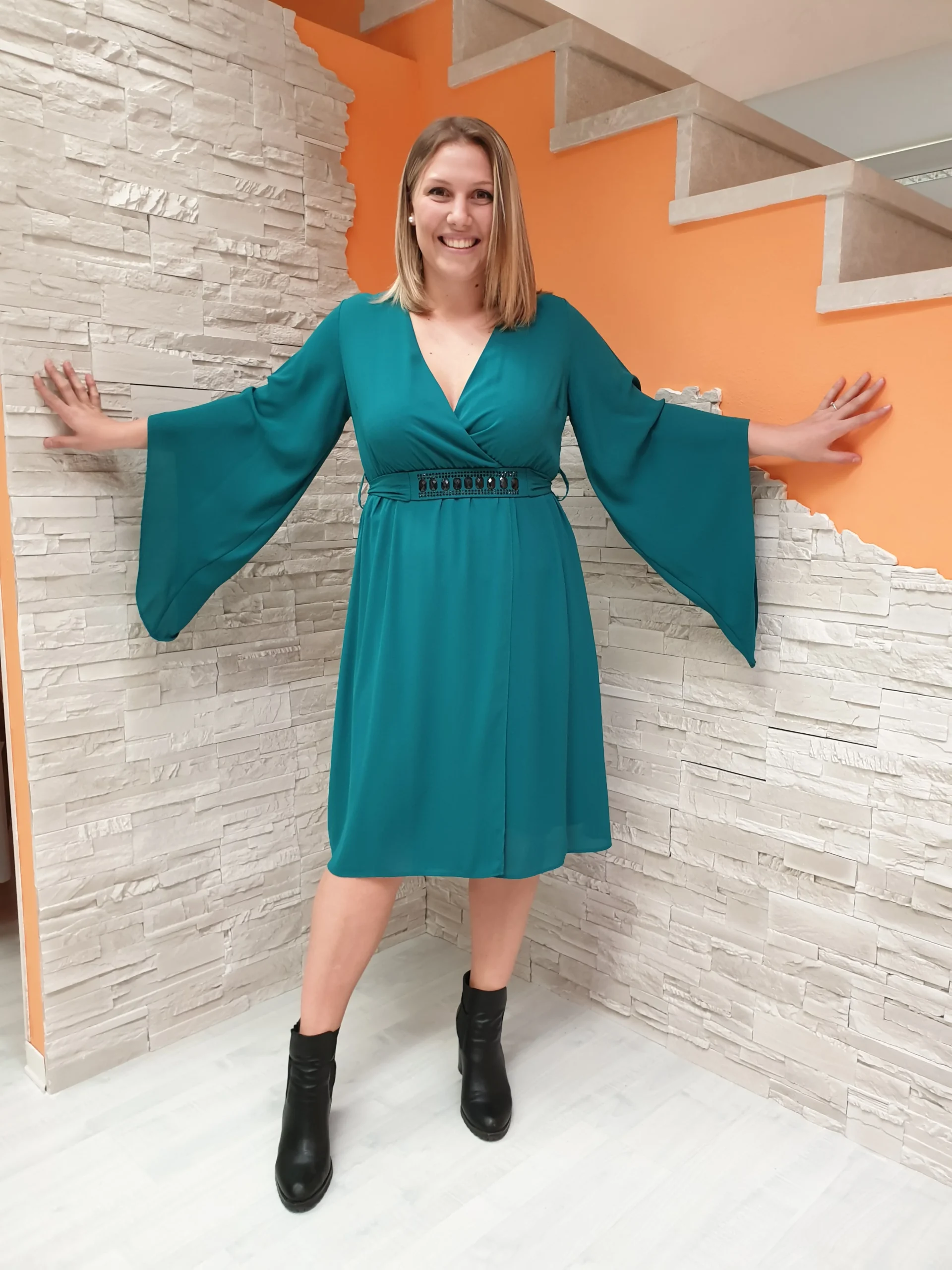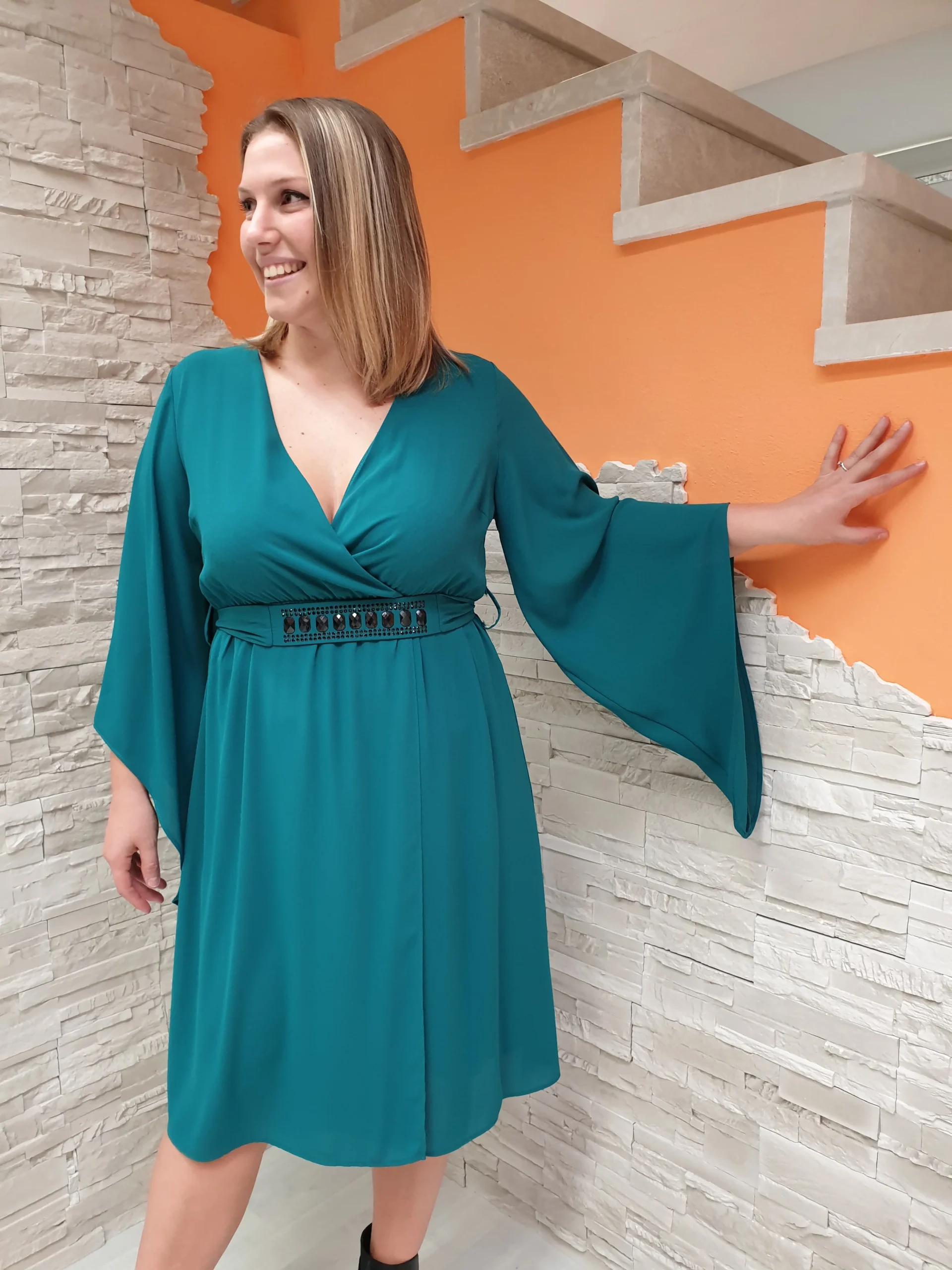 Abito voile turchese con scollatura ad incrocio, maniche a punta e fusciacca gioiello.