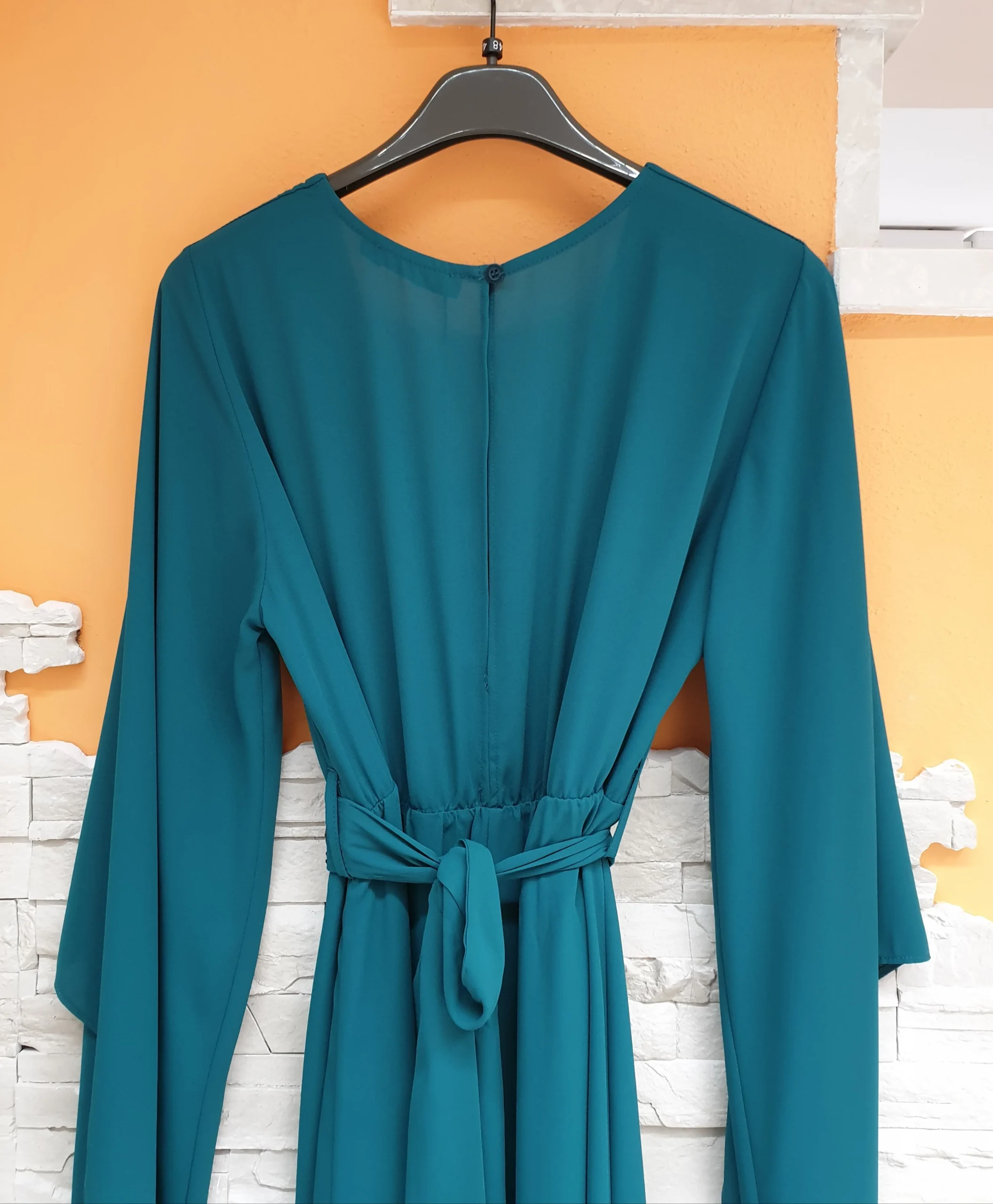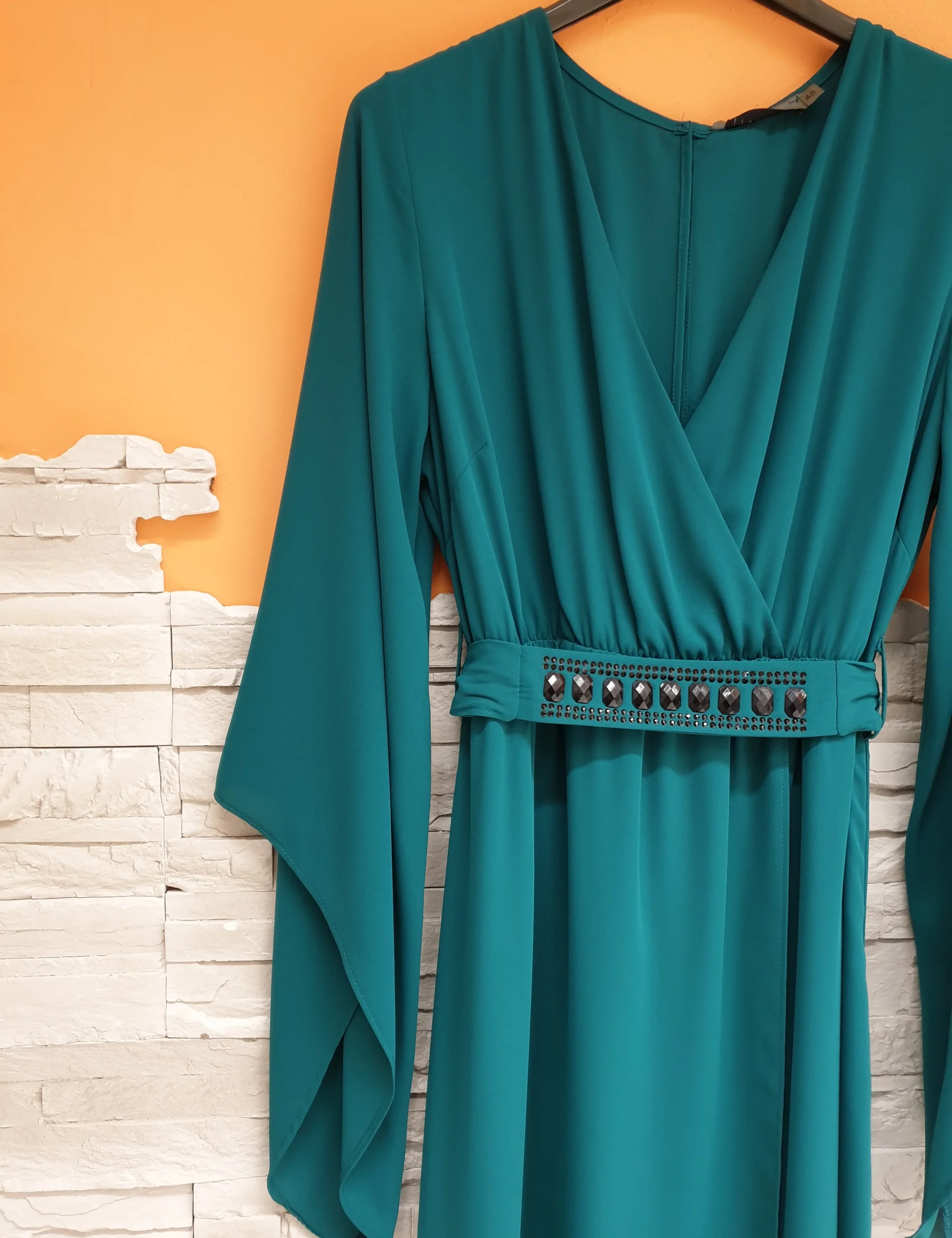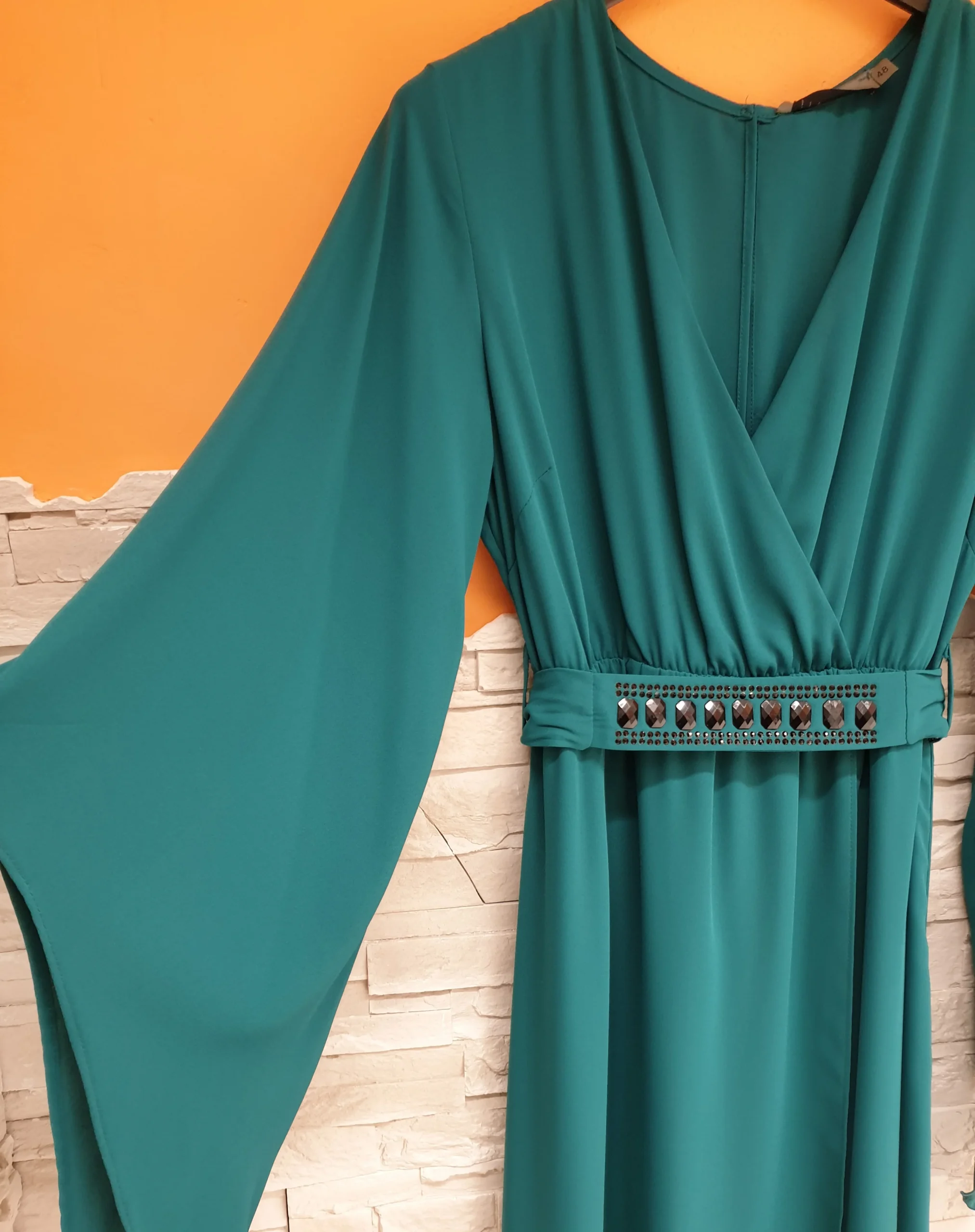 Abito voile turchese con scollatura ad incrocio, maniche a punta e fusciacca gioiello. Composizione: