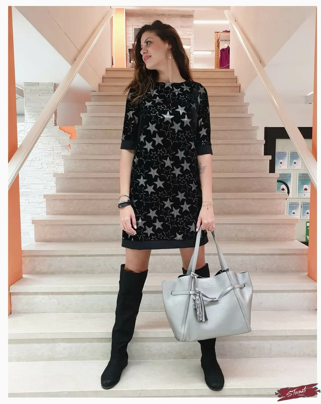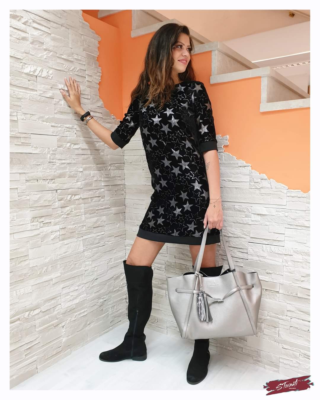 Abito velluto con stelle lurex silver. Manica al gomito e lunghezza sopra il ginocchio con inserti voile. La modella in foto indossa la tg.42 ed è alta 1.80 m. Composizione: 100% Acrilica Contrasto: 95% Poliestere, 5% Elastan MADE IN ITALY